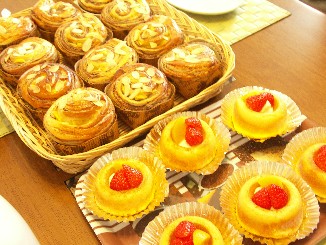 今日は中級クラスの教室です。初めて午後からのスタート子供達の成長によって、働かれる生徒さんも増えてきて・・・それでも皆さん、都合をつけて教室にきてくださいます。感謝、感謝です5年後には夜のクラスも出来たりして 午後からなので、準備をのんびりしてしまい(途中、草なぎ君のニュースで手がとまり)段取り悪いスタートになってしまいました。なんとか、焼き上がりましたよ今日のメニューは「チョコマロン」チョコシートをパン生地で包み何層にも折り込んだチョコ生地をめん棒で伸ばしながら作ります。この生地を大きくシート状に伸ばし、栗の甘露煮を薄くスライスしたものを生地にのせてロール状に巻き込みます。チョコとマロンが贅沢な味わいです!「サバラン」ラム酒がタップリ入った甘いシロップに焼き上がったサバランを浸してシロップをしみ込ませます。シロップを吸い込んだパン生地はひとまわり大きくふくらんで重くなります。クリームとフルーツを彩りよく飾って仕上げます。お楽しみメニュー「なまのキャラメル」です。今日もとっても美味しく頂きました~でも、4時頃の試食は太るかも夕食は少なめにしましょうね