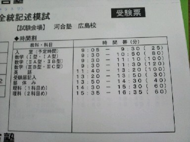 高三の娘は今週も模試ですもう一ヶ月は模試三昧が続いているでしょうか。まだ11月いっぱいは毎週模試が続くようです。学校側も校内で受ける模試だけでは本番のセンター試験で緊張するだろうからといろんな模試を受けるようにと勧めています今日は広島駅前にある河合塾が会場です。よく、時間を確認して出掛けていきました。。。。。が、です。嫌な予感「母さん、受験票を間違えて持ってきたS駅まで持ってきて~」「え~、何しょうるん」と、怒りましたが「間に合わなかったら、入室させてもらえないから家に帰ります」と、娘。「4000円近く払わなかった?すぐに持っていくわ」をぶっ飛ばしてS駅に向かいました。あと、2.3分で着きそうな頃またが・・・「友達に聞いたら、受験票なくても受けられるみたい。今なら入室時間に間に合うから行くね~」と、娘。今日も娘に振り回されています。今回の事で懲りて、本番ではきっと受験票は忘れないでしょう・・・ね一応、家に着いて受験票を写メールしました。受験番号・名前の部分と時間割の部分最近の受験生は大変ですね。元旦と2日も模試があるらしいです~