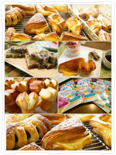 今日は上級クラスの教室ですメニューは「デニッシュペストリー」「ビスキーロール」お楽しみメニューは「マメ カルテット」でした今日もお持ち帰りパンの個数合わせの為、デニッシュペストリーを2単位作りました。ビスキーロールと合わせ鉄板を冷蔵庫に3枚入れないといけません。なのに冷蔵庫はパンパンパパのクーラーをこっそり借りて冷蔵庫のものを移しましたよ。(パパは釣り用クーラー6個持ってて・・・それだけで倉庫はいっぱいかも)これで大丈夫今日は生徒さんにロールインからすべてしていただきました。今日は暖かいので心配しましたが・・・上手にできましたよきっと、おうちでも大丈夫です。がんばってくださいね~ 「花王ビオレu × クスパ」 コラボレーション企画 で「ビオレuアロマタイム」を配付させていただいてます。 個数が足りないので全員にはお配りできません。ご了承くださいね