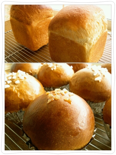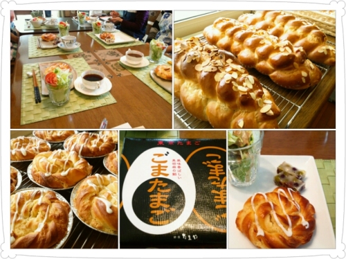 今日は上級クラスの教室ですメニューは「カントリーフェアー」大きな三つ編みと小さな三つ編みを重ねて仕上げています。なのに・・・生地はとても美味しくフワフワに仕上がります。今日はレタス・ハムをサンドしていただきました。「デニッシュロール」無塩バター、砂糖、卵、ラム酒、アーモンドプードル、薄力粉、スライスアーモンドを混ぜて板状にしたフィリングを大きく伸ばした生地で包んで、ひも状にカットし、ツイストさせて丸く成型しています。今日は2単位作りましたよ。皆さん、先月の折り込みのデニッシュと比べ・・・これなら作れそうって、お楽しみメニューは「マメ カルテット」でした近所のYさん、お子様の発熱でお休みに・・・・でもでも、近所なので成型時だけ来ていただきました。あと、未講習は3つ。デニッシュロールは暖かい時期は難しいので来年まで卒業できなくなりますからね