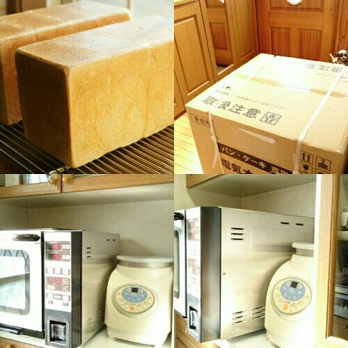 先日、福岡まで講習を受けに行き、衝動買いしたパン、ケーキ用オーブン(電気)が届きました。 「箱がデガッ!」 主人が帰宅して設置してもらいましたが、33キロもあり、ブーブーでした。 脚がギリギリ乗っかってる状態。夏にリホームを控えてるので、とりあえずここに設置してもらいましたが、圧迫感が半端ない… 台所を整理したくなりましたが、とりあえず明日の教室に備え、プルマンを焼いてみました。 普通の電気オーブンでは、一本しか焼いたことないけど、綺麗に二本焼き出来ましたよ。 食べるのも楽しみです♥