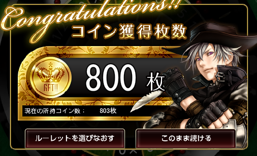 最近、狩りたのしーw →30分経過 →飽きてきた・・・→次のプレイ時 →狩りたのしーw 以下ループを繰り返してます。変化が必要と思って、と言うか投げやり気味にはらはらルーレット回したら↓10倍当たった嬉しい。