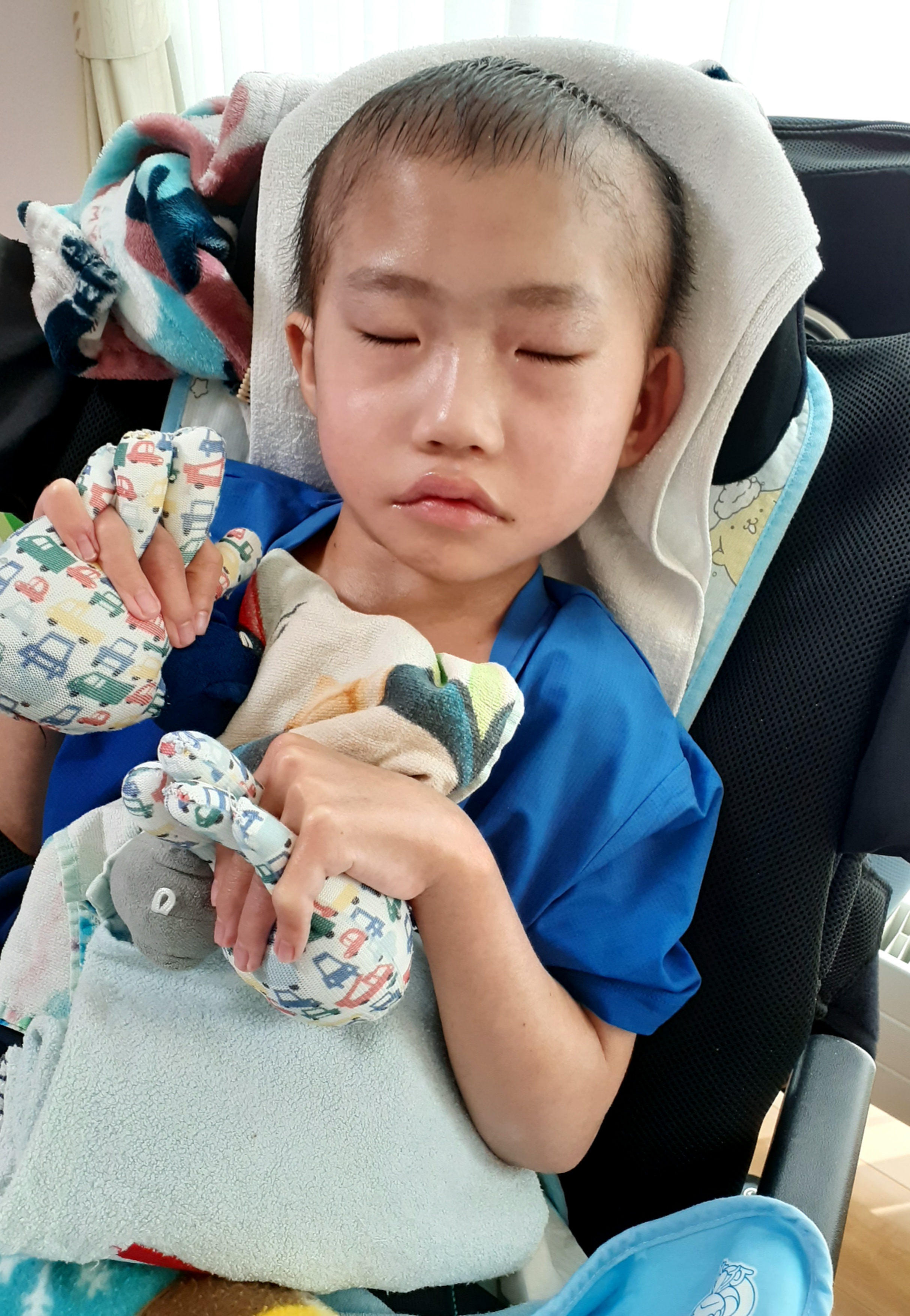 ~9歳長男🐻(小4)~昨日は、定期受診日🏥だった長男🐻一瞬は寝てましたが、ずっと機嫌が悪かったー😢採血、リハビリ、診察、予防接種、胃ろう交換、歯科、皮膚科、側弯外来を受診しました。身長 128㎝体重 23.4kg身長も体重も少しずつ増えてます😊👨⚕️診察👨⚕️大学病院の先生「採血も問題ないね!予防接種も随時していきましょう👍今後だけど、予防接種が一段落したら、血液外来は次男🐒さんと同じように3ヶ月に1回の診察にしていきましょう。」ということで血液外来は一段落し、今後は3ヶ月に1回受診することになりました👍移植治療に関わる薬もステロイドも終了し、症状が安定してきたからですね😃一時期は、皮膚の落屑がひどくボロボロだったり、GVHD症状に悩まされていましたが……。本当に落ち着きましたね😢先生に毎月会えなくなるのは寂しくなりますが、元気になってきた証拠です😄大学病院の先生の診察がない月は地元病院の主治医の先生にお薬処方や胃ろう交換をお願いし、神経の先生にボトックス注射や筋緊張のお薬の調整をしていただくことになります!予防接種(5種混合)と胃ろう交換も無事に終わりました👍🦷歯科🦷先生「左上の大人の歯が生えてきてる。こどもの歯もぐらついてる。あと左下のこどもの歯も斜めになってるから、徐々にぐらついてくるかも👀。来月また経過を見ましょう!」抜けた乳歯の誤飲に注意したいと思います😣🦴側弯外来🦴レントゲンとCTを撮りました。先生「泣いて突っ張っていたこともあるけど、側弯がかなり強い。装具が実用的な感じではないし……。肺を圧迫しているわけではないから手術が必要な感じでもない。このまま経過をみるしかないかな。12月に大学病院の側弯専門の先生がきてくれるから見てもらいましょう。」ということで側弯に対しては経過観察です😣受診中はかなり機嫌が悪かった長男🐻😭朝8時に家を出て、帰ってきたのは夕方です……。疲れたねぇ😣みんなヘロヘロでした😓次回は、10月22日 ボトックス注射予定11月5日 定期受診予定頑張ったね💪お疲れ様😌