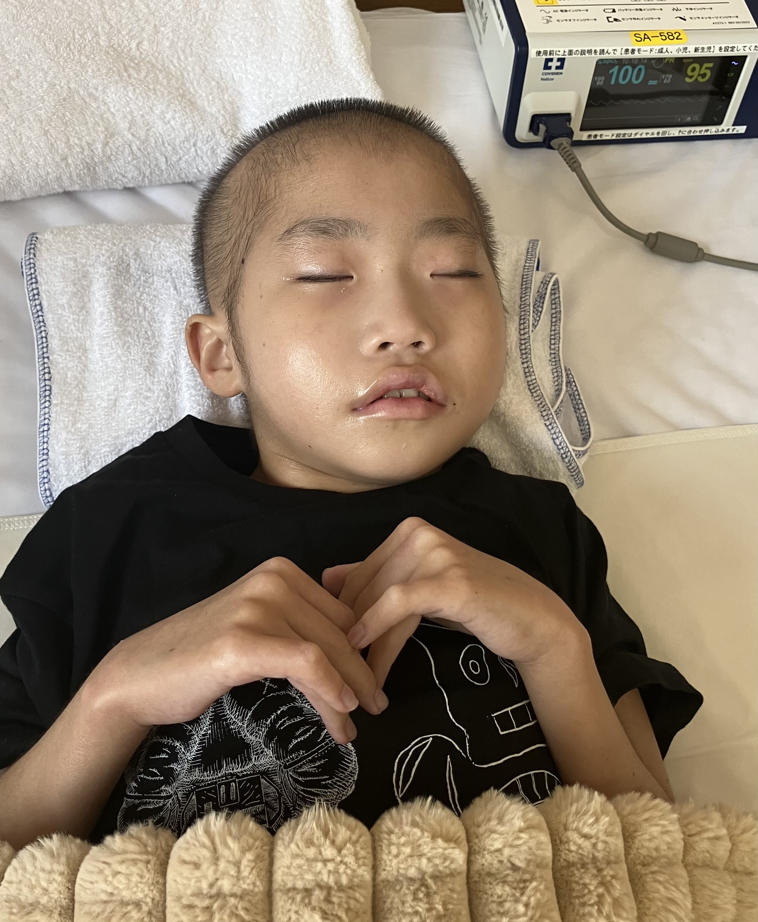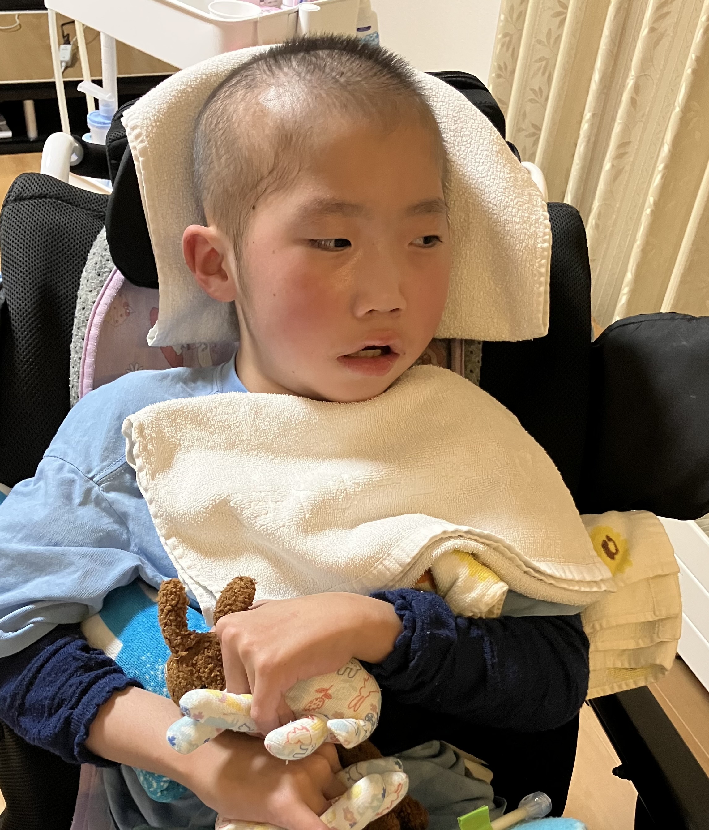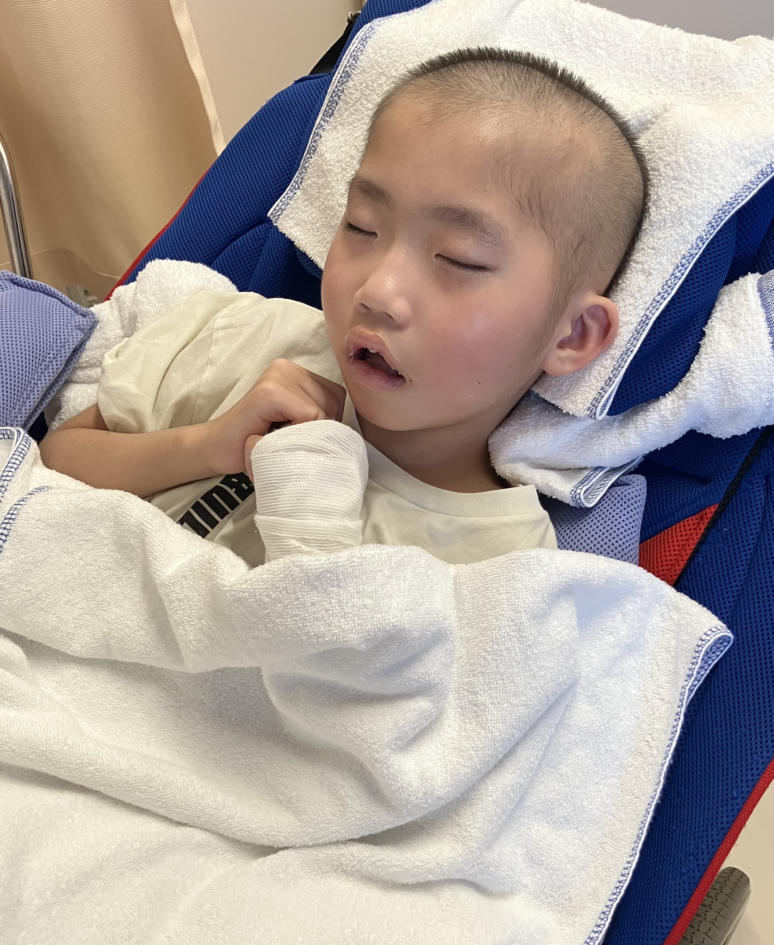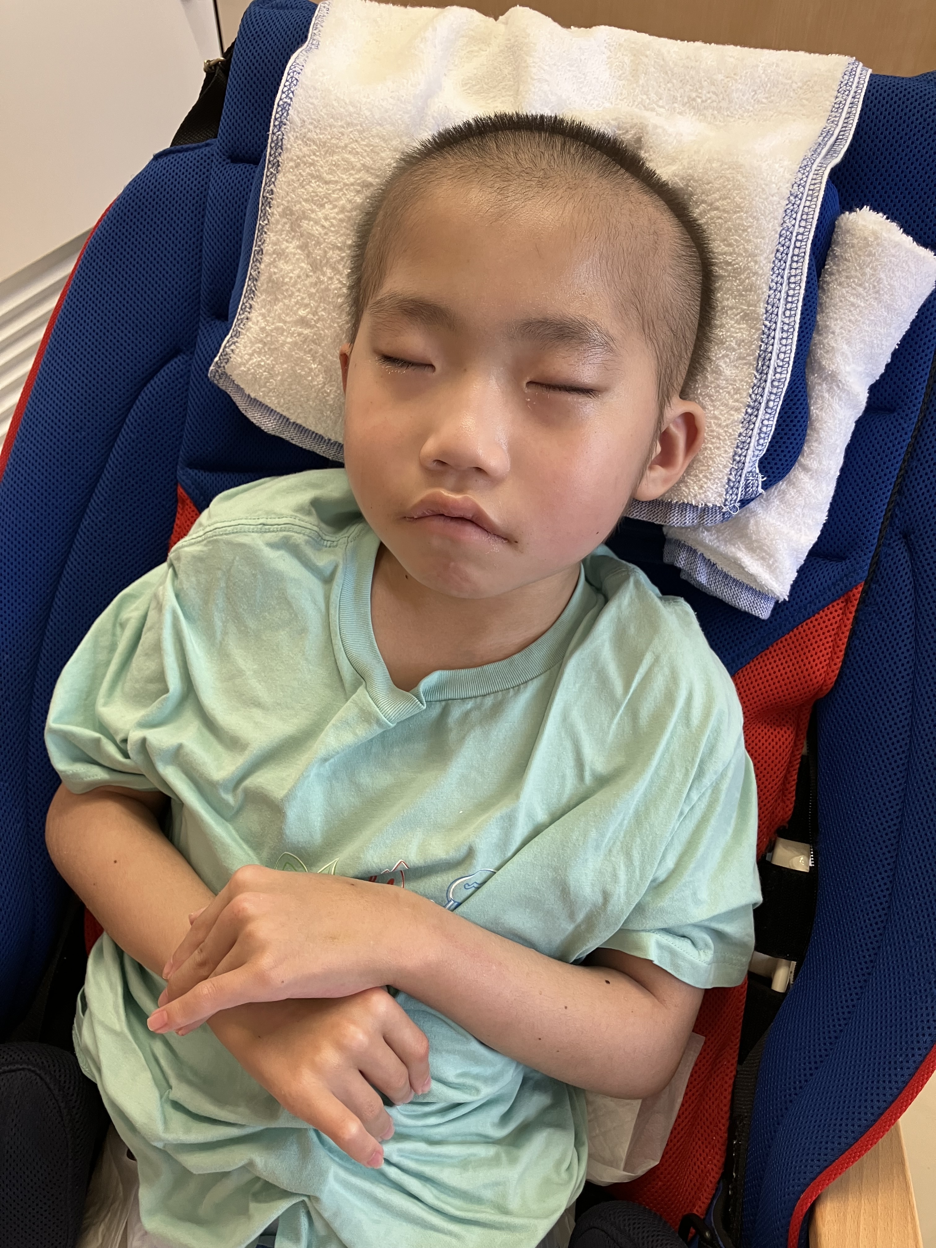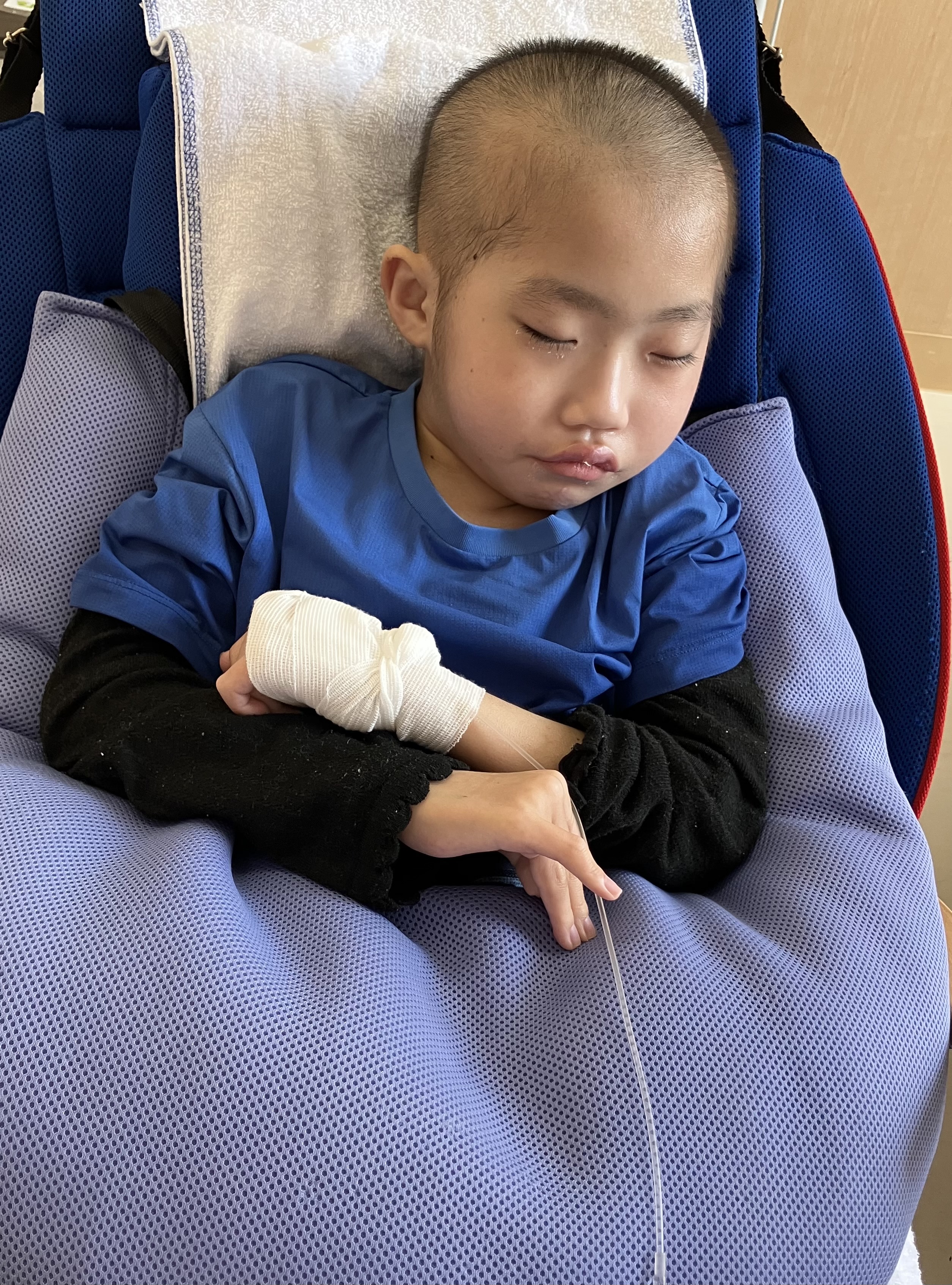 ~10歳長男🐻(小4)~昨日はお熱が36〜37℃台と解熱傾向だった長男🐻👍腕が下がるようになってきました😳かまきりポーズが懐かしい💭昨日も眠い日だったようでまぶたが重そうでした😅日中は泣くことも多く切なそうに泣いていましたね💦以前は発熱で脱力して泣く元気がない状態から解熱すると、全身の反り返りや突っ張りが強くなって激しく泣くのが長男🐻の病み上がりパターンでした。(バギーに座れないくらい反り返っていましたね💦)今回は反り返るような突っ張りはなく切なそうに泣いており、身体がだるくて切ないのかな?という印象です。だるさはまだまだあると思いますが、ガバペンで体が突っ張ったり、痛みが緩和されたことは良かったなと思います😌泣き方が違いますね👀足首に入っていた点滴が腫れてしまったため、手首に点滴を入れ直し、採血もしました。まだまだ大きく変化はないですが、少しずつ改善傾向にあることがわかって良かったです😌リハビリでは、関節可動域練習を中心に実施していただきました。全身の力が抜けててユルユルでしたね👀膝や股関節、骨盤や体幹も単関節や分節的に動きがでるようになってきて、以前までの筋緊張とは全く違います😳今までは股関節を動かすと体幹も一緒(板のよう)に一体化して動いていたので、関節にゆとりができたことは良きでした👍2年という歳月の中で、筋の短縮や拘縮になっている状況ではありますが、まずはゆとりができた範囲で体を動かしていきたいと思います💪がんばろー⤴️↓なぜか寝る前になると顔が赤くなって心拍数が上がる😣寝にくそうでしたが、体温37.3℃だったためそのまま様子を見ます。その後はなんとか眠れて、朝は穏やかさんに眠れていました😌