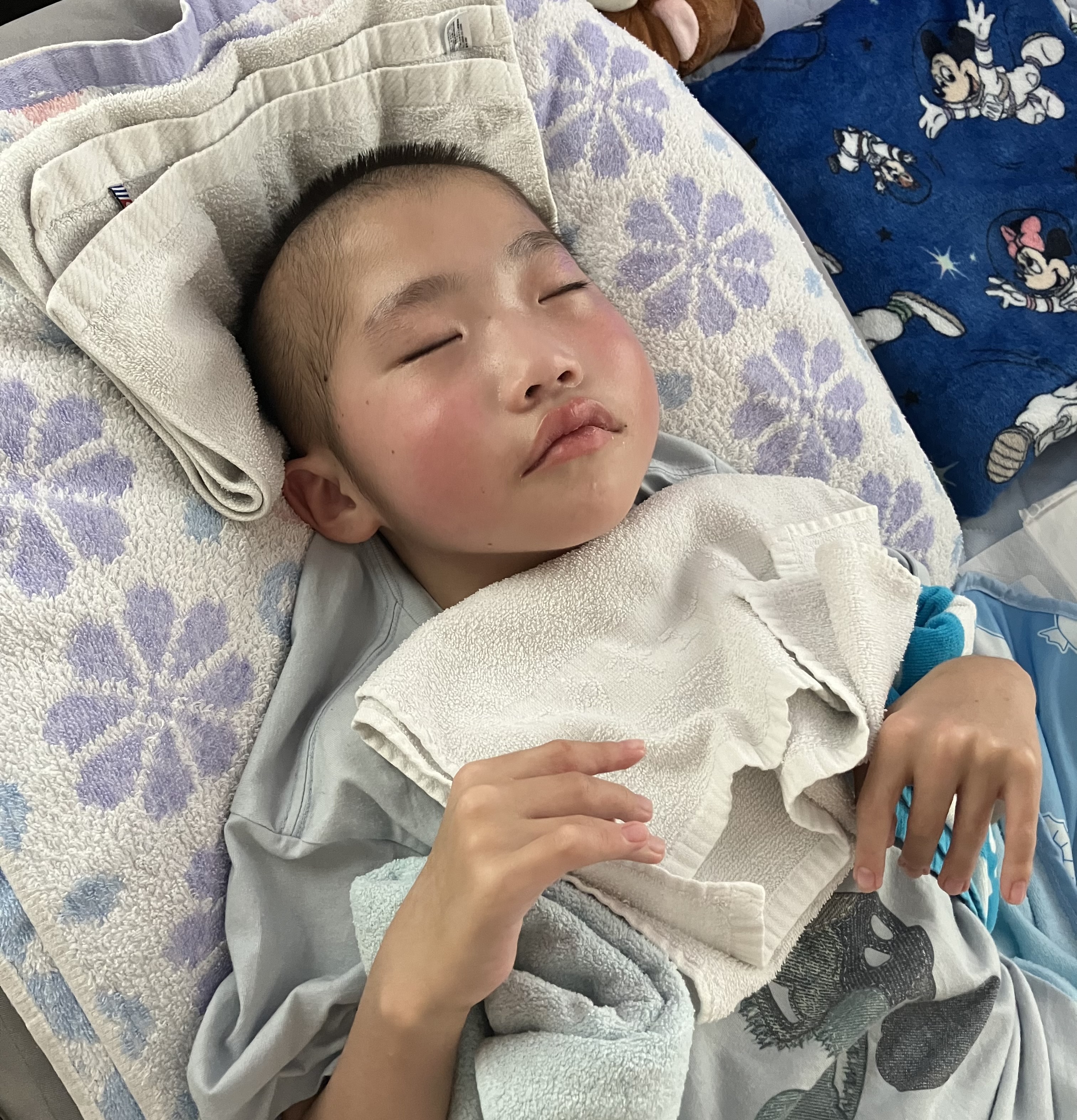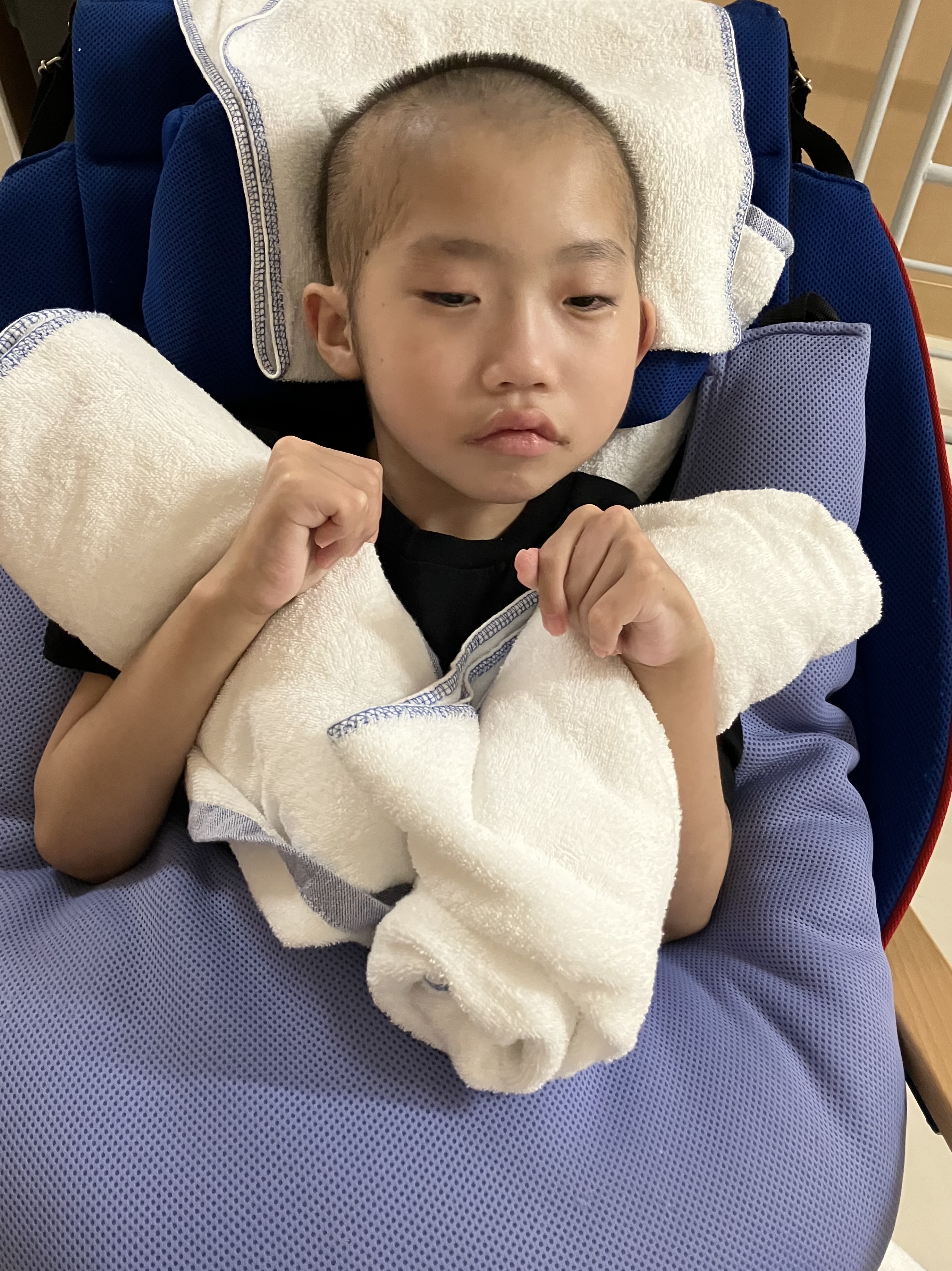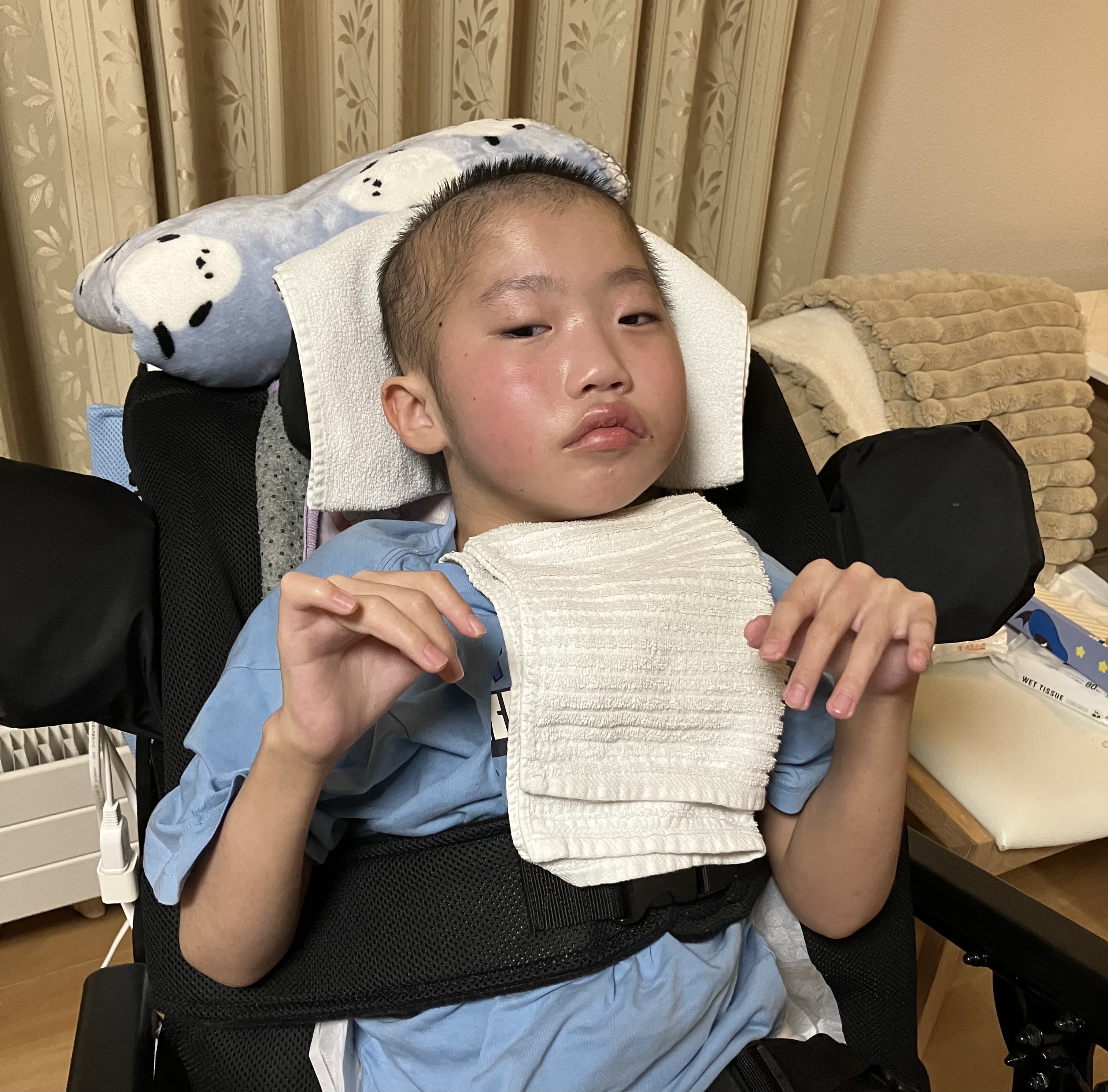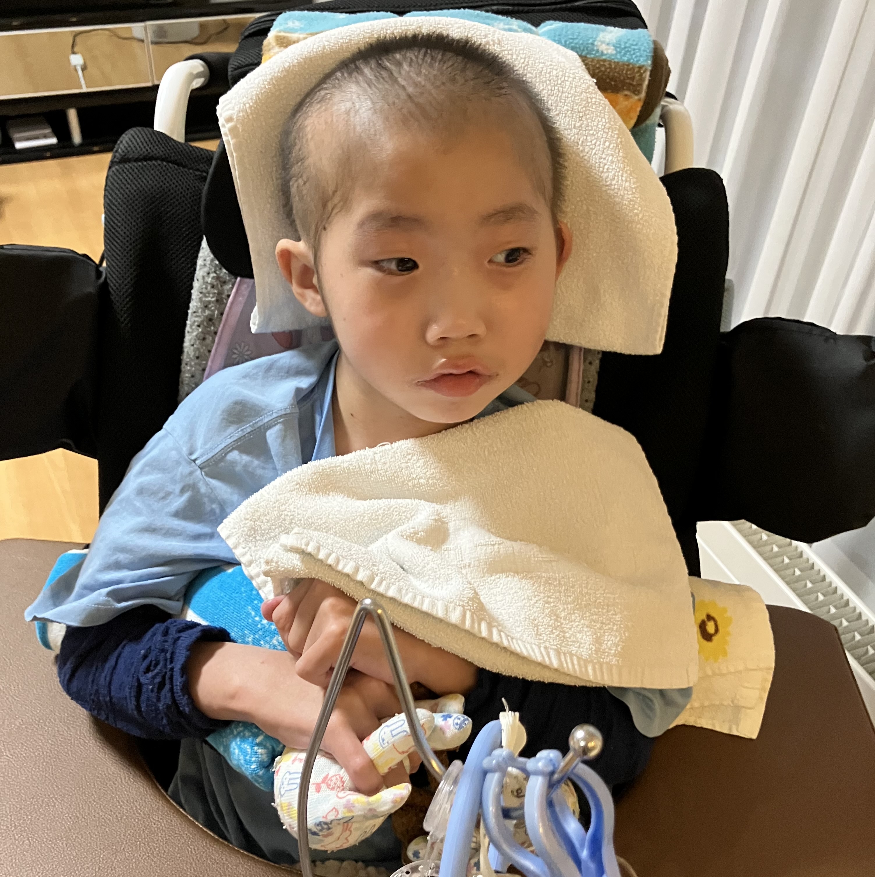 ~10歳長男🐻(小4)~昨日はお熱が36〜37℃台と解熱傾向だった長男🐻👍腕が下がるようになってきました😳かまきりポーズが懐かしい💭昨日も眠い日だったようでまぶたが重そうでした😅日中は泣くことも多く切なそうに泣いていましたね💦以前は発熱で脱力して泣く元気がない状態から解熱すると、全身の反り返りや突っ張りが強くなって激しく泣くのが長男🐻の病み上がりパターンでした。(バギーに座れないくらい反り返っていましたね💦)今回は反り返るような突っ張りはなく切なそうに泣いており、身体がだるくて切ないのかな?という印象です。だるさはまだまだあると思いますが、ガバペンで体が突っ張ったり、痛みが緩和されたことは良かったなと思います😌泣き方が違いますね👀足首に入っていた点滴が腫れてしまったため、手首に点滴を入れ直し、採血もしました。まだまだ大きく変化はないですが、少しずつ改善傾向にあることがわかって良かったです😌リハビリでは、関節可動域練習を中心に実施していただきました。全身の力が抜けててユルユルでしたね👀膝や股関節、骨盤や体幹も単関節や分節的に動きがでるようになってきて、以前までの筋緊張とは全く違います😳今までは股関節を動かすと体幹も一緒(板のよう)に一体化して動いていたので、関節にゆとりができたことは良きでした👍2年という歳月の中で、筋の短縮や拘縮になっている状況ではありますが、まずはゆとりができた範囲で体を動かしていきたいと思います💪がんばろー⤴️↓なぜか寝る前になると顔が赤くなって心拍数が上がる😣寝にくそうでしたが、体温37.3℃だったためそのまま様子を見ます。その後はなんとか眠れて、朝は穏やかさんに眠れていました😌