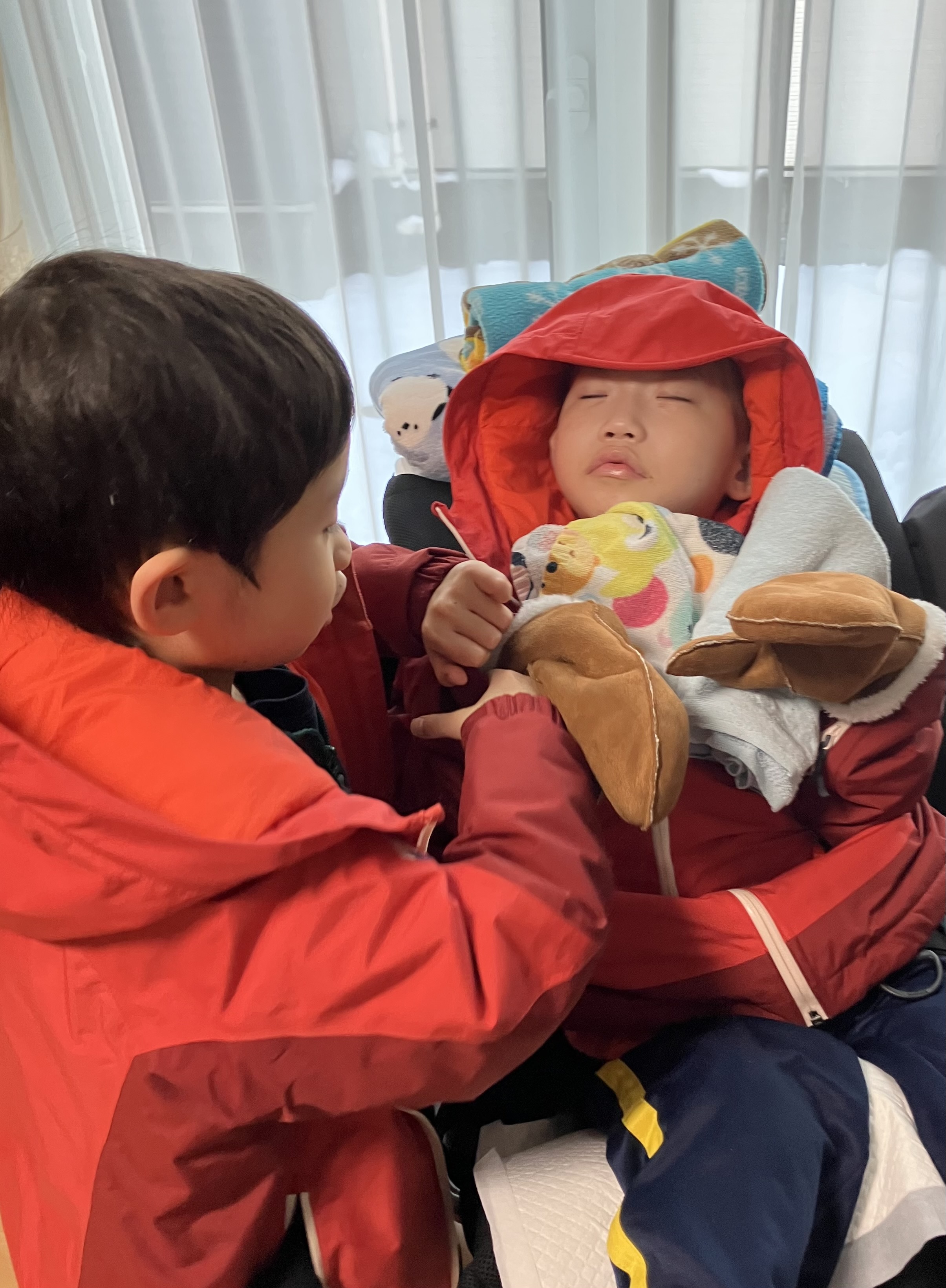 ~10歳長男🐻(小4)~昨日もおうちでゆっくりした長男🐻お尻が気持ち悪い時は泣いて教えてくれて、キレイになると泣き止むので快・不快をちゃんと教えてくれる長男🐻です😊あと眠い時とお腹が空いてる時も泣き方が微妙に違うのでめんこいです☺️シャワー浴に入ってさっぱりして、本当に穏やかさんな時間が多かった日でした👍~7歳次男🐒(小1)~昨日は始業式だった次男🐒さっそく漢字テストや絵日記、工作の発表会などいろいろ授業もあって楽しかったそうです☺️お昼に帰宅してからは、せっせと雪遊び☃️を楽しみ「かまくら」を作ってました。ずっとニコニコしながら楽しそうてしたね☺️
