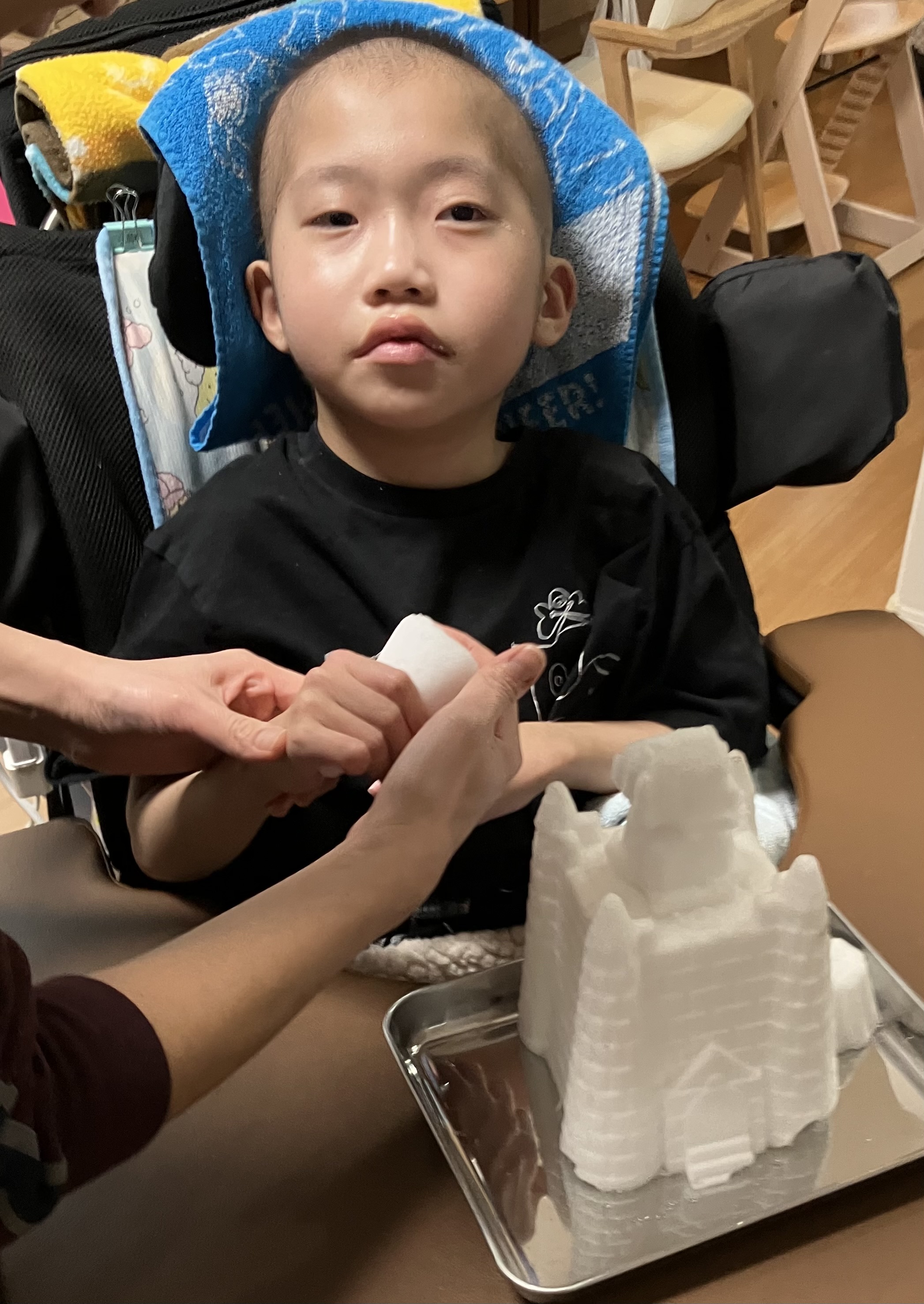 ~10歳長男🐻(小4)~昨日は学校と放課後等デイサービス「fuwaRi 」さんへ行った長男🐻🏫学校🏫鼻水が出ていたり、手が冷たいこともあったそうですが、痰がらみもなく筋緊張も緩んでて、とても落ち着いていたとのこと😊個別学習では、綿で「雪だるま☃️」を作って、綿を両手で握ってフワフワの感触を楽しみ、「袋の中にギュッと入れて」と言って、手を軽く下向きに先生と押した時に、長男🐻🌼笑った🌼そうです🥰ついに家以外でも🌼笑顔🌼を見せくれた長男🐻今年は家以外の場所でも笑顔になることが今年の目標だったので、嬉しいー🥲家でも最近笑ってないから笑ってー!!🙏トイレは、先生がタイミングをみて尿器を使ってくれて、見事大成功したとのこと👍すっきりした表情だったそうです☺️タイミングを見計らって対応してくれる先生もすごいです😳笑顔も見せて、トイレも成功して、成長を見せてくれている長男🐻です🥺🌻fuwaRi 🌻お風呂♨️に入ってさっぱりして、活動では、鬼👹のお面作りで色紙で髪をくしゅくしゅしたり、目や鼻を作ったりして楽しんだとのこと☺️fuwaRiさんでも穏やかさんに過ごせたそうです😊楽しかったね🤗