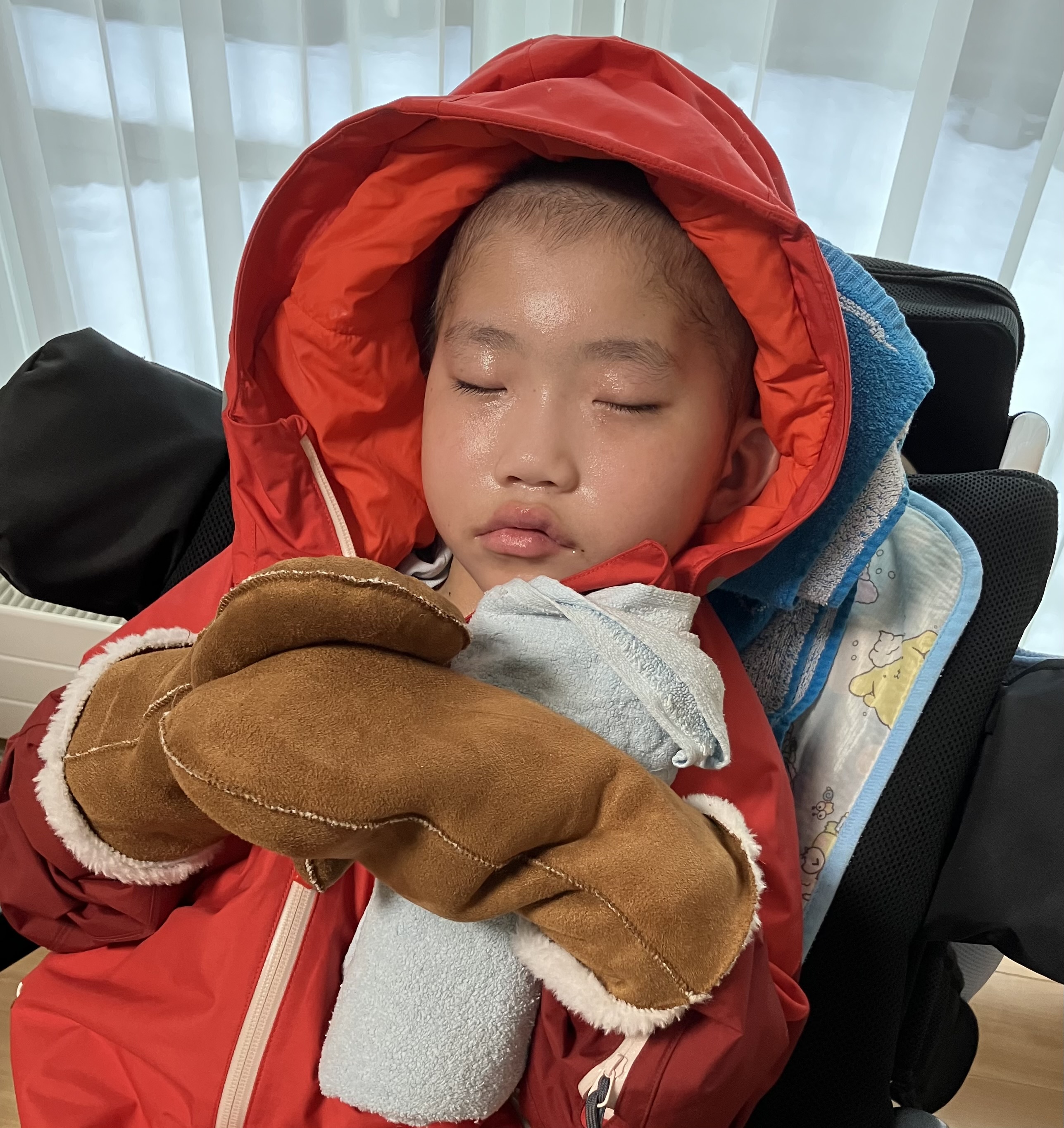 ~10歳長男🐻(小4)~昨日は放課後等デイサービス「fuwaRi」さんへ行った長男🐻お風呂🛀に入ったり、活動では雪に触ったり、絵の具🎨で色をつけた雪でアイスクリームを作ったりと感覚遊びを楽しんだり、色画用紙で雪だるまを作って制作も楽しんだとのこと😊午前中は、福祉用具業者の「はらっぱ」さんが来てくれて、移動用バギーに胸ベルトと肩ベルトをつけてくれました。筋緊張の状態によって、右凸の側弯が強くなって、姿勢が崩れてしまうため装着していただきました。楽な姿勢で過ごせる時間が増えればいいなーと思います🙏帰宅後は疲れたのかすぐに寝てしまった😳楽しかったね🤗