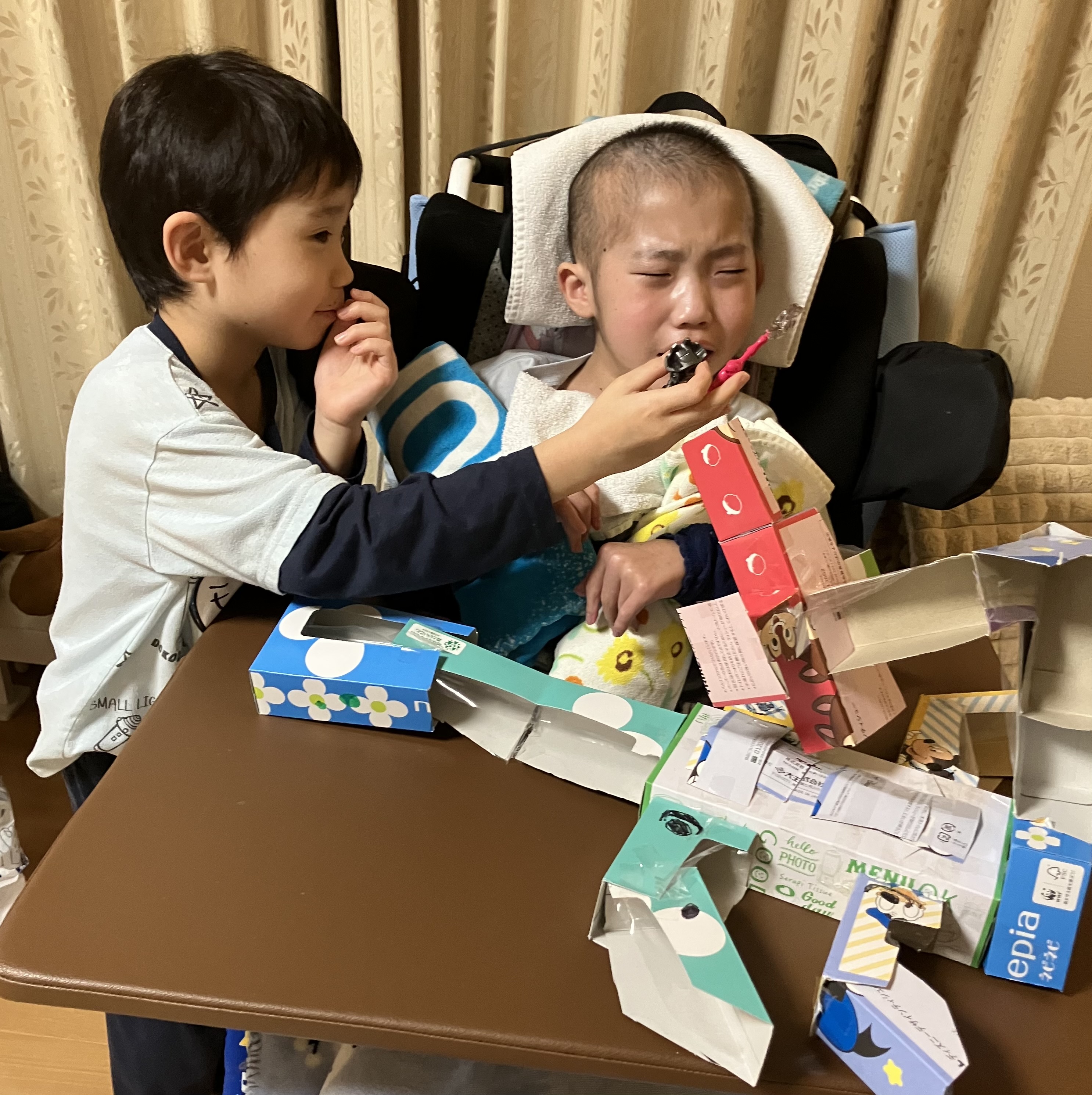 ~10歳長男🐻(小4)~昨日は放課後等デイサービス「どんぐりコロコロ」さんへ行った長男🐻午前中は眠っている時間が多かったそうです👀午後から起きて手や足のマッサージをしてもらったり、ビデオ鑑賞で「ドラゴンボール」を見たり😳、「こびとのくつや」という絵本の読み聞かせを聞いたりと穏やかさんに過ごしたとのこと😌おかえりなさい🤗~7歳次男🐒(小1)~昨日は室内遊具施設へ行ったり、おうちで制作などを楽しんでいました☺️ 💬ママのつぶやき💬長男🐻の介護をするようになって増えたのがティッシュの消費量です😳清拭やサクション時、よだれを拭く時、もちろん鼻をかむ時とすごく使います😅毎週購入する勢いです😳そして空き箱は…次男🐒「全部取っておいて!!」と黙々と制作に使います。次男🐒の作品はダイナミックです(笑)次男🐒「プレシオサウルス」だそうです☺️長男🐻にもしっかり見せます🤗