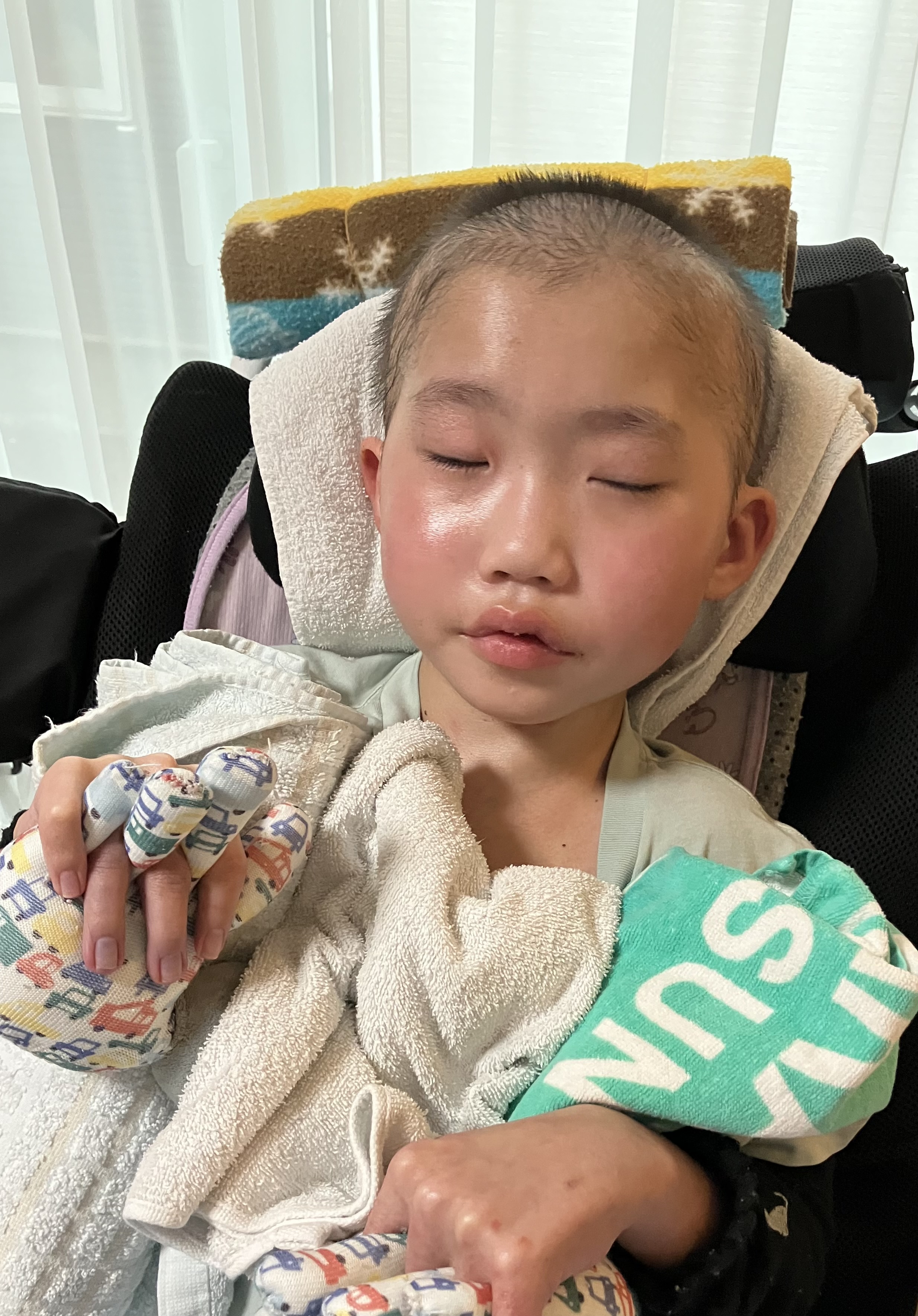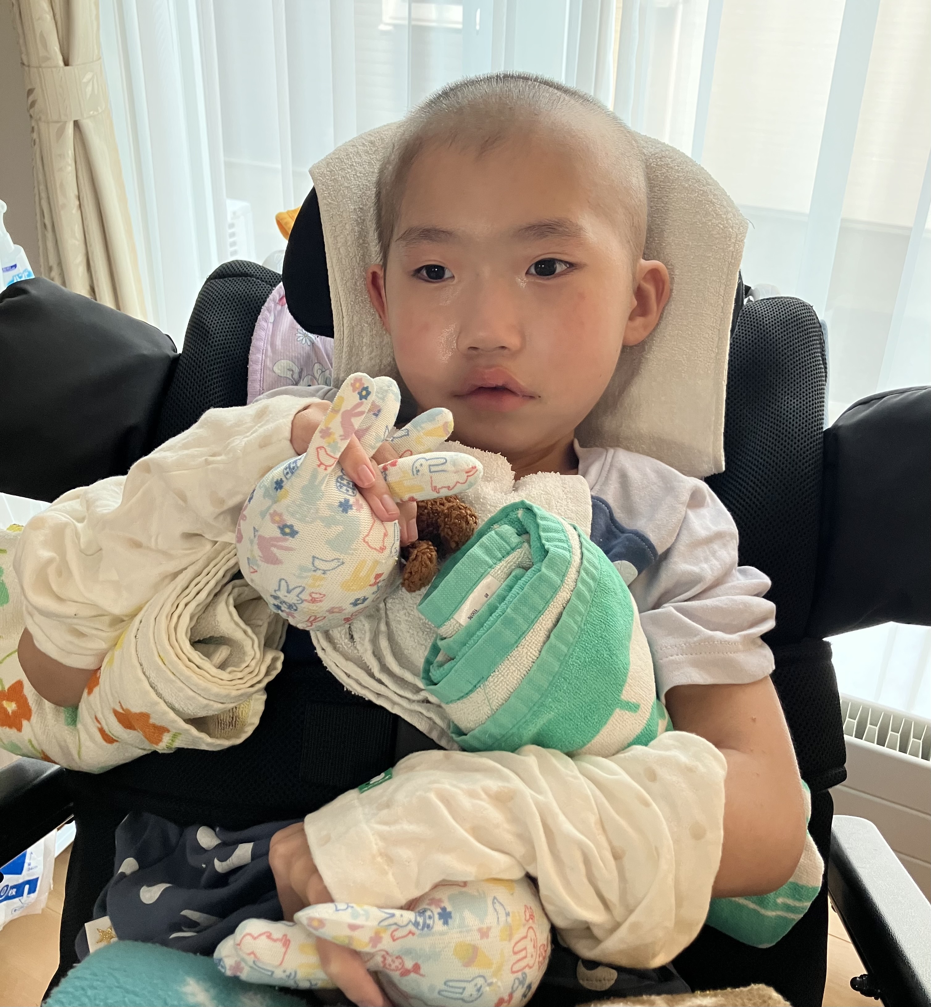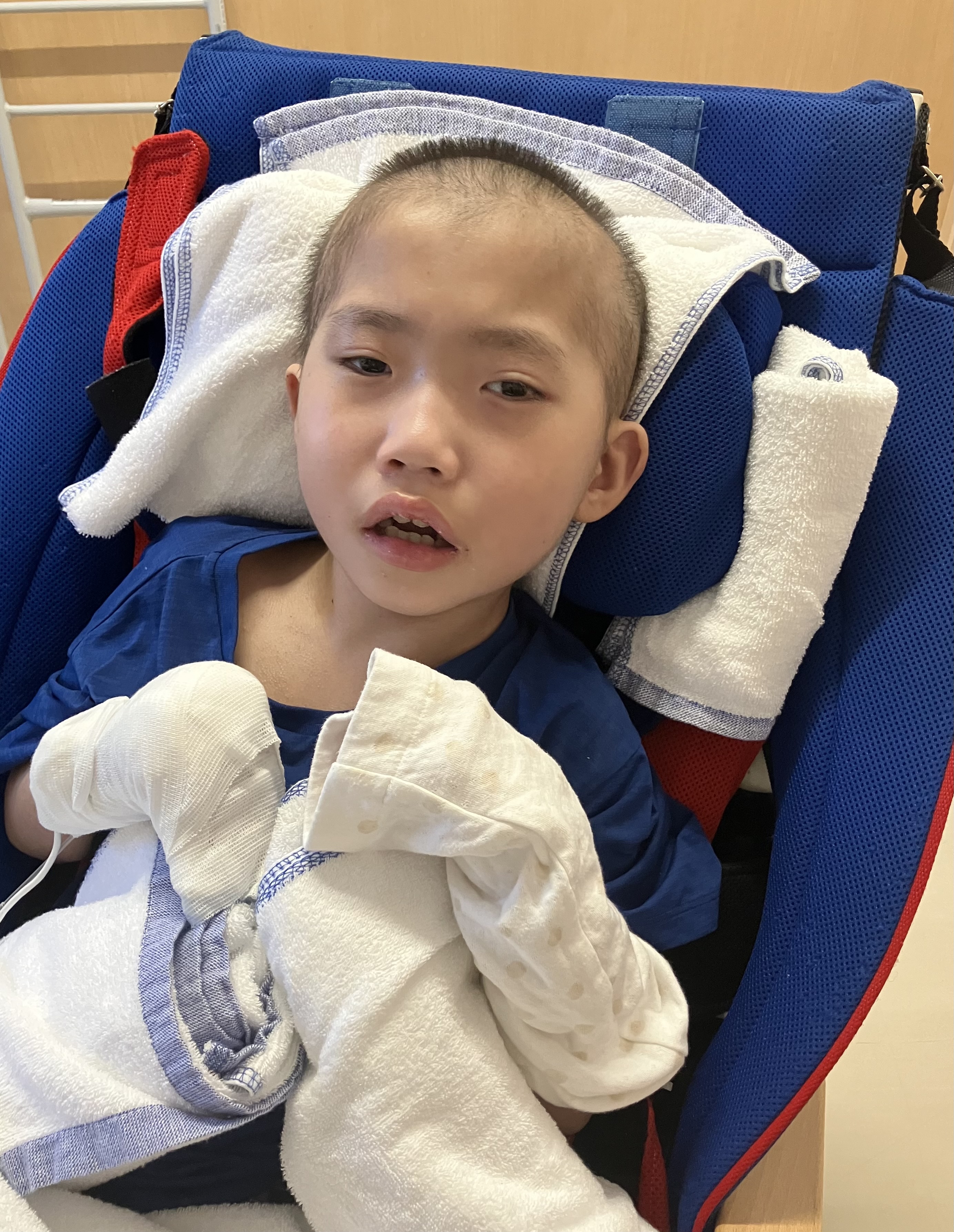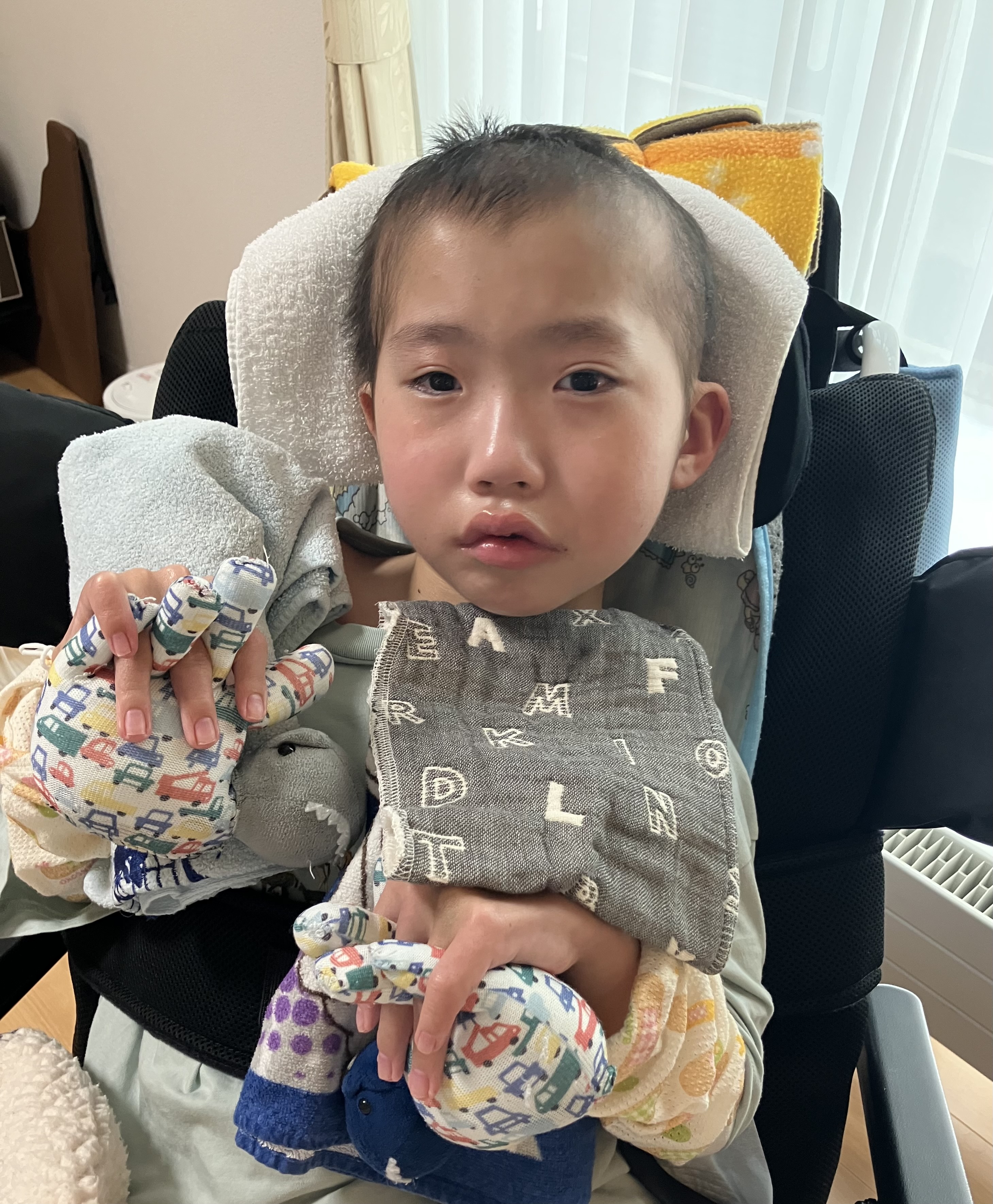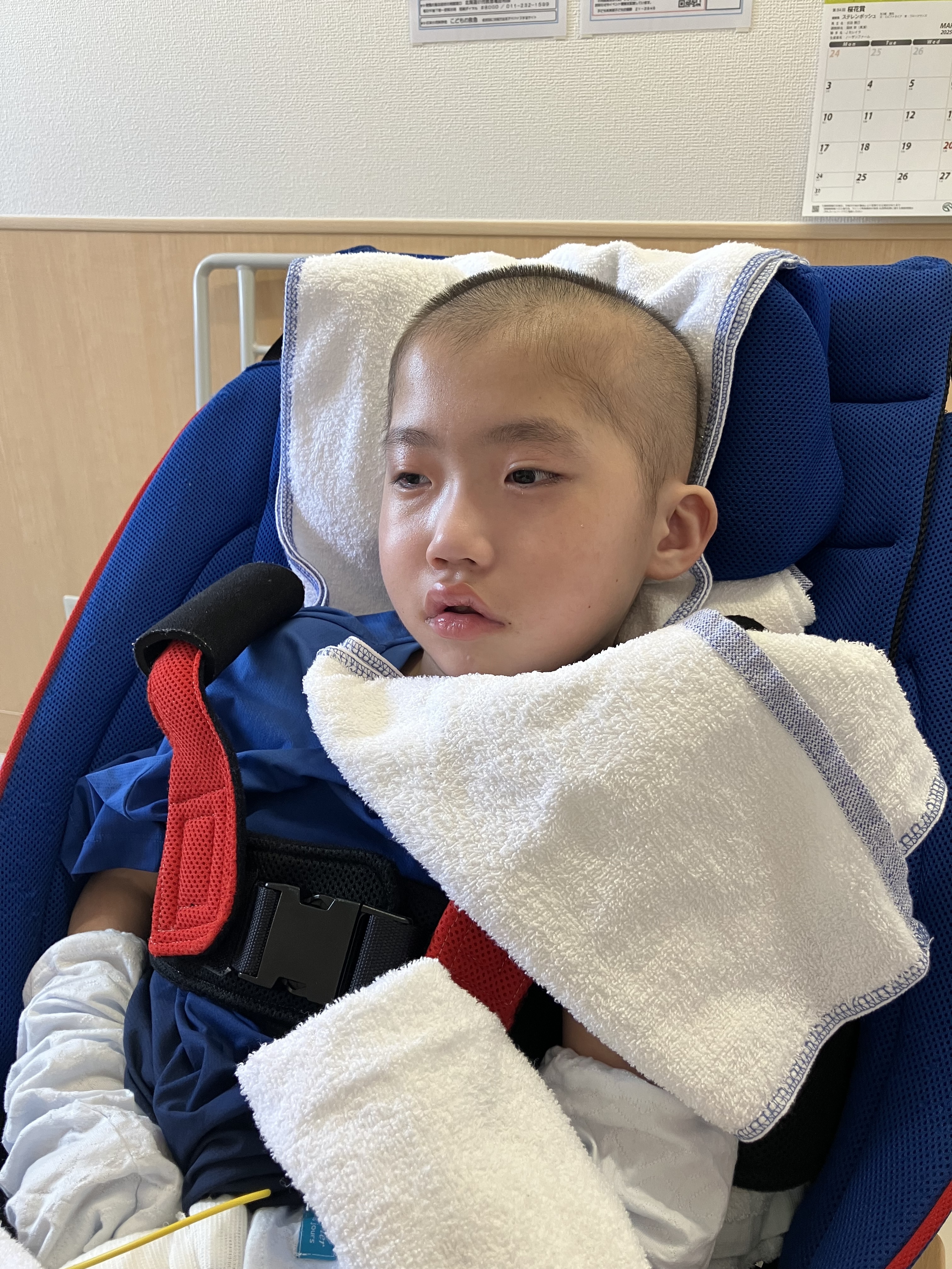 ~10歳長男🐻(小4)~昨日は、前日に比べると穏やかさんだった時間が多かった長男🐻☺️本当に良かった😌痰は多いですが、ポジショニングや排痰をしながら痰を出し切っていくしかないので、長男🐻頑張っていました。酸素も使わず、酸素飽和度96〜100%とまだムラはありますが、しっかり酸素を取り込めるようになってきました☺️先生「熱も下がってきたし、抗生物質も内服に切り替えられる。日曜日レントゲンと採血して、結果が問題なければ月曜日退院しましょう。」今までの最速での退院となりそうです👀先生「今回は初回の肺炎だったから、このまま様子を見るけど、もしやっぱり退院後も発熱を繰り返すようなら対策を考えないといけない。唾液による誤嚥もあるけど、胃ろうから栄養を注入する際に逆流して肺炎を起こすこともあるから、逆流していないか検査をしてみたり、本当にそれでも落ち着かないなら最終手段は咽頭分離術と言って、誤嚥を防止するために気管と食道を分離する手術をする必要があるかもしれない。この手術をするなら札幌にいく必要がある。」とのこと😣↓気切ですひとまず…・小まめなサクション・ポジショニング(どうしても側弯により左肺が狭まってしまうため、正中位に近づけるように姿勢を整える。側臥位やうつ伏せ練習。)・排痰練習や胸郭・肩周りの柔軟性確保のためのストレッチなどなどおうちで出来ることをやっていきたいと思います😣頑張ろう!💪昨晩は4時にムセ込みがありましたが、久しぶりにグッスリ眠れていました😌ムセ込みのあとは尾を引くようにゴロゴロしてて、スッキリしないことが多かったですが、昨晩はスッキリと痰が切れるようになってきたので良かったです😊本日の採血・レントゲンの結果で退院できるか決まります😳