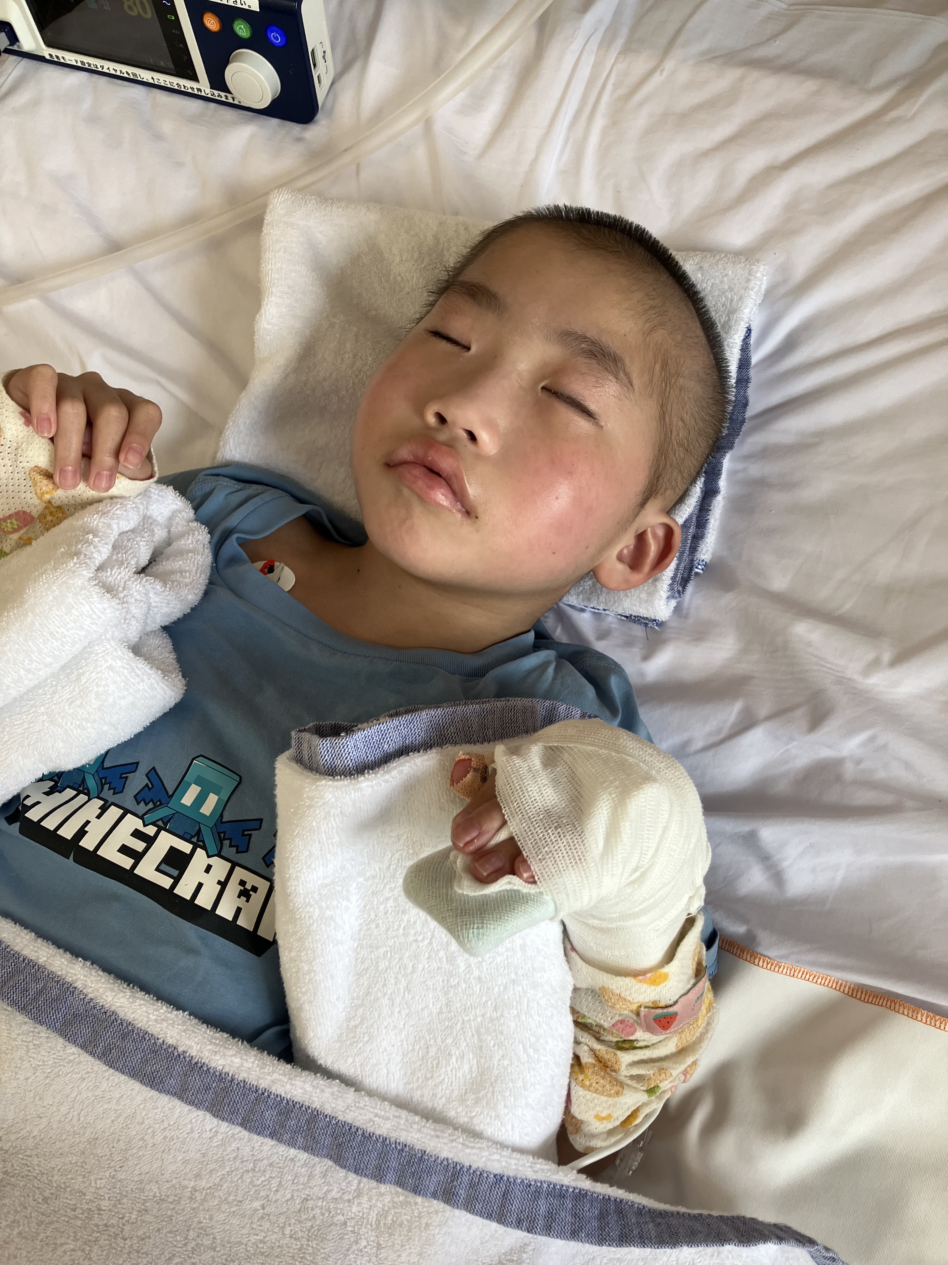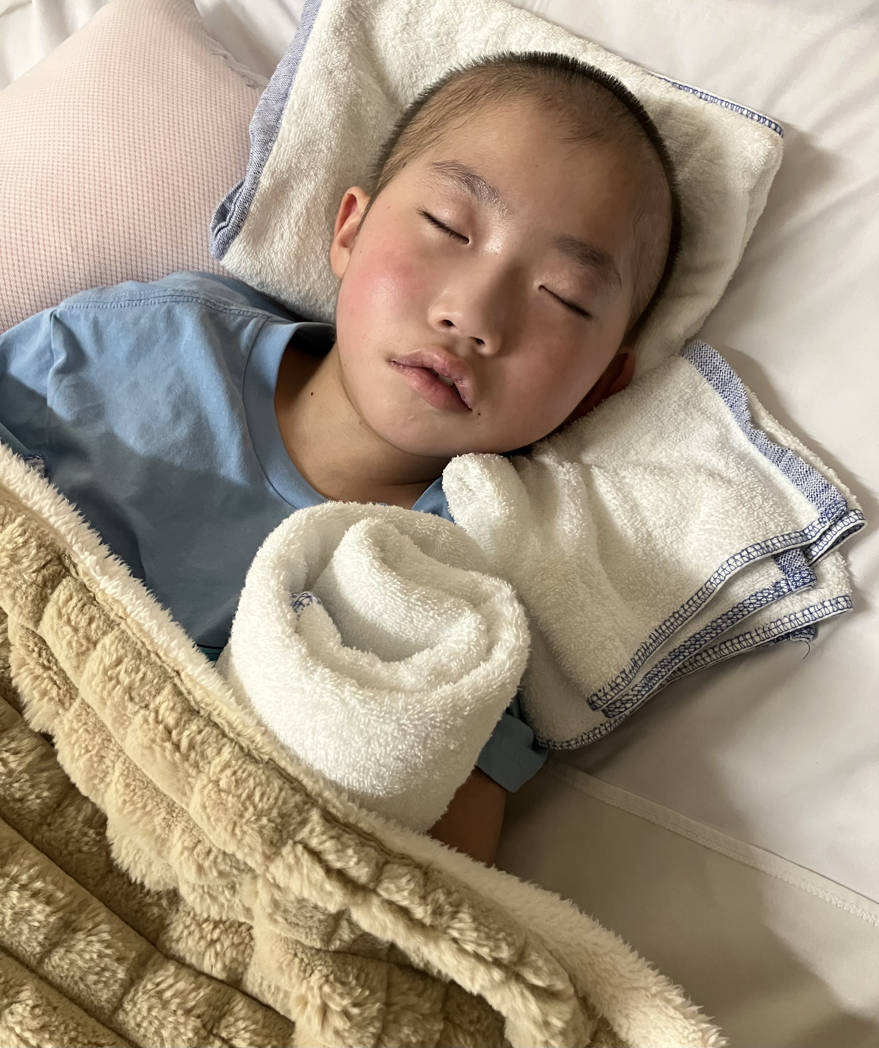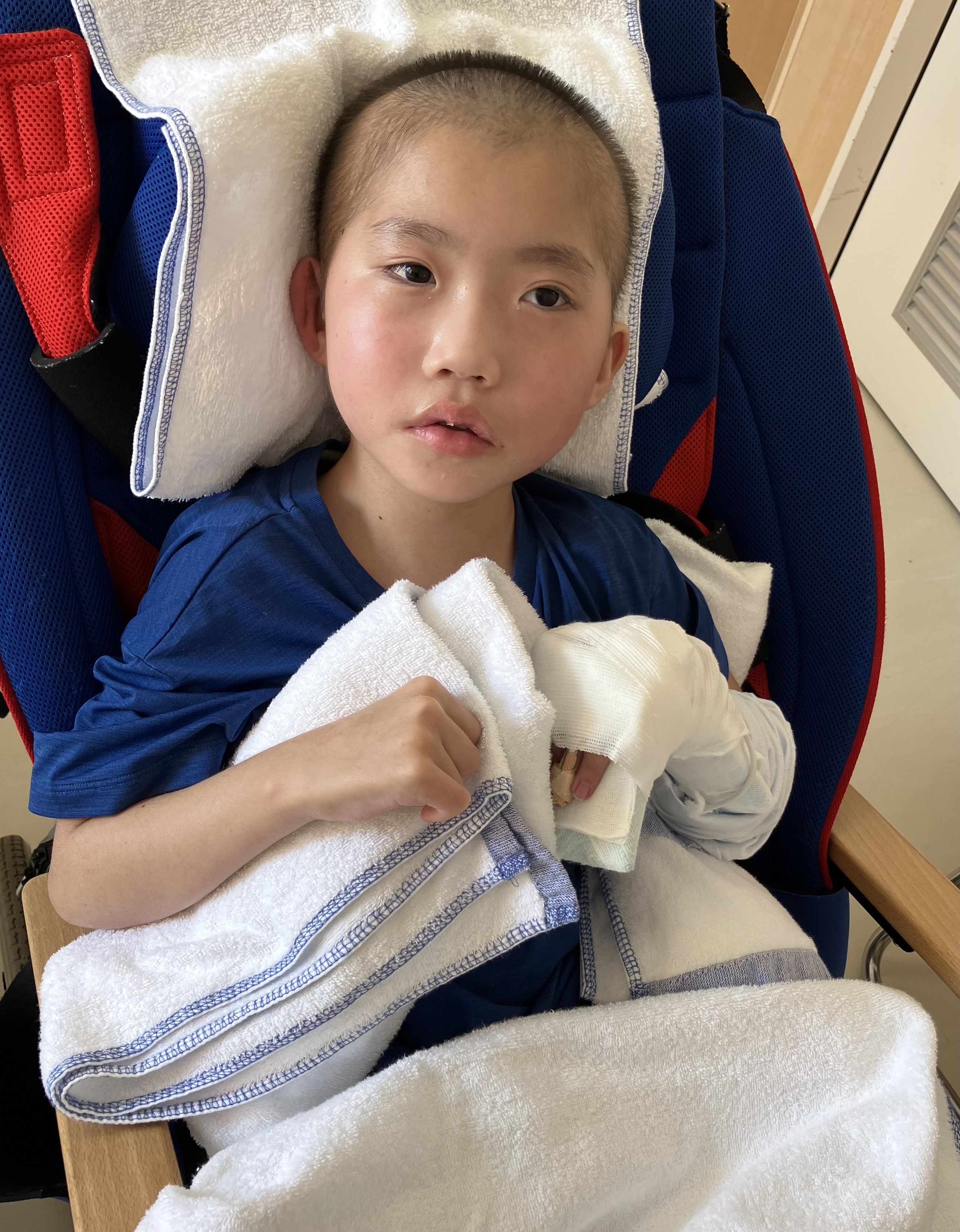 ~10歳長男🐻(小4)~昨日の日中も穏やかさんな時間が多かった長男🐻夜間はムセ込みも全然なく、酸素飽和度も98〜100%とバッチリさんな長男🐻です👍先生「発疹はひろがってるね。やっぱり汗疹っぽいよね。シャワーの許可も出します。あと25日(火)に採血して、良ければ26日(水)の退院を目指しましょう😊」ということで…さっそく看護師さんがシャワー浴に入れてくれました🥺2週間弱ぶりのシャワーでさっぱりしたね🤗日中は酸素飽和度100%💯で肺炎はすごく良くなっている印象です👍抗生物質変更してもらえて良かった🥺退院の目処も立ちそうなので、このまま順調に行って欲しいです🙏そして…本日は学校の修了式🏫4年生最後の授業に参加できなかったことは残念ですが…4年生の1年間は長男🐻にとって大きな変化&成長の年だったなと感じています😊先生方には大変お世話になりました🙏本当にありがとうございました🥺新5年生になってからもいろいろあると思いますが、来年度もよろしくお願い致します☺️