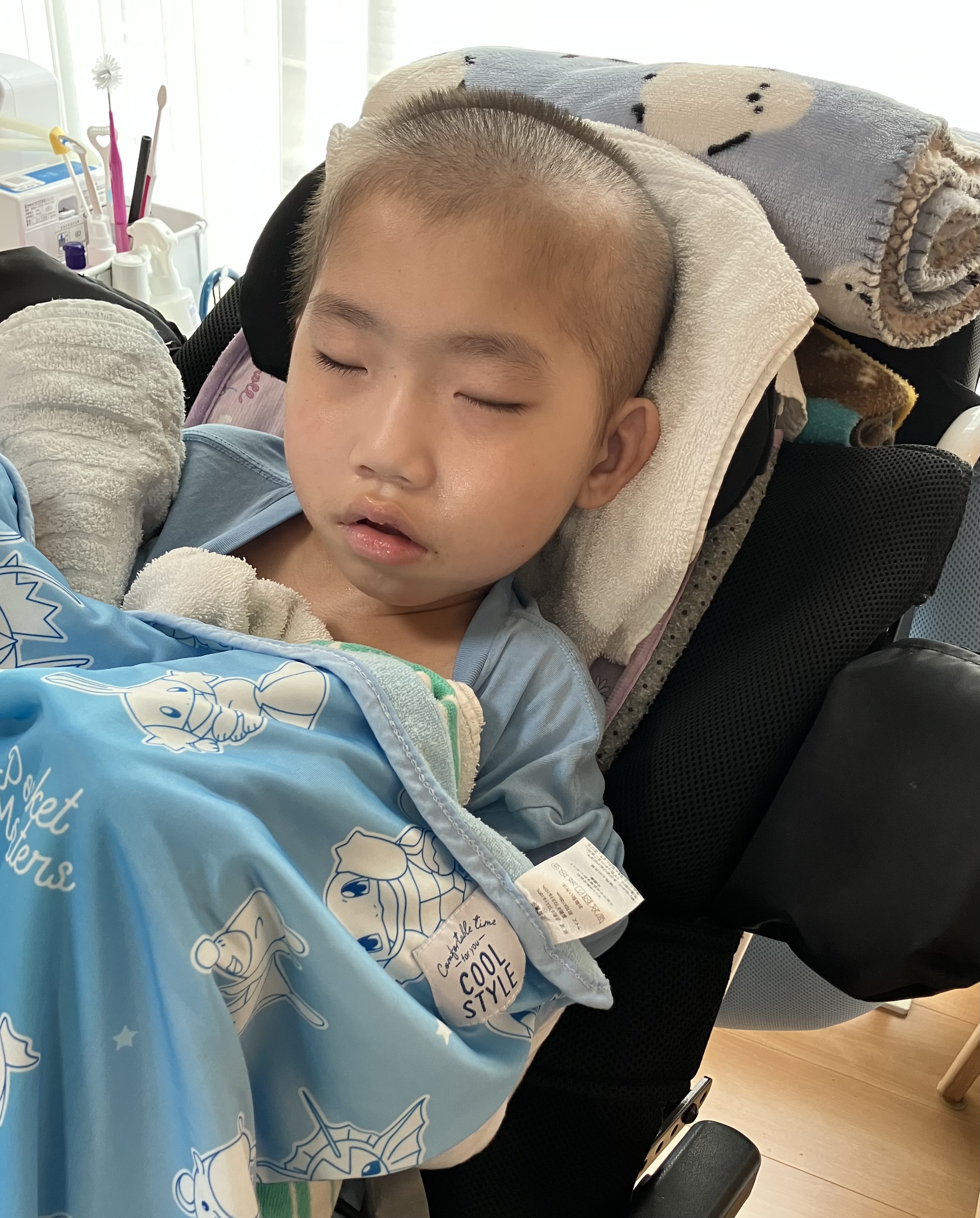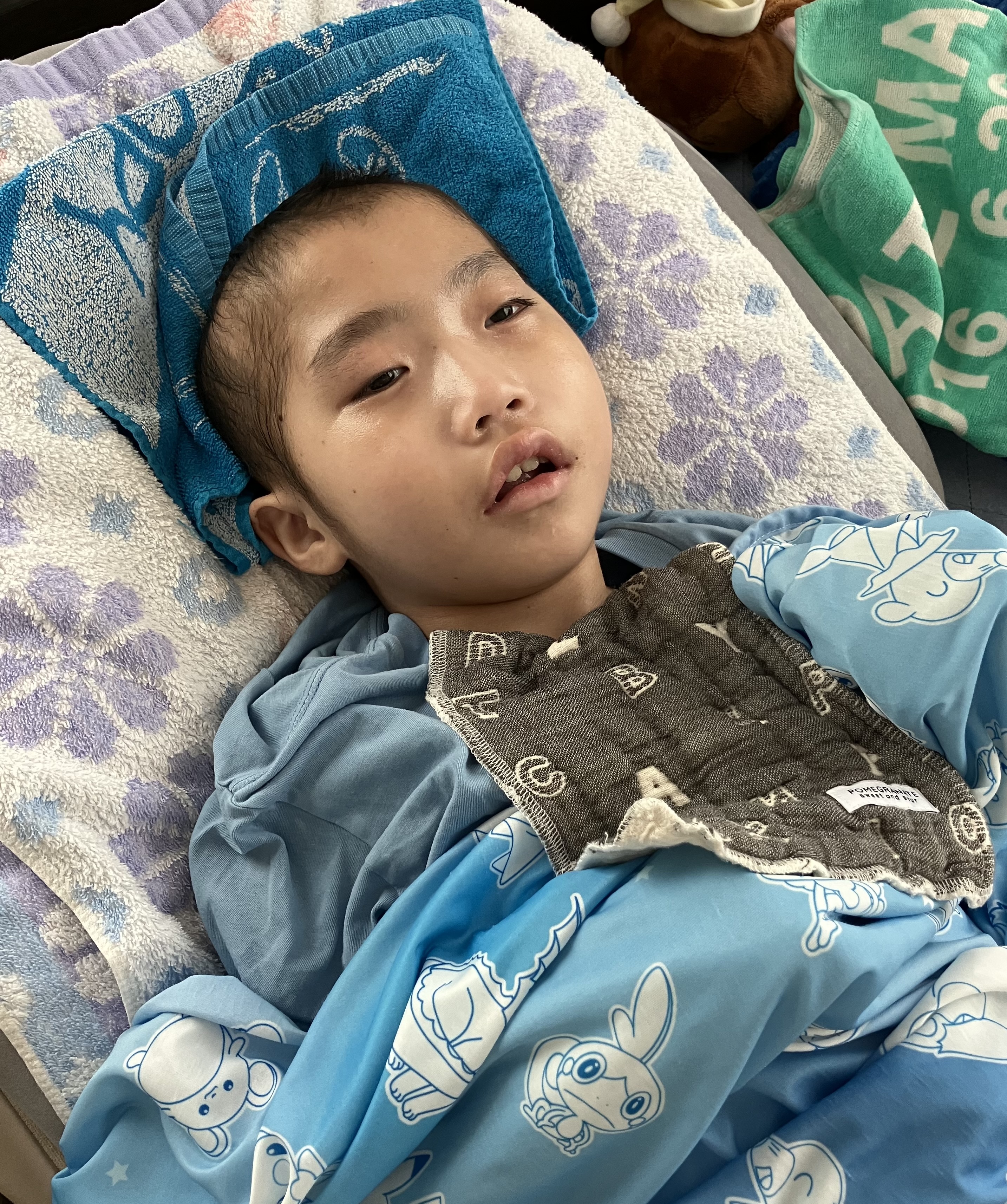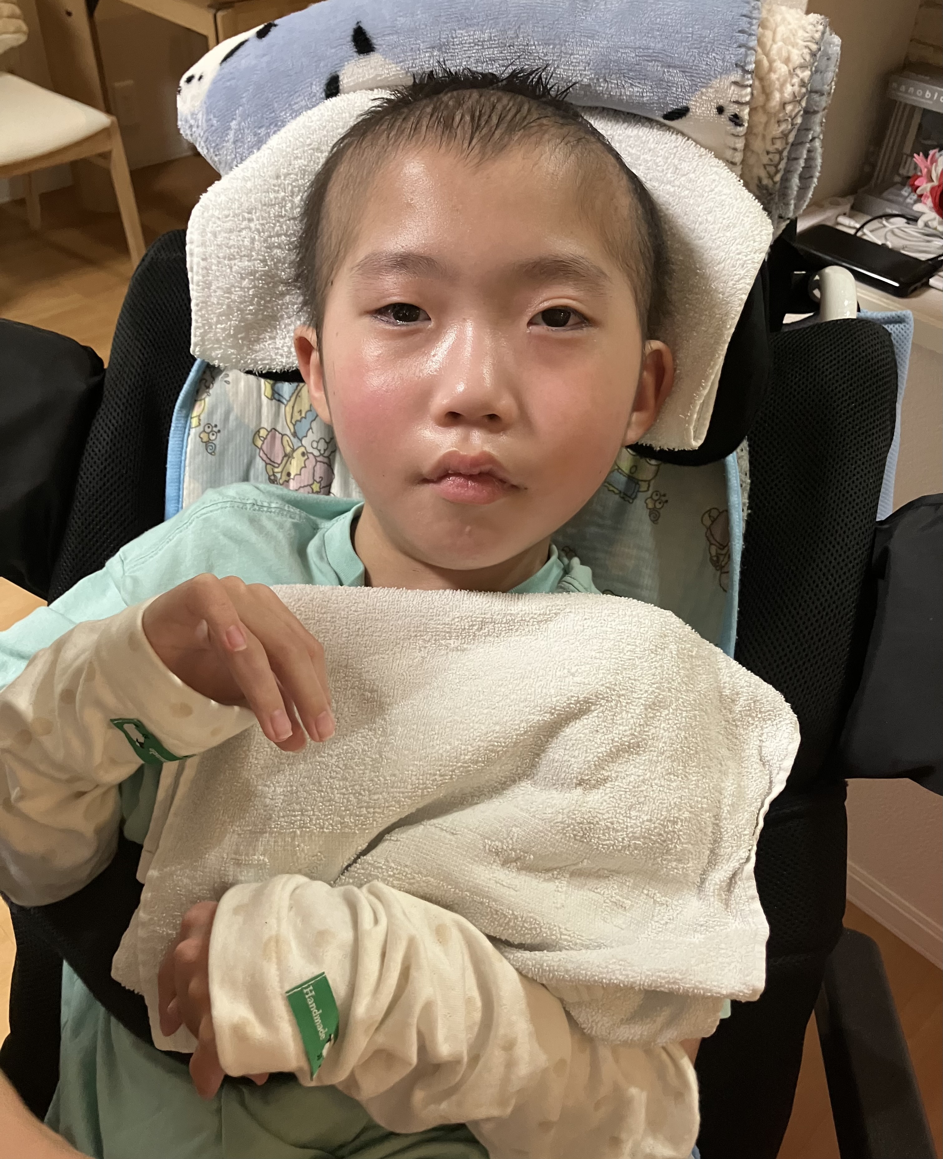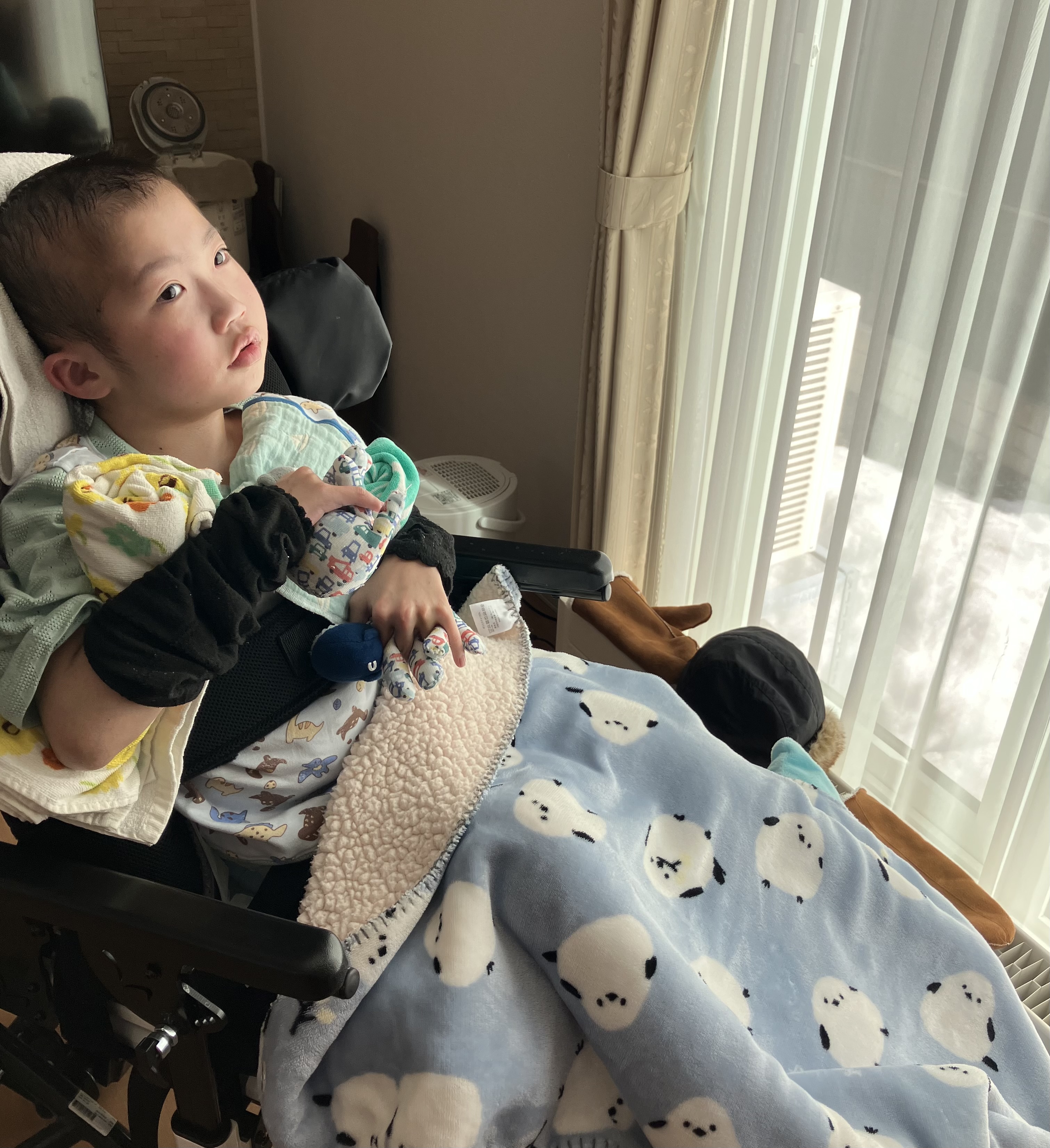 ~10歳長男🐻(小4)~昨日は、おうちでゆっくりした長男🐻午前中は訪問看護師さんにバイタルや全身状態等をチェックしていただき、午後からはシャワー浴もしてさっぱりしました😊全身の汗疹は少し良くなってきたので、このまま治ってほしいなと思います🙏日中は穏やかさんというか、逆に心配になるくらい静かでした💦手足もすごく冷たくて、お熱が出ないかハラハラしましが…ひとまず冷たくなった手足を温めるべく、レンジでチンするタイプの湯たんぽを足元に忍ばせると手も足もポカポカしてきて良い感じの体温になってきました😌 アイスノンと湯たんぽを長男🐻の状態・症状に合わせて使いわける必要があります😣昨日は久しぶりに訪問看護師さんやヘルパーさん、担当相談員さんにも会えて、賑やかな日でした😊長男🐻は熱もなく、夕方はいつもの泣き声が聞こえて、少し安心していると夜はぐっすり眠れていました☺️今日もおうちでゆっくりします😌