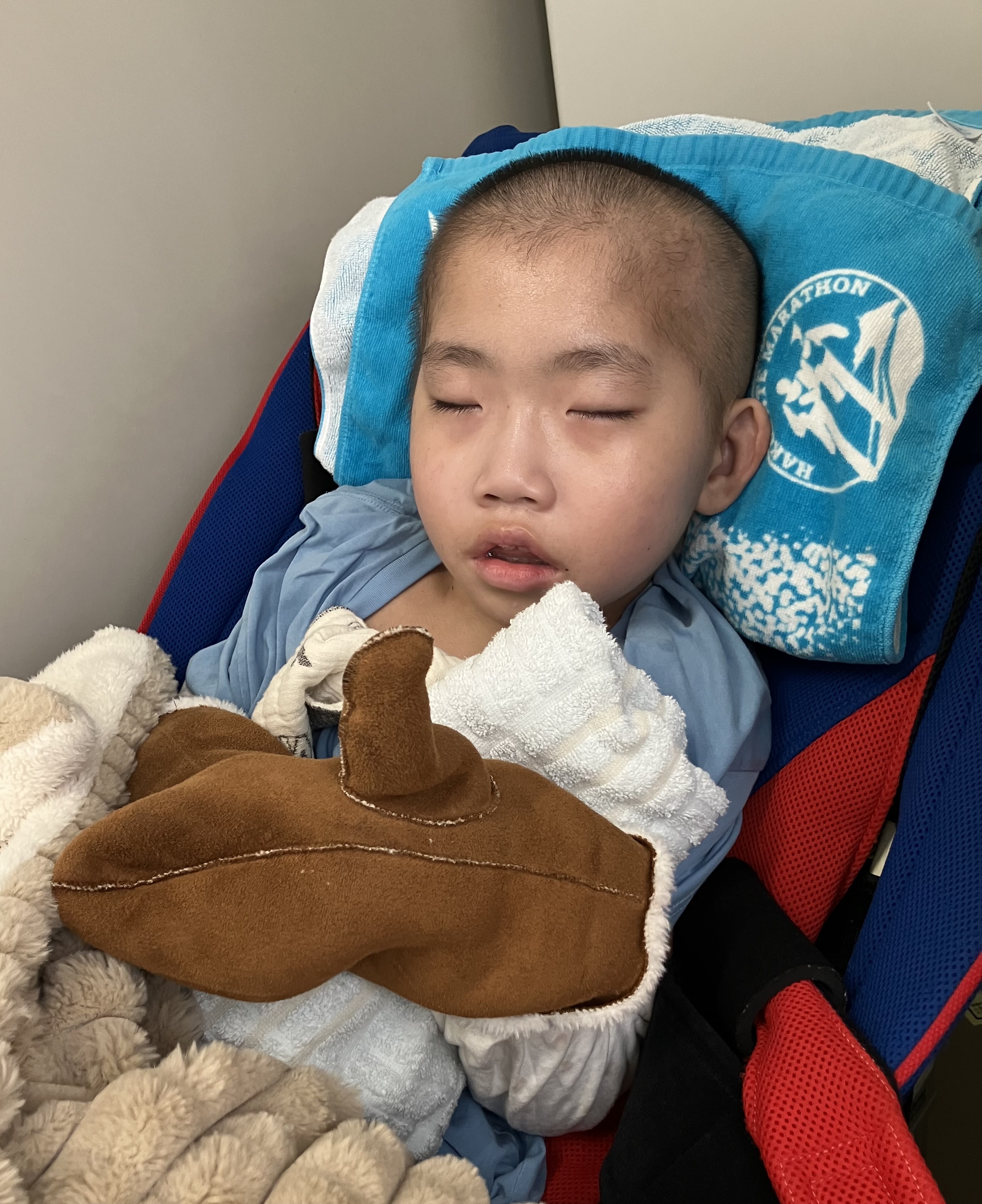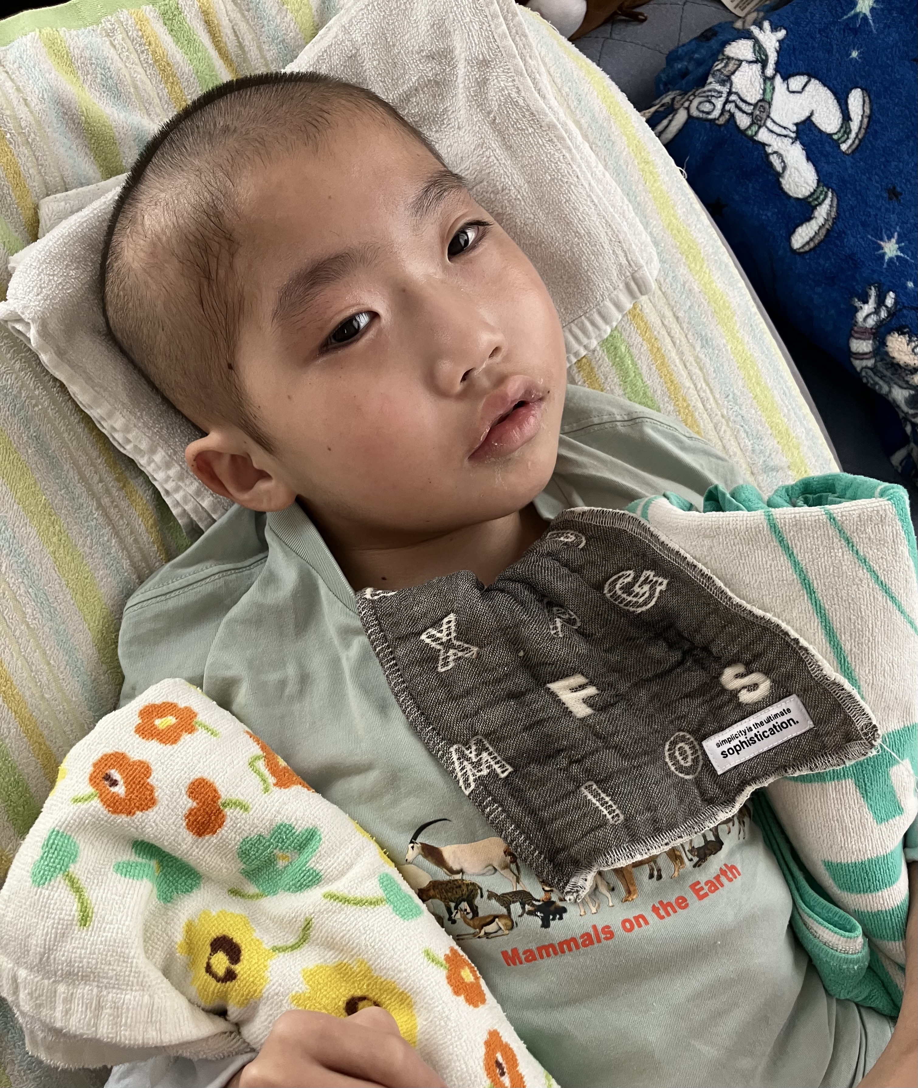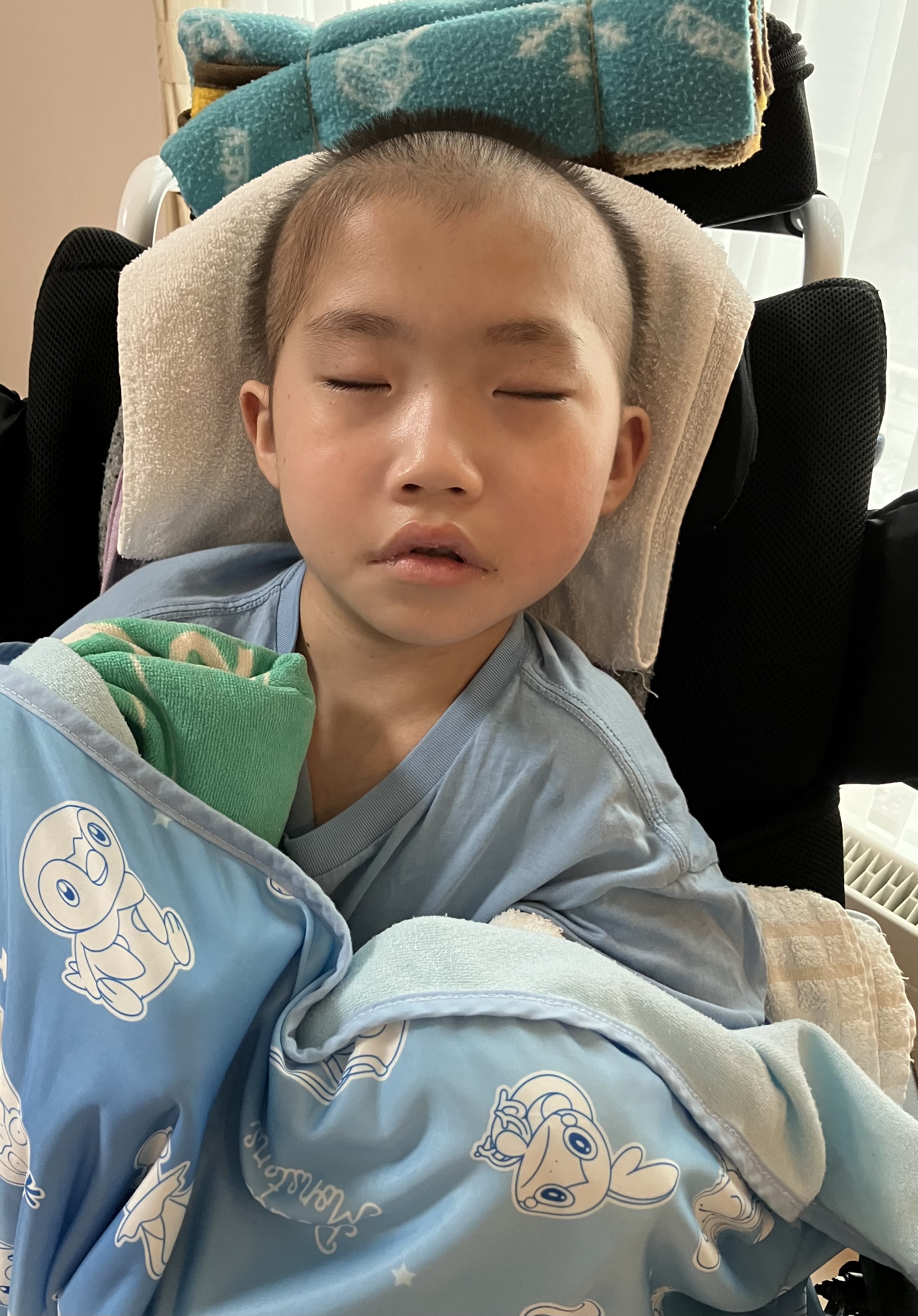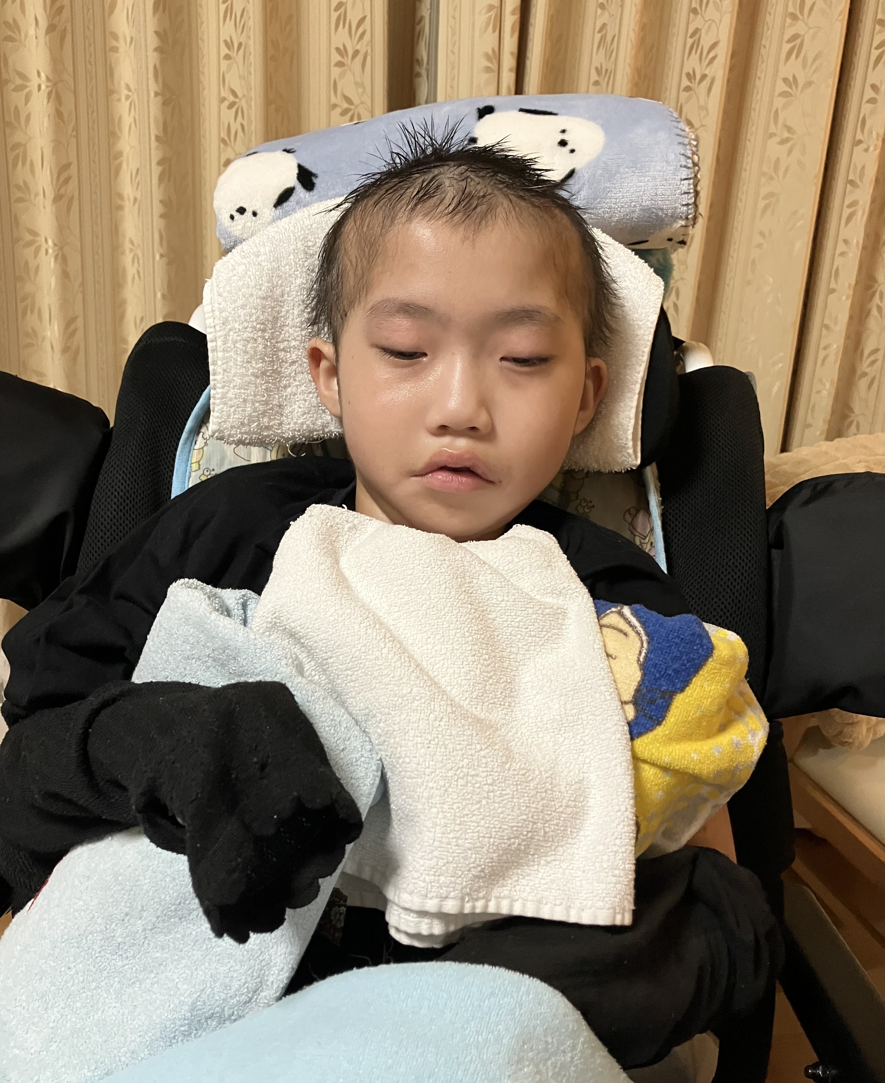 ~10歳長男🐻(小4)~昨日は、おうちでゆっくりした長男🐻午前中は訪問看護師さんにバイタルや全身状態等をチェックしていただき、午後からはシャワー浴もしてさっぱりしました😊全身の汗疹は少し良くなってきたので、このまま治ってほしいなと思います🙏日中は穏やかさんというか、逆に心配になるくらい静かでした💦手足もすごく冷たくて、お熱が出ないかハラハラしましが…ひとまず冷たくなった手足を温めるべく、レンジでチンするタイプの湯たんぽを足元に忍ばせると手も足もポカポカしてきて良い感じの体温になってきました😌 アイスノンと湯たんぽを長男🐻の状態・症状に合わせて使いわける必要があります😣昨日は久しぶりに訪問看護師さんやヘルパーさん、担当相談員さんにも会えて、賑やかな日でした😊長男🐻は熱もなく、夕方はいつもの泣き声が聞こえて、少し安心していると夜はぐっすり眠れていました☺️今日もおうちでゆっくりします😌