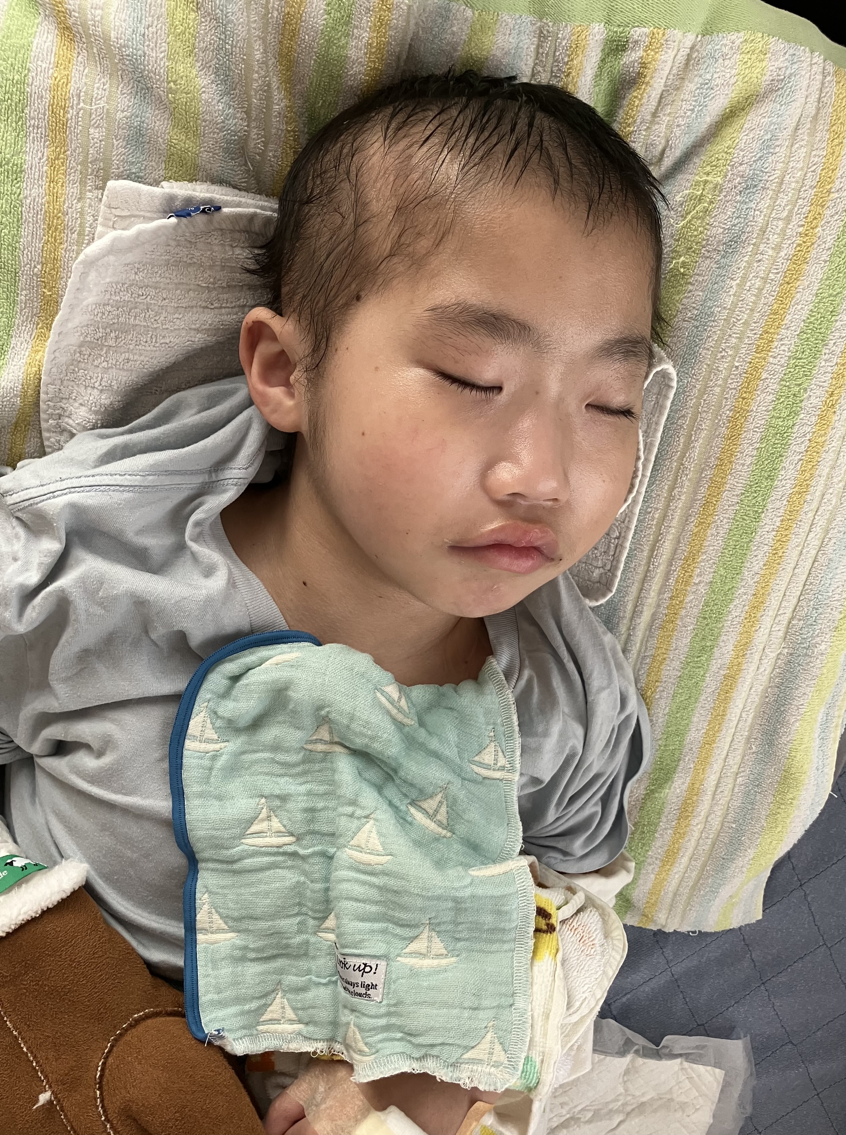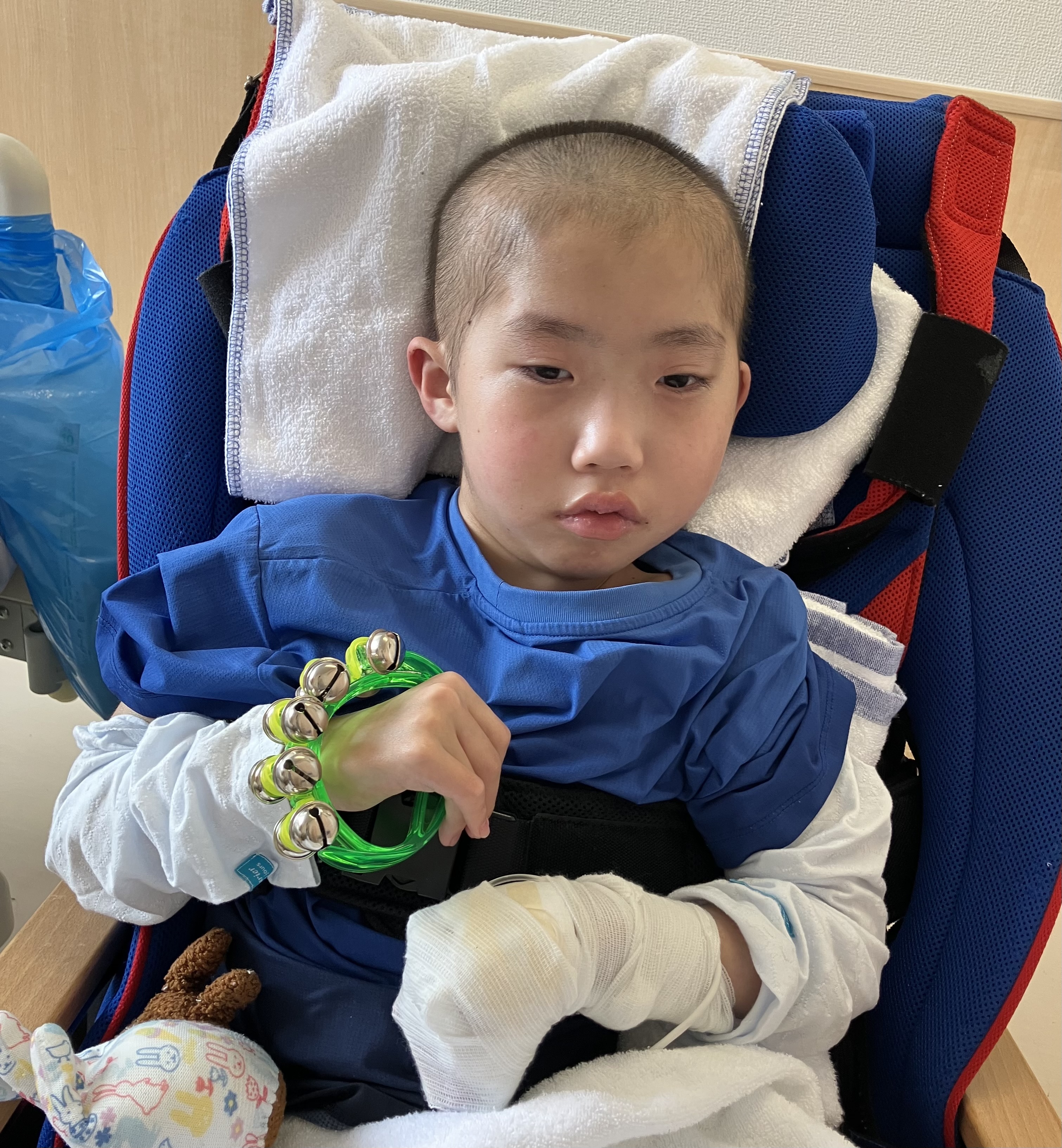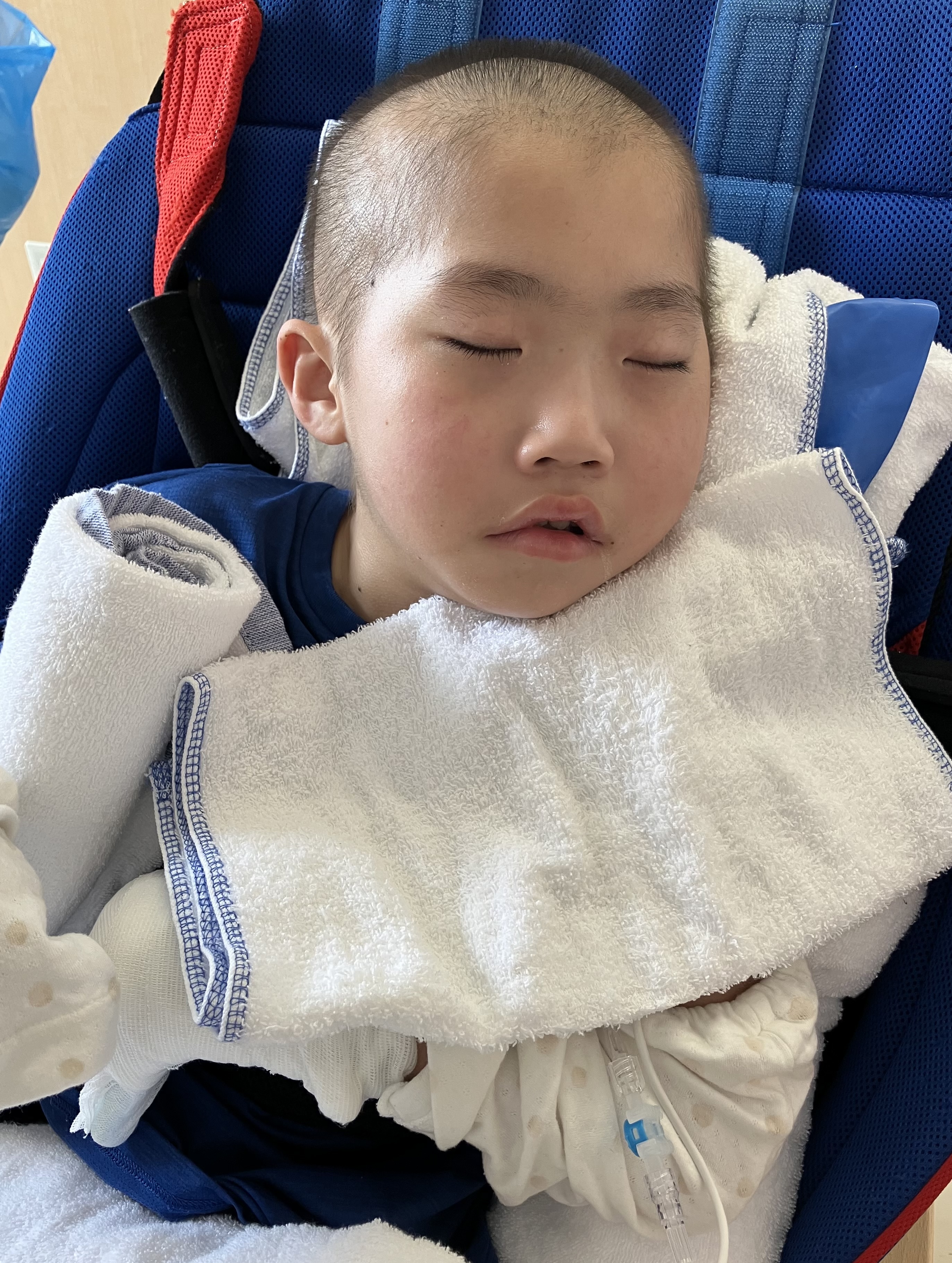 ~10歳長男🐻(小4)~昨日は、「肺炎」により入院した長男🐻前日40℃台キープだったお熱も抗生物質の点滴の相性が合ったのか昨日は体温36℃台後半とお熱はなし👍機嫌の悪い時間も多かったですが、目もぱっちりしてて、起きてる時間が多かったです。40℃もお熱が出た次の日は体がだるいのか、どこか痛いのか、突っ張りが強くなって日中はずっと泣いていました😢病み上がりはつらい😞そしてリハビリは入院初日から担当の理学療法士さんと作業療法士さんが来てくれて、さっそくリハビリ開始となりました。よろしくお願いします🙏酸素も日中は使わずルームエアーで頑張った長男🐻です。ちょっとだけお昼寝はしたけど、病棟の廊下全体まで声を響かせるほど泣いていた長男🐻でした💦寝入りは少し酸素飽和度が下がりますが、昨晩は酸素も使わずに寝れました。夜間1時に、ムセ込みありサクション頻回でした💦やっぱり夜間ムセ込む😣それでも、その後はスヤッと眠らていたので良かったです😌今日は機嫌も少し落ち着くかな?