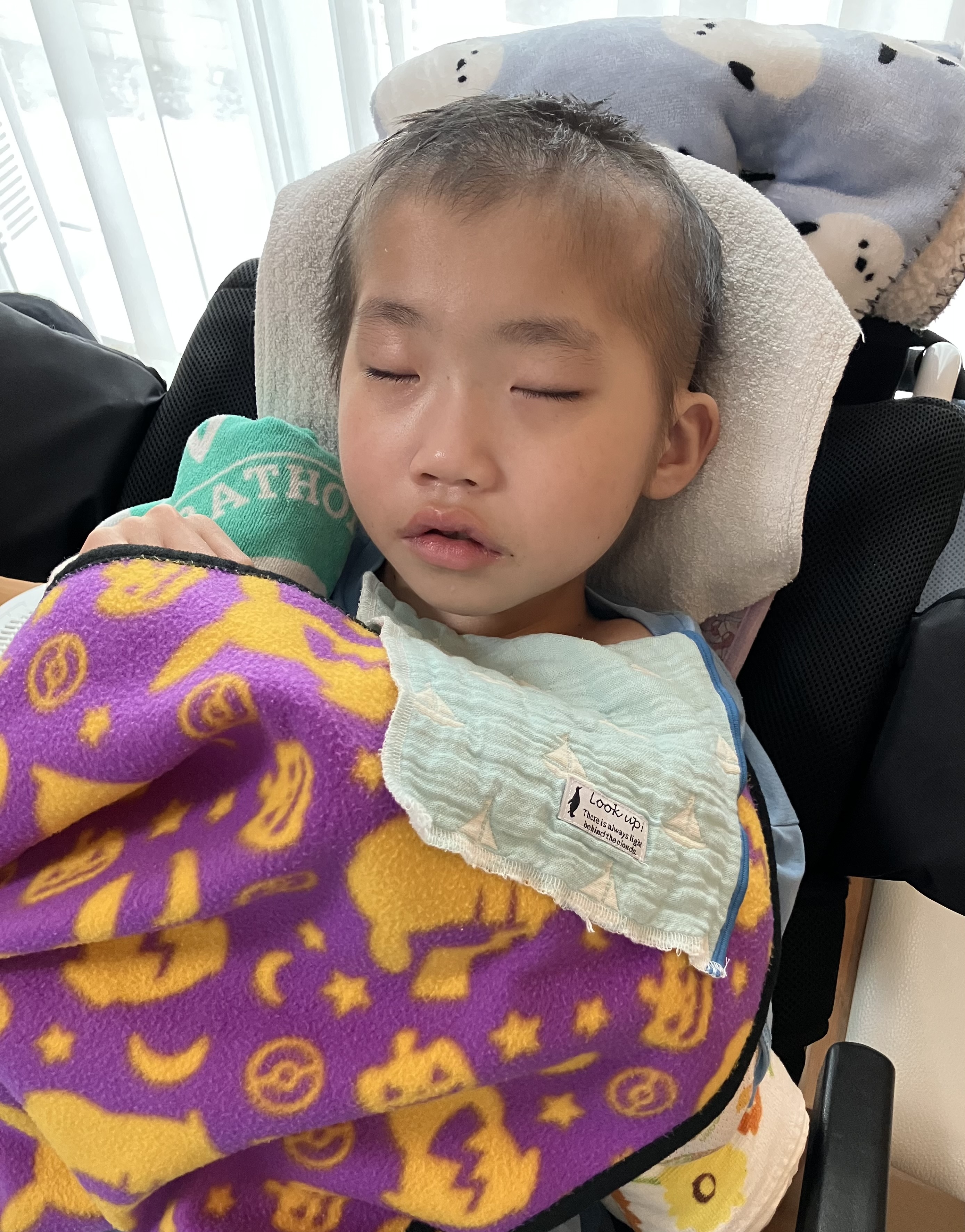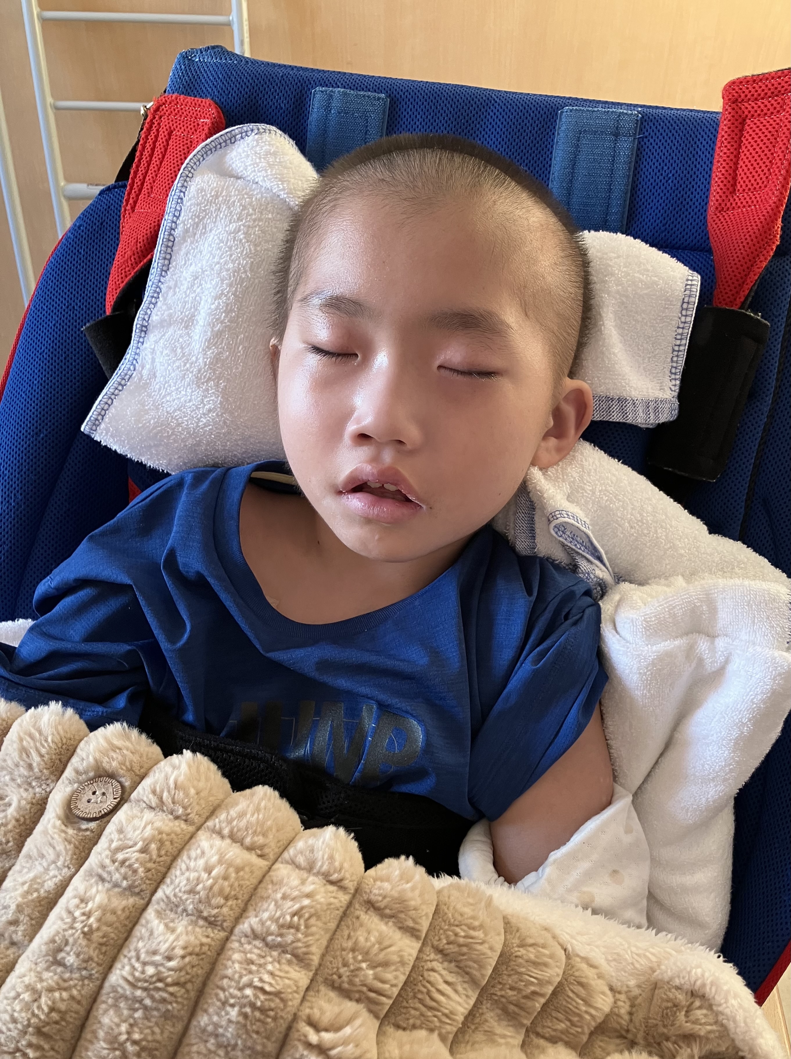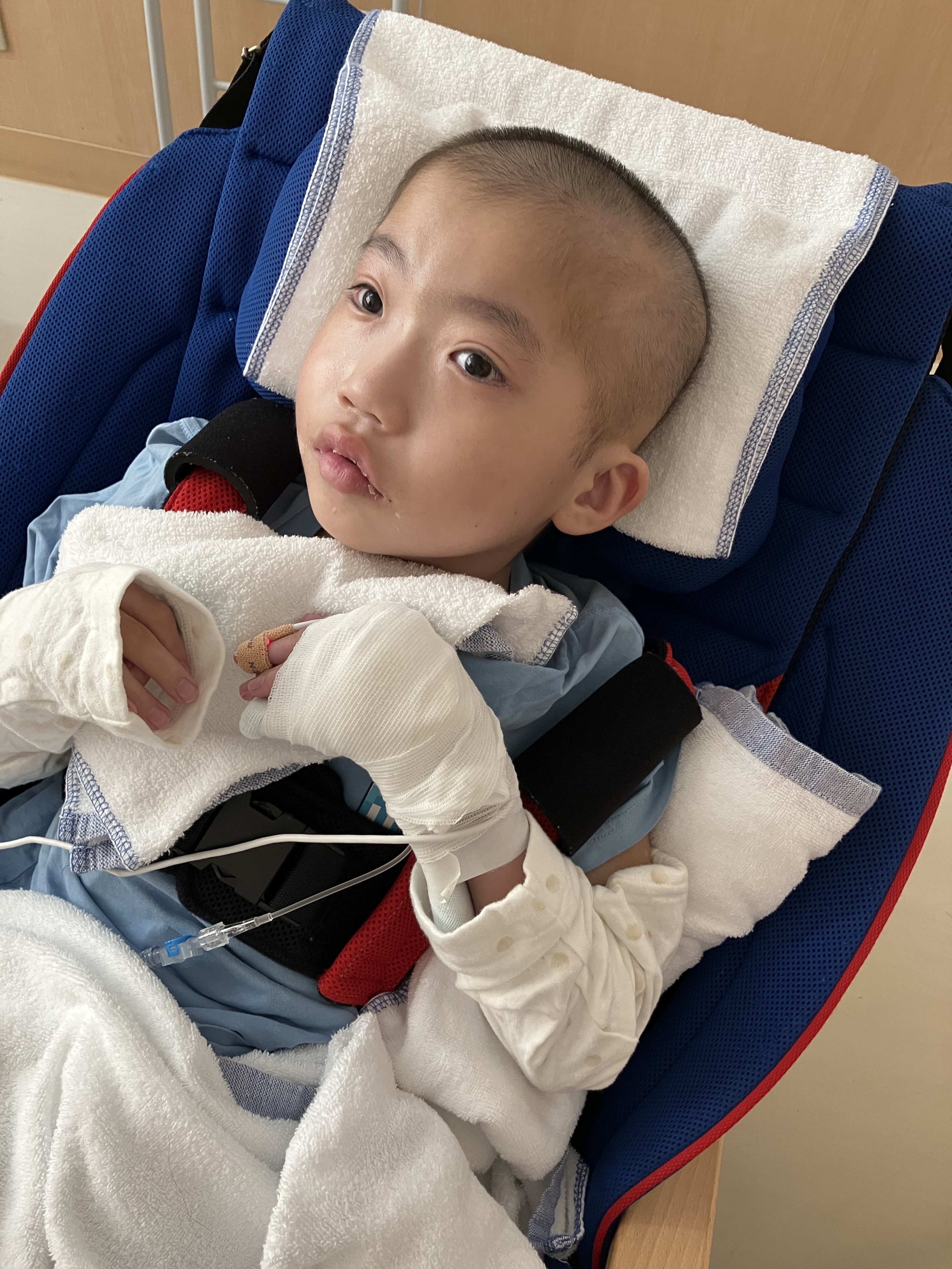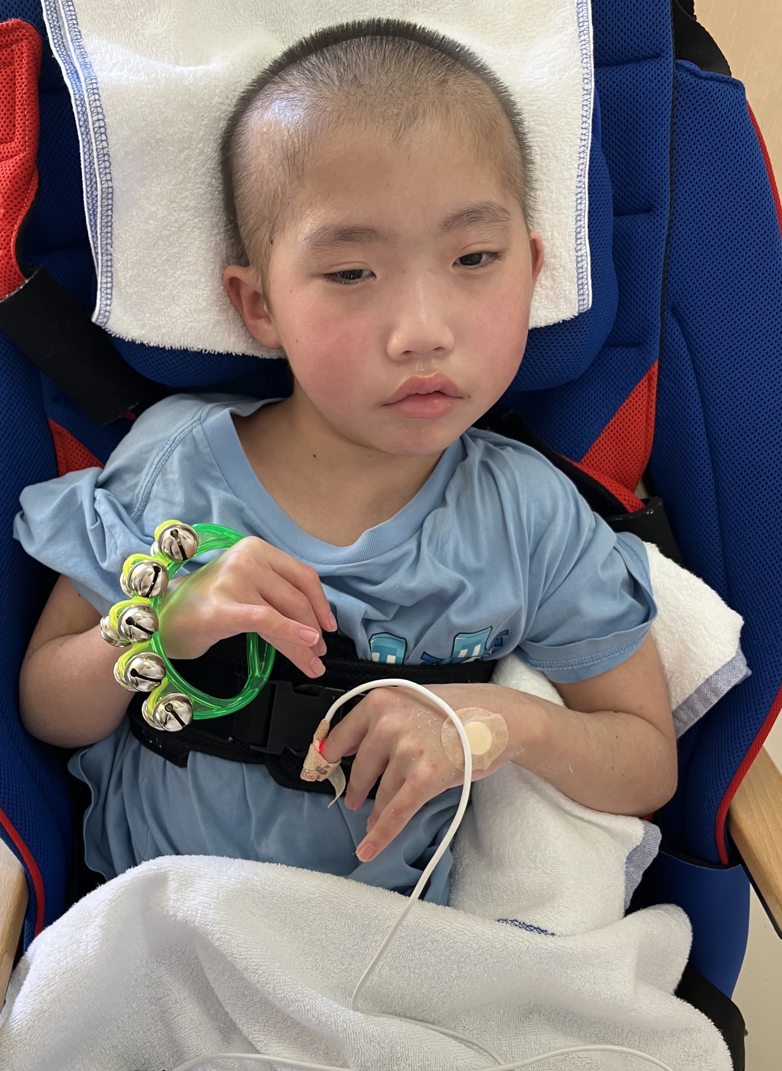 ~10歳長男🐻(小4)~昨日は、「肺炎」により入院した長男🐻前日40℃台キープだったお熱も抗生物質の点滴の相性が合ったのか昨日は体温36℃台後半とお熱はなし👍機嫌の悪い時間も多かったですが、目もぱっちりしてて、起きてる時間が多かったです。40℃もお熱が出た次の日は体がだるいのか、どこか痛いのか、突っ張りが強くなって日中はずっと泣いていました😢病み上がりはつらい😞そしてリハビリは入院初日から担当の理学療法士さんと作業療法士さんが来てくれて、さっそくリハビリ開始となりました。よろしくお願いします🙏酸素も日中は使わずルームエアーで頑張った長男🐻です。ちょっとだけお昼寝はしたけど、病棟の廊下全体まで声を響かせるほど泣いていた長男🐻でした💦寝入りは少し酸素飽和度が下がりますが、昨晩は酸素も使わずに寝れました。夜間1時に、ムセ込みありサクション頻回でした💦やっぱり夜間ムセ込む😣それでも、その後はスヤッと眠らていたので良かったです😌今日は機嫌も少し落ち着くかな?