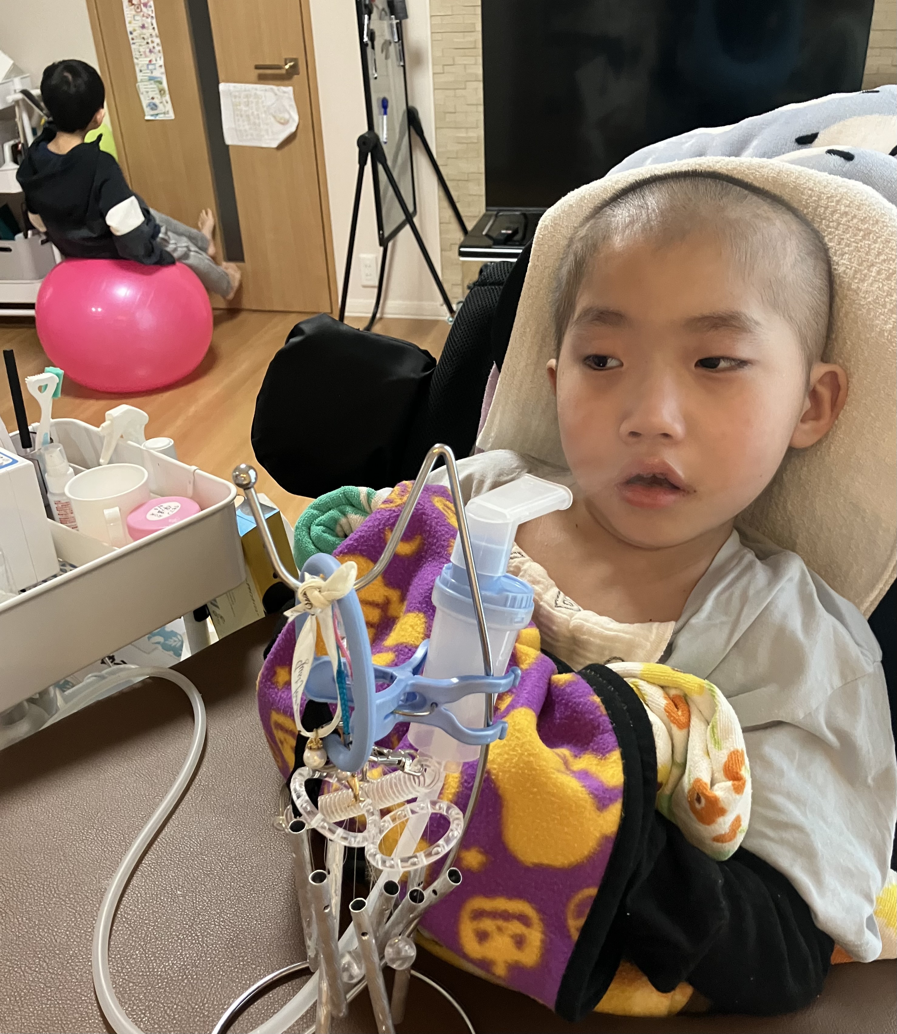 ~10歳長男🐻(小4)~昨日は、落ち着いたり泣いたりと感情がコロコロ変化しやすかった長男🐻熱もなく、夜間の嫌なムセ込みもなくて、体調的には良くなってきているなという印象です😊良かった😌吸入しながらリハビリをしたり、ルート等を管理しながらうつ伏せ練習をしたりと、一人では厳しくて無理なことでもリハビリの方と協力しながら痰を出すようにアプローチできるので、大変ありがたいです🥺そしてやっぱりリハビリ中の方が痰もしっかり出る👍うつ伏せ練習も昨日はちょっと機嫌が悪くて、泣きながらですが頑張ってた長男🐻でした💪お疲れ様でした😌土曜日と日曜日はリハビリもお休みなので、ママと頑張ろー💪