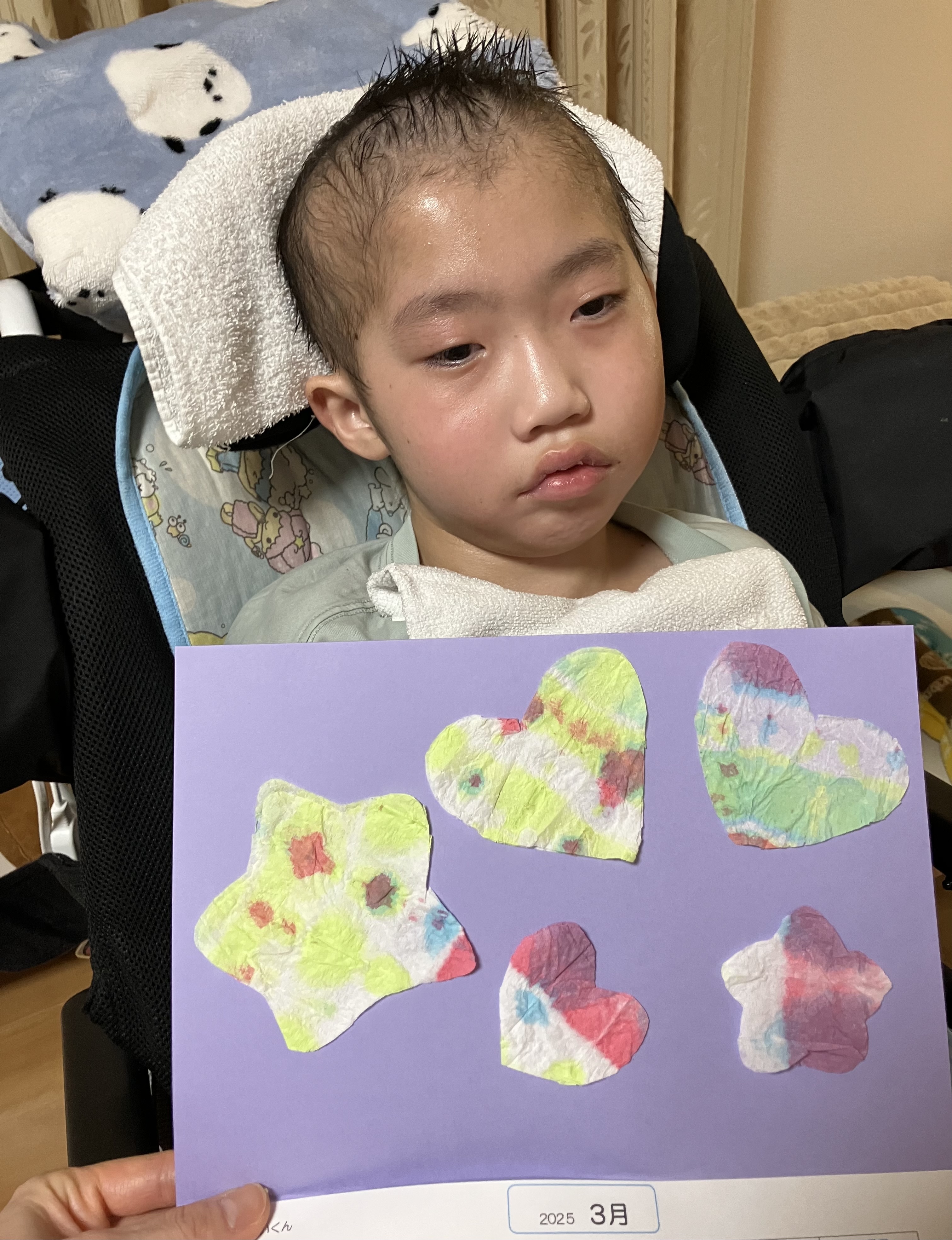 ~10歳長男🐻(小4)~昨日は学校🏫と放課後等デイサービス「fuwaRi」さんへ行った長男🐻🏫学校🏫先週は突っ張りが強くて機嫌が悪いことが多かったですが、今日は穏やかさんというかずっと眠そうにしていたとのこと😅筋緊張も緩んでて、しっかり股関節や膝関節が90°程度曲がるくらい力が抜けていたとのこと😊昨日は卒業式の練習があり、校歌を歌って手拍子をするとスーッと眠ってしまいそうになったいたそうですが、「起きてー」と肩を軽くゆすると起きて、お話を聞こうと頑張っていたとのこと(笑)教室では6年生にプレゼンするカード作りをしたそうです☺️🌻fuwaRi🌻活動では卒業制作をして、お友達の卒業に向けて桜柄🌸の折り紙を折ったとのこと😊今日は泣くことが多かったようで、抱っこや長座位でも泣いてて珍しいなーと話していました😥それでも帰る時に外に出ると泣き止んだそうなので、もしかしたら「暑い〜」って訴えていたのかもしれません😅こちらがちょっと室温とか暖かいなーと感じると長男🐻にとっては暑いようで機嫌が悪くなることも多くなります💦帰宅後はとっても眠そうにしていましたね😴今日は兄弟🐻🐒揃っての定期受診日です。長男🐻は、採血、リハビリ、主治医の診察、胃ろう交換、皮膚科、歯科受診予定🗓️次男🐒は、採血、眼科予定🗓️1日掛かりの受診になりそうです😅