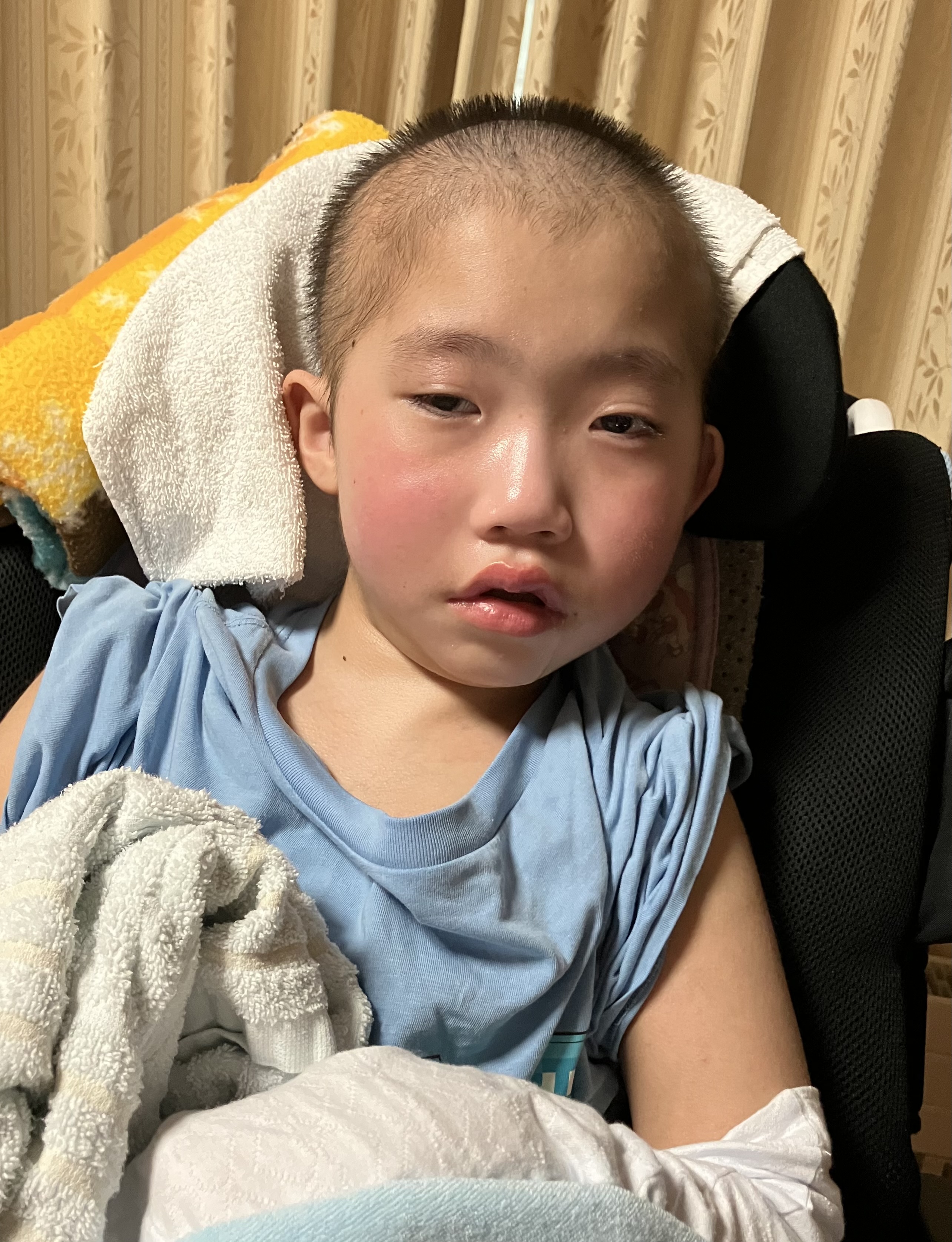 ~10歳長男🐻(小4)~前日から手足が冷たくて怪しいなーと思っていましたが…昨日は、朝から手足がキンキンに冷えてて訪問看護師さんにバイタルチェックしていただくと、体温38.6℃と発熱あり😱毎週木曜日前後に熱が出てて、今週はどうかな?と思っていましたが、やっぱり発熱😢表情もくったり💦日中は泣く元気もなかった💦本当になんの熱なんだろ…😣それでも夕方には37.1℃まで自力でお熱を下げていた長男🐻でした。熱が下がったら手足もポカポカになり、今度は暑いのか顔を真っ赤にしながら泣いていました💦今朝は37.0℃スタート👍このまま落ち着きますように🙏