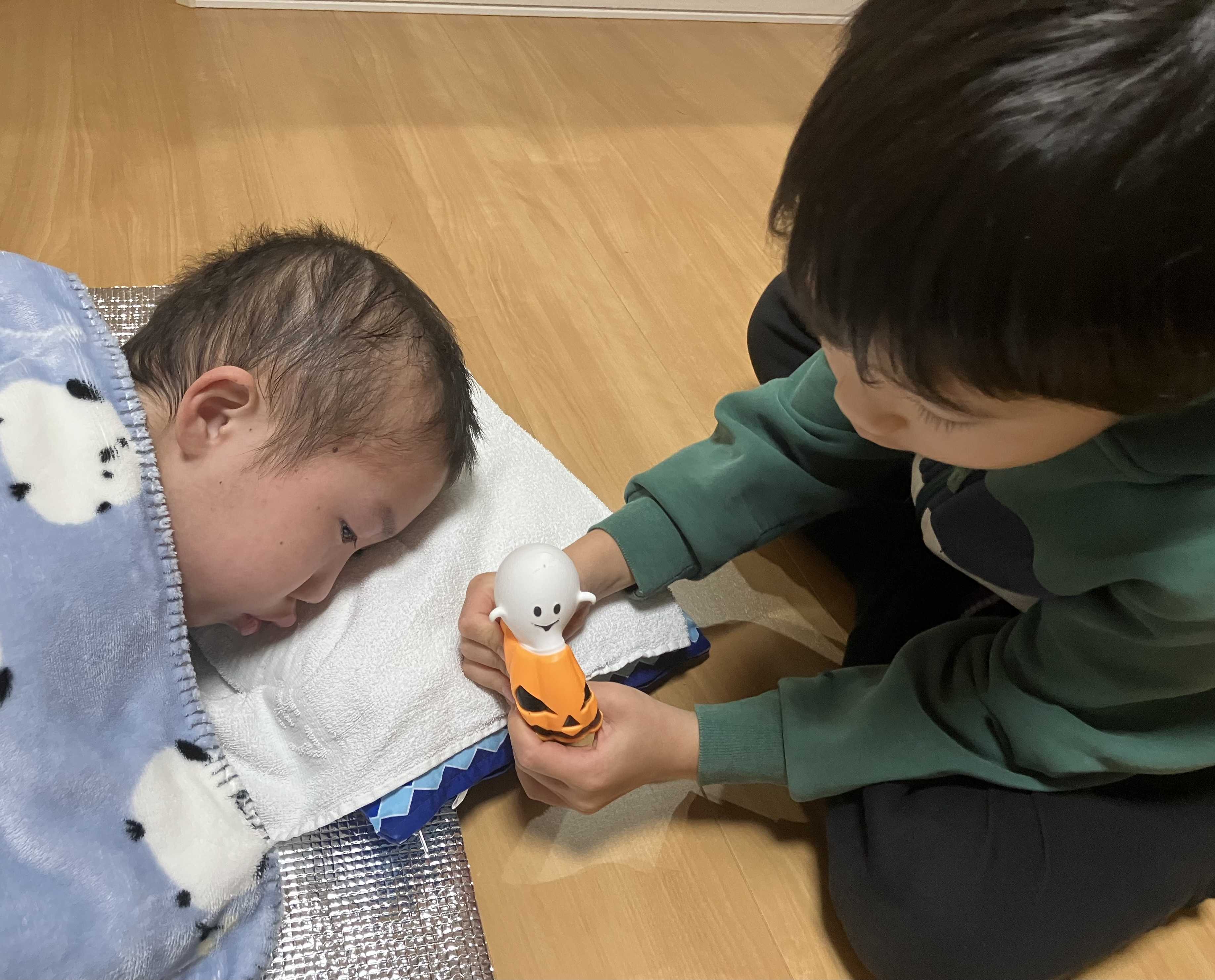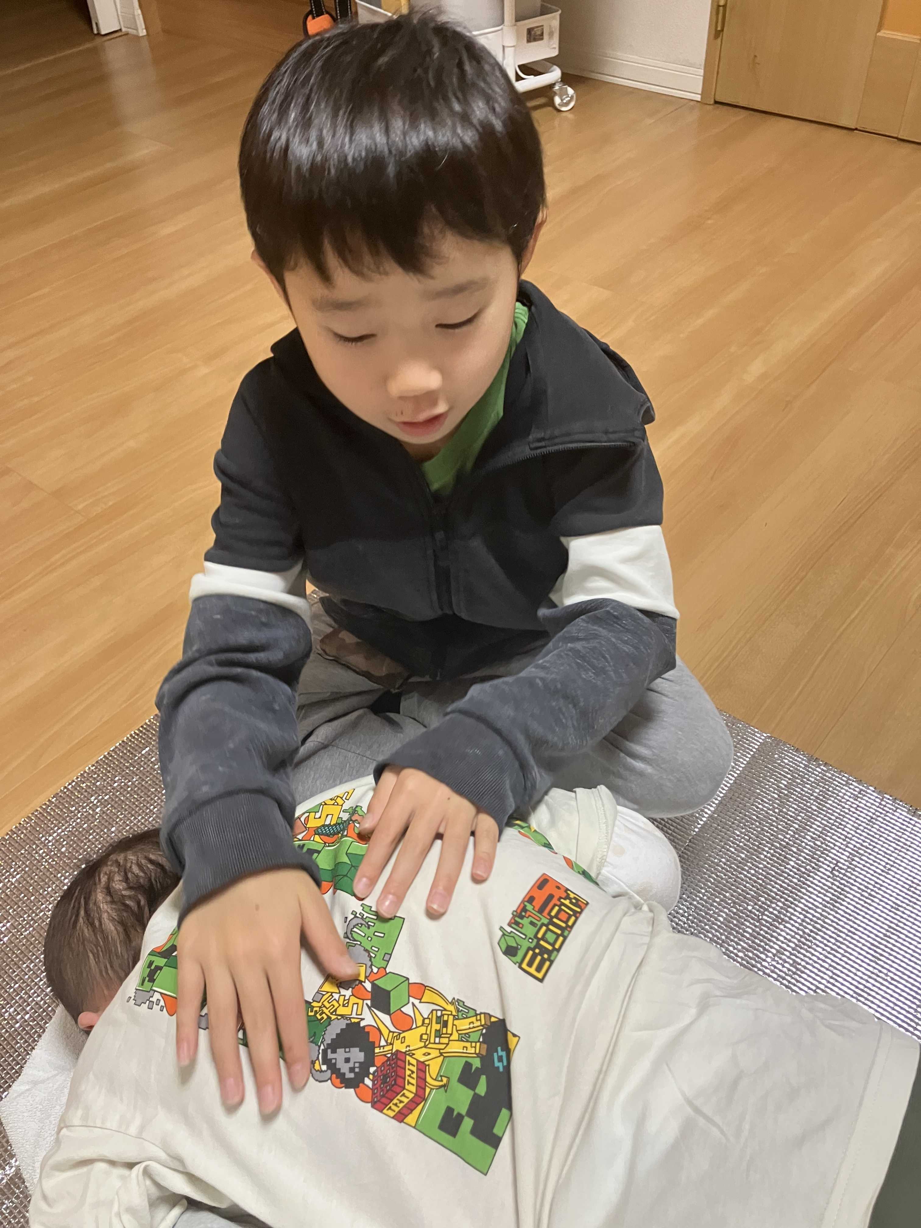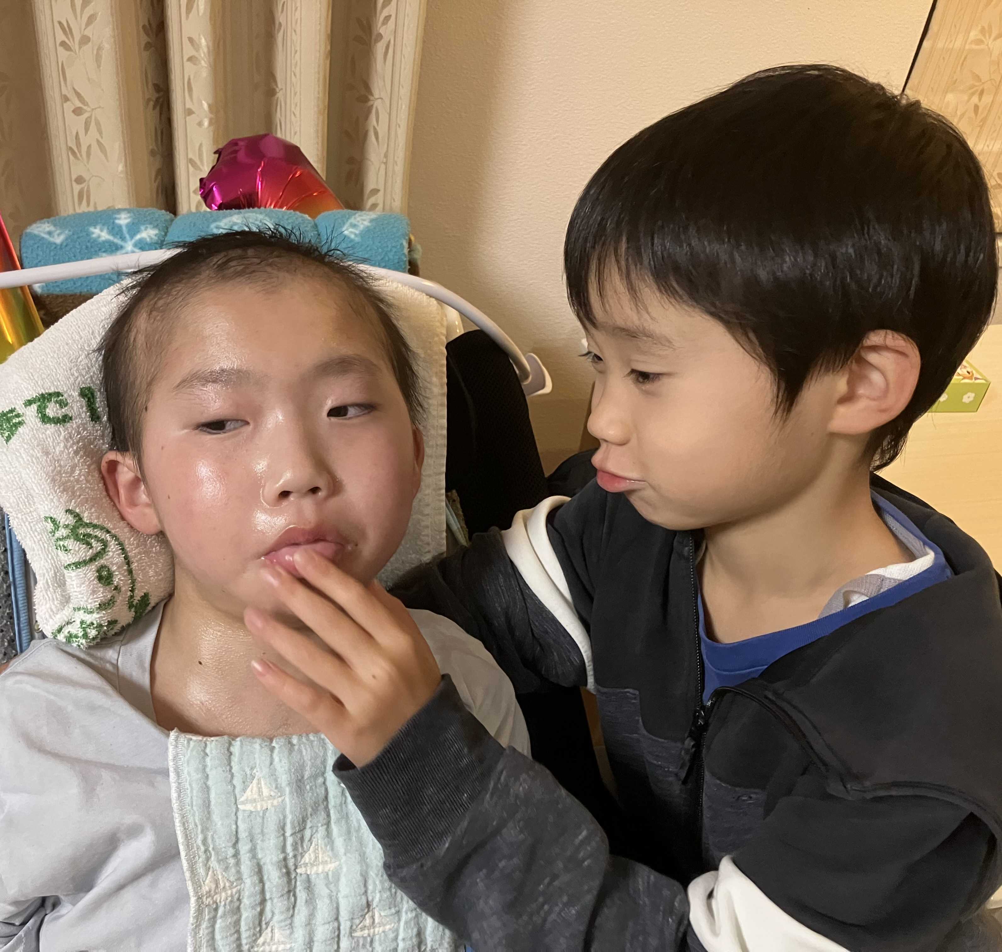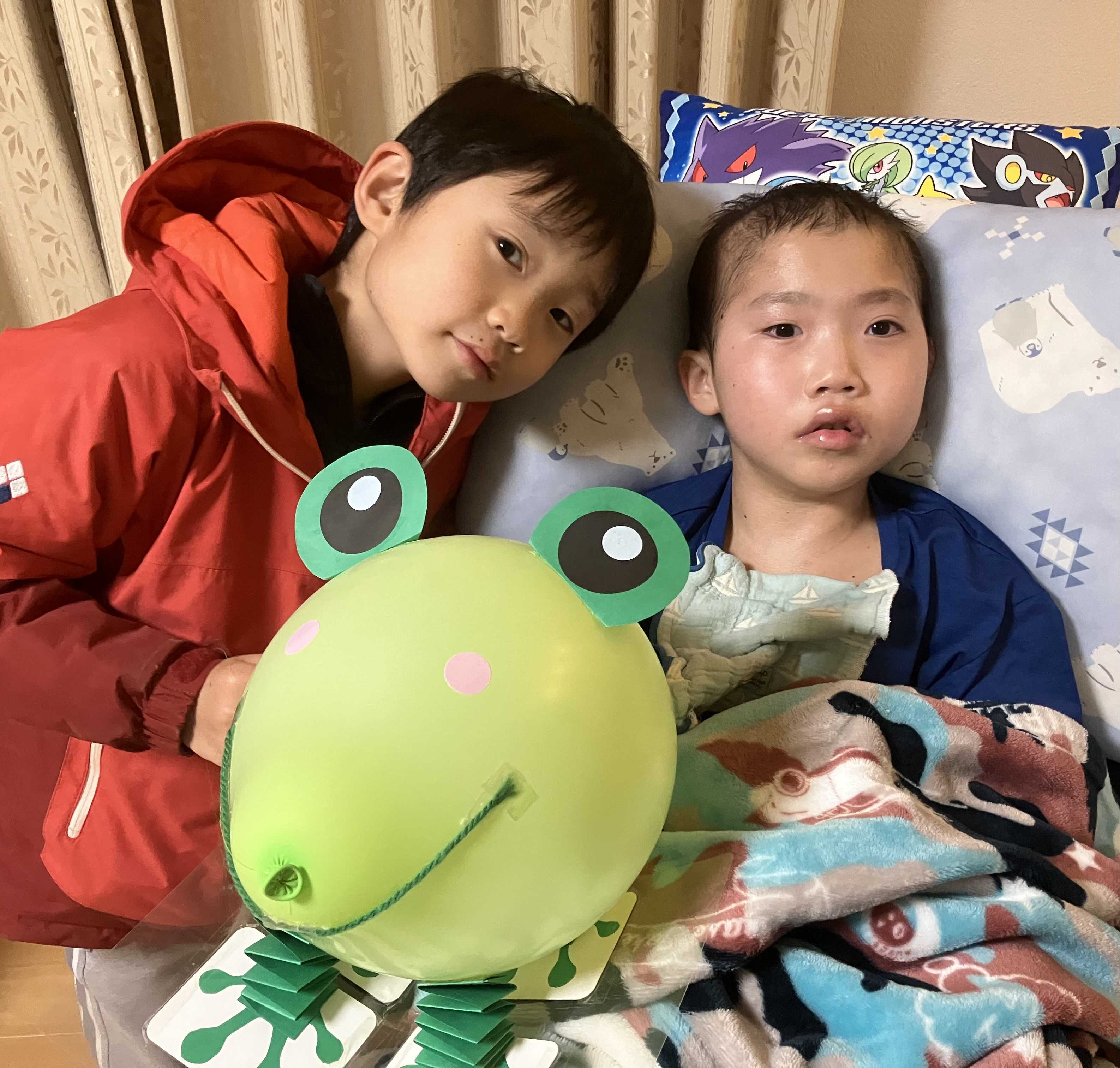 ~10歳長男🐻(小5)~昨日は、学校🏫と放課後等デイサービス「どんぐりコロコロ」さんへ行った長男🐻学校🏫では、痰がらみはありましたが、タイミング良く、咳き込んでくれてスッキリ痰が取れると穏やかさんに過ごせていたそうです😄音楽では学習発表会に向けて練習したそうで、「すうじの歌」でペープサートを握って、自分の番になると顔を上げて練習に取り組んでいたそうです😊給食後には、声を出してしばらく🌟笑って🌟いたそうで、みんなで楽しい気持ちになったとのこと🥺トイレも尿瓶で成功したようです👏👏👏すごい👍どんぐりコロコロさんでは、前回に比べると痰も落ち着いてて、穏やかさんに過ごせていたとのこと👍リズム運動にも参加して楽しんだそうです😄家でも最近笑ってないから笑ってほしいーあとは🌟笑顔🌟の後に不調になることが多いので、今回はそのジンクスを打ち破ってほしい👊頑張れ長男🐻💪そしていっぱい🌟笑って🌟ほしい🙏↓帰宅後のうつ伏せ時に、背中をトントンして排痰を促してくれる次男🐒😄