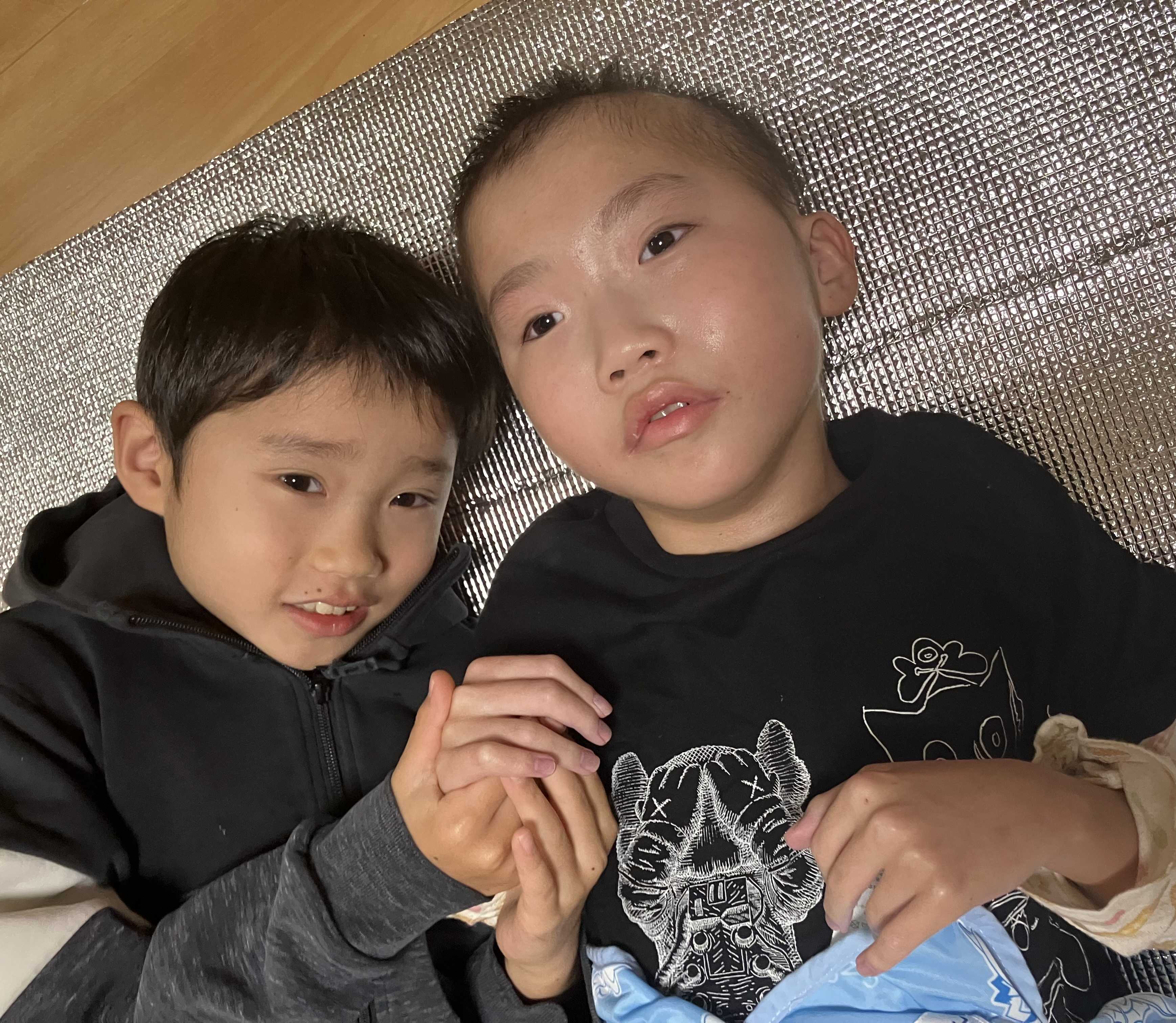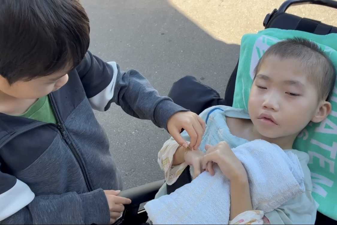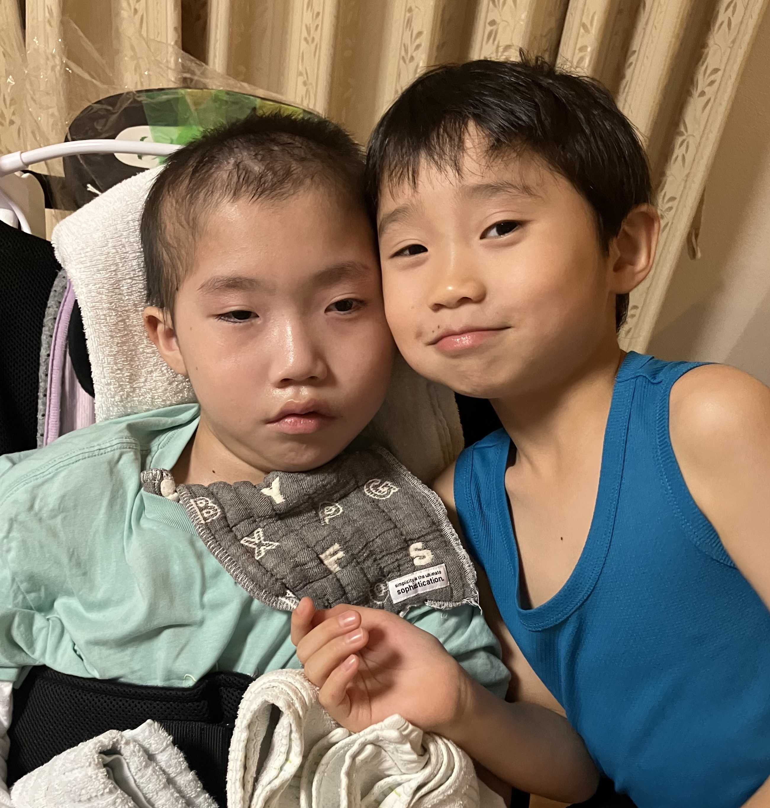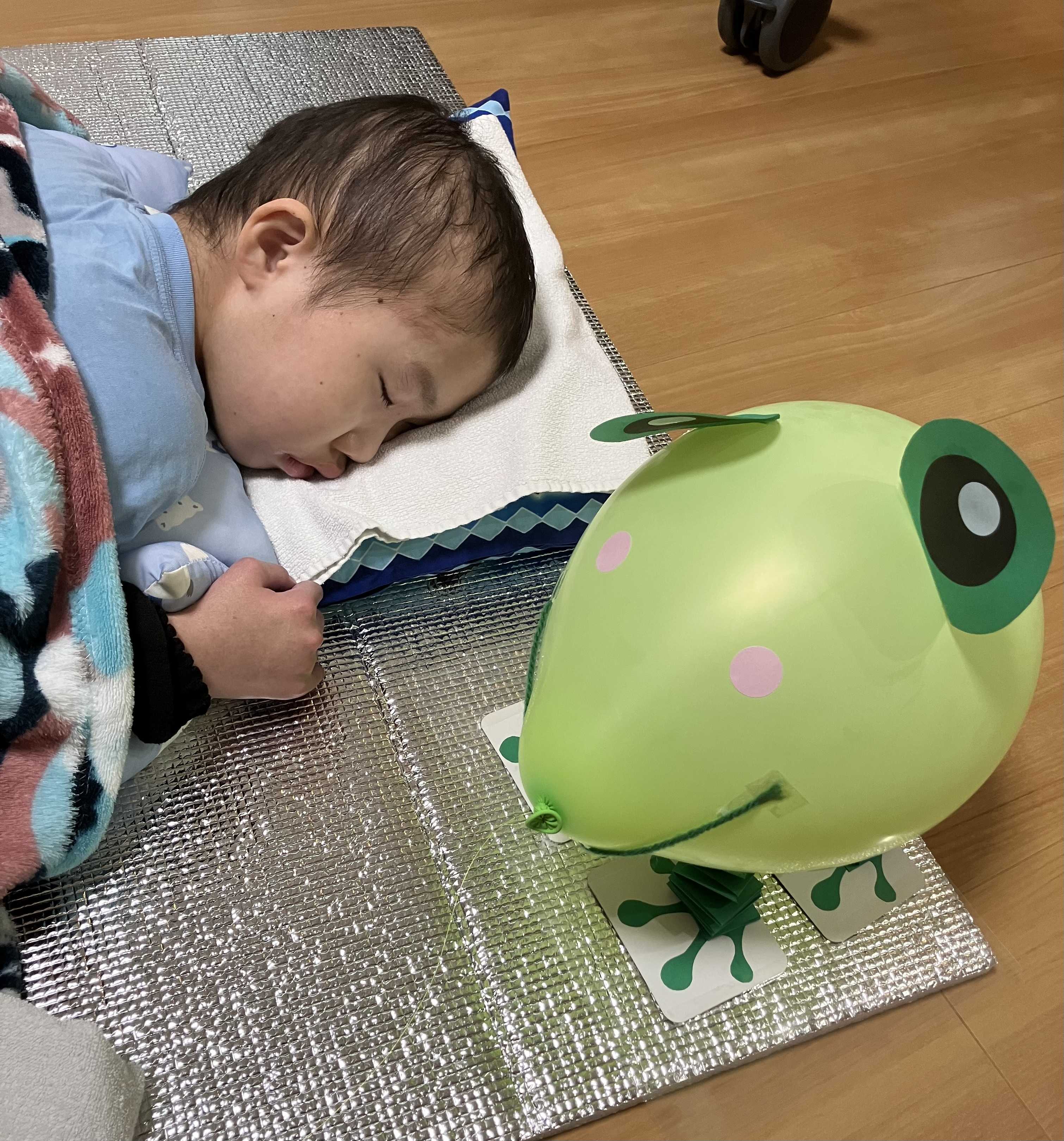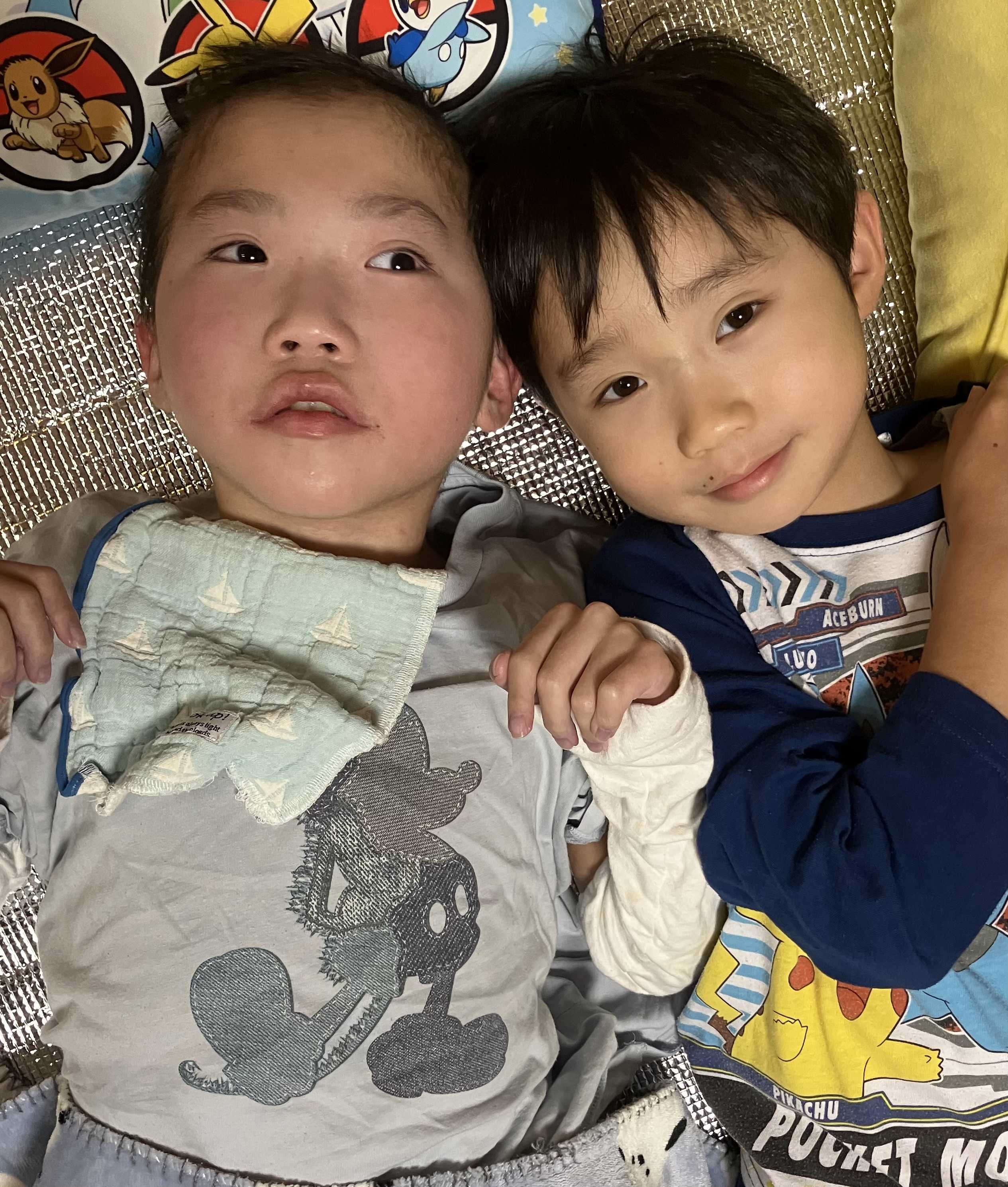 ~10歳長男🐻(小5)~昨日は、学校🏫と放課後等デイサービス「どんぐりコロコロ」さんへ行った長男🐻学校🏫では、痰がらみはありましたが、タイミング良く、咳き込んでくれてスッキリ痰が取れると穏やかさんに過ごせていたそうです😄音楽では学習発表会に向けて練習したそうで、「すうじの歌」でペープサートを握って、自分の番になると顔を上げて練習に取り組んでいたそうです😊給食後には、声を出してしばらく🌟笑って🌟いたそうで、みんなで楽しい気持ちになったとのこと🥺トイレも尿瓶で成功したようです👏👏👏すごい👍どんぐりコロコロさんでは、前回に比べると痰も落ち着いてて、穏やかさんに過ごせていたとのこと👍リズム運動にも参加して楽しんだそうです😄家でも最近笑ってないから笑ってほしいーあとは🌟笑顔🌟の後に不調になることが多いので、今回はそのジンクスを打ち破ってほしい👊頑張れ長男🐻💪そしていっぱい🌟笑って🌟ほしい🙏↓帰宅後のうつ伏せ時に、背中をトントンして排痰を促してくれる次男🐒😄