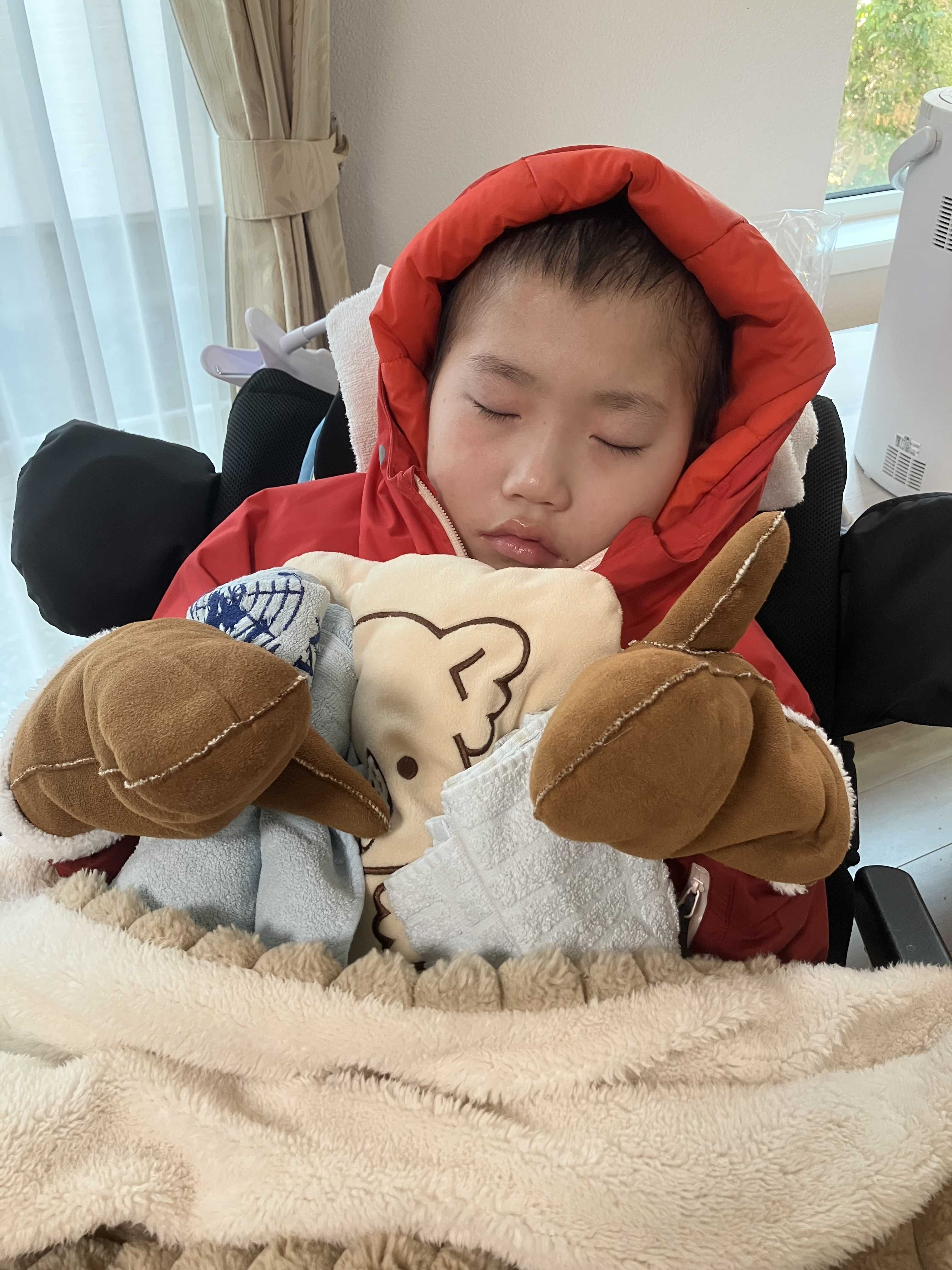 ~10歳長男🐻(小5)~昨日は、学校🏫へ行った長男🐻通学前のお仕事をして、寝てる 笑お外も息が白くなるくらい寒くなってきて…外気温低下と共に長男🐻の手足もキンキンに冷たくなるので、しっかり防寒して行きます💪学校🏫では、学習発表会の練習があり、カスタネット担当の長男🐻は演奏の時に、スイッチを触った状態で力を入れたり、緩めたりして音を鳴らしたとのこと😊曲(かえるのうた)が流れると、口も一緒に動かしていたそうです🤭一緒に歌ってたのかな?👀午後からは宿泊研修時のビデオを見て、宿泊研修で頑張ったことを先生と一緒に発表したとのこと😳宿泊したふるるさんにお手紙を書いたり、宿泊研修後に報告会?で発表したりと宿泊研修前後の学習もいっぱいあって…すごいですよね👀宿泊研修の時のビデオぜひみたいですね🥰痰は相変わらず多め💦今日はゆっくりおうちで休みます💪金曜日の学習発表会には行けるのかドキドキ🙄
