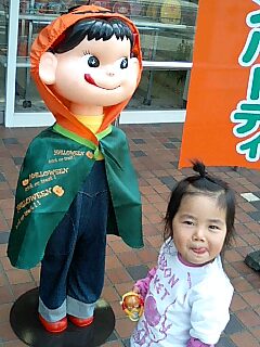 朝からケーキを買いに行ってきました。ペコちゃんを見るなり「可愛い~。だーいすき。」と抱きついていました。最後はペコちゃんと同じポーズでカシャ。