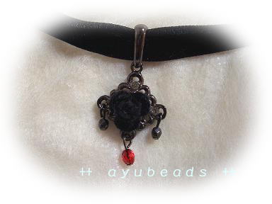 黒のベルベットリボンでチョーカーを作りました。ペンダントトップに同じ素材のバラを...赤のbeadsが効いています。パーティーシーンにも活躍しそうですね^^サイズは約33~38cm。Shop販売価格 3,675円 (税込み)ayubeadsはLove Four Shopで販売しています☆←応援クリックお願いします♪