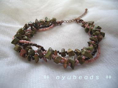 久しぶりの製作です^^ウナカイトのさざれ(天然石)をふんだんに使ったブレス...天然石だけだと硬い感じがしてしまうので、丸小beadsを入れました。2連のウナカイトを作り、一方は茶系のbeads、もう一方は淡いピンクのbeadsを入れました。淡いピンクを入れたウナカイトの方に、2連(茶、ピンク)のbeadsを巻きつけるようにしました。(チェコbeadsも使用)こんな感じで、少し甘さを出したのですが...いかがでしょうか??サイズは19~23cm。Shop販売価格 3,045円 (税込み)このアクセサリーはLove Four Shopで販売しています...←応援クリックお願いします♪