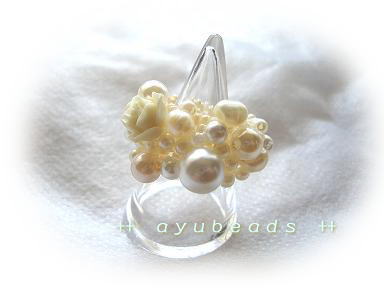 先日ご紹介したネックレスとセット使いできるように作りました。色をホワイトにまとめ、いろんなパールの表情を楽しめるように。樹脂バラも主張しすぎず、上品で優しい感じのリングです♪サイズは約15号です。(淡水パール、スワロフスキーも使用。)Shop販売価格 2,310円 (税込み)ayubeadsはLove Four Shopで販売しています☆↑応援クリックお願いします♪→