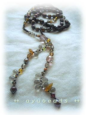 ラリエットはいろんな形にしてつけられるのが魅力ですよね。結んだり、二重にしてみたり...使い方はいろいろです!いろんな表情に変身します!今回は、淡水パールのブロンズカラーにあわせたカラーのbeadsたちを使いました。(スワロフスキー、チェコなど)垂らす部分の左右のバランスを考えて、わざとbeadsの配列を崩してみました。長さは約100cmです。Shop販売価格 4,725円 (税込み)ayubeadsはLove Four Shopで販売しています☆↑応援クリックお願いします♪→