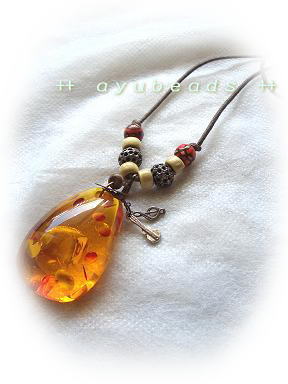 これ、アンバーに見えますか?本物ではありませんが、結構リアルです。ウッドbeadsやメタルbeadsでアジアンな感じを出しました。少し遊び心もプラス。サイズは約63cm。アンバー調のペンダントトップは4.5×3cm。Shop販売価格 2,415円 (税込み)ayubeadsはLove Four Shopで販売しています...←応援クリックお願いします♪