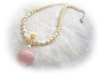 パールのもつ優しさを表現してみました。いろんなパール(淡水パール、スワロ、チェコ)のそれぞれが持つ質感や色を楽しんでほしいです...途中、オフホワイトのbeadsで編んだパーツを入れてさらに優しい雰囲気を出しました。ハートのローズクオーツ(天然石)をペンダントトップにし、バチカン部分もbeadsで編みました。最初は金具タイプのバチカンで作ったのですが、この優しい雰囲気が崩れてしまって...試行錯誤した結果、ネックレス部分のbeadsパーツと統一感をもたせました。このペンダントトップは取り外しできるんですよ^^いろんなシーンに対応できるように...(いっぱい身につけて欲しいんです☆)ペンダントトップはこんな感じです。オフホワイトやベージュのベルベット調のリボンを通すとカワイイかも♪サイズは38~43cm。Shop販売価格 4,725円 (税込み)ayubeadsはLove Four Shopで販売しています☆↑応援クリックお願いします♪→