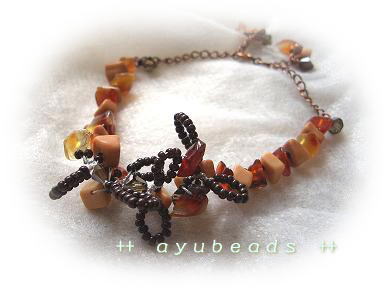 このブレスのイメージは『秋』...ナイロンコートワイヤーを使い、ワイヤーならではのねじりを効かせました。アジャスターもデザインの一部にしましたよ^^天然石のさざれを2種類使ったのですが、カーネリアンともう1種類はわかりません<(_ _)>ハワイで購入してきたのですが、いろいろと調べてみたものの名前がわからず...←スミマセン<(_ _)>色はキャメルっぽく、マットな石です。スワロフスキーも使用しています。サイズは約17~21cmです。Shop販売価格 2,940円 (税込み)ayubeadsはLove Four Shopで販売しています☆←応援クリックお願いします♪