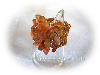 とてもボリュームのあるリングです。カーネリアンのさざれの表情を生かしました。リング部分を少し太めにし(約1.4cm)、指にフィットする感じに仕上げています。カーネリアンの色にあわせ、ダークゴールドのbeadsで編みました。サイズは約12号です。(サイズ変更できます)Shop販売価格 2,100円 (税込み)ayubeadsはLove Four Shopで販売しています☆↑応援クリックお願いします♪→