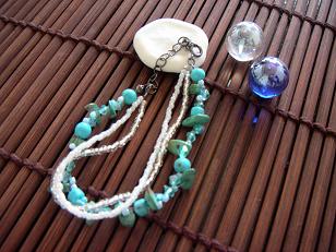 このbeadsは...ターコイズカラーのbeadsを数種類組みあわせ、白、クリアーのbeadsで3連にしてみました。