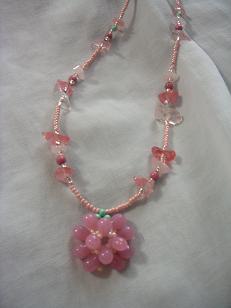 ローズクォーツ、チェーリークォーツ、ロードナイトなどを使用し、ピンクカラーにスパイスとして淡いエメラルドグリーンをプラス。