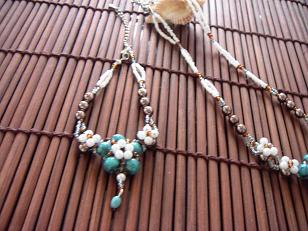 ターコイズカラーでお花を作り、サイドにもホワイトパールでお花を...