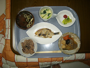 杏ちゃん今日で100日です なのでお食い初めを我が家で行いました メニューは赤飯煮物鯛の塩焼きお吸い物漬物、梅干茶碗蒸しです 結局ほとんど母が作ってくれました これから先杏ちゃんが一生、食べ物に困らないように…