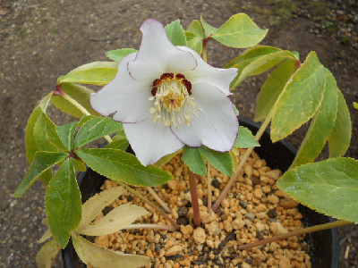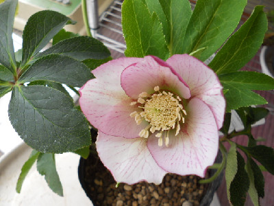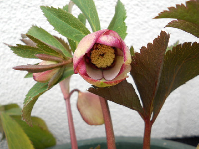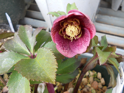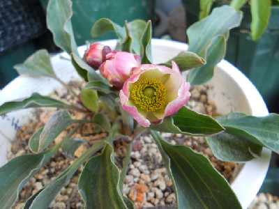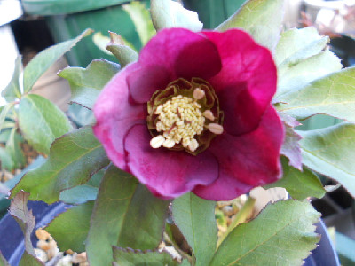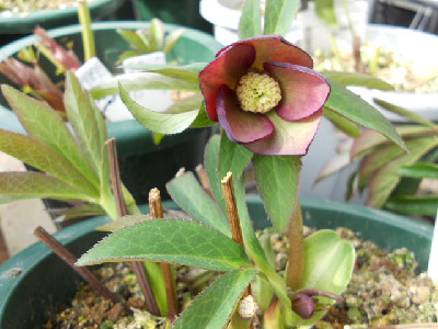 今日も寒くって雪がちらほらと降っていて外には出られませんでも、毎月来られる集金の方が来て外のお花が咲いているのを見たくって、仕方なく出て行きました。本当に寒かったですよ、早く帰って欲しいのですが一通り見て回らないと、気が済まないのでしょうねどんなお花が咲いてるか咲いてたら『欲しいなあ』ですご自分で購入して欲しいです『今度は何を貰おうか』って思ってるのでしょうね。わたしの性格だとそんなのキライです、何時も人から貰ってばかりの可哀想なお方だなあと思います そんな時に我が家で咲いたクリスマスローズ4鉢目を見つけましたよ。小輪sdレッド系、ネクタリーグリーンで中色有りいまスキになっているsdの一番め開花です。これからはsdが咲いてくると思います、嬉しいなぁ