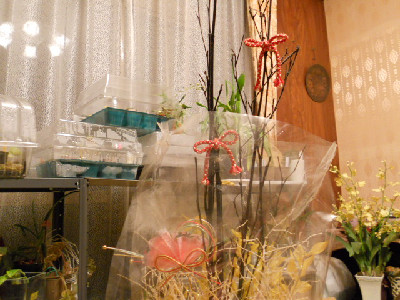 昨日の天気予報では、今日は雨降りだったのですが久し振りにいいお天気で、最高気温5℃ない時は外に出られなかったのですでも、始動が遅いのでクリローの鉢を見てまわっただけ。。。お昼過ぎでは水遣りも出来ません10時頃までに遣らないと鉢の中に水分が残って朝、鉢の中が凍ってしまうからです。鉢を見ていると2鉢濡れていて、鉢の上にノラネコでも上がって匂い付けにお○○○をしたのかなあって思いますそれなら枯れてしまうと。。。。。萎れてる鉢が多いので、明日は頑張って液肥遣りしないと今日は咲いているお花がありません、ごめんなさい これはわたしがもう少し若い時に頑張って作った物です。入り口に牡丹の絵を飾っているのがいいそうで、前に熨斗やさんが言っていました。。。人が来易いそうです。絵や掛け軸ではありませんが、右と左に刺繍額を飾っていますお花が咲いてないと何を載せるか解りませんよ。文章だけだと変が無くて、文才無いのですみません
