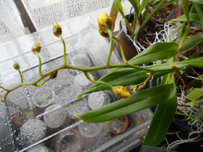 今日は曇り空でしたが最高気温低くなかったので少しは凌ぎ易かったですよ。血圧の低い方も朝起き大変でしょうが、わたしの様に高くっても寒い時はゆっくりと起きないと心臓に負担掛かりますその代わり、夜は遅くまで起きていられるのですよ。だから、始動はどうしても遅くなりますが、今日は頑張ってクリローの液肥遣りをしました昨年から寒かったからでしょうか、お花の蕾が見えているのですが、中々蕾があがってきません。今から咲く事は無いの解ってても、蕾が見えてるから開花待ち遠しいですね殆ど蘭のお花は育てるのをやめましたが、家にミニカトレアとデンドロオンシを少し持っています。前はシンビジュームもありましたが、葉っぱが広がって大きな鉢だと家の中で、邪魔になっていたのでやめました まだ、蕾ですがオンシの黄色の色に元気貰えるので一番蘭の中では好きなお花です余り管理せずに肥料も遣ってないのですが、毎年お花が一本出て咲いてくれます。。。今年は根が沢山外に出ているので植え替えしないと。。。それか株分けでしょうか? 春に暖かくなったら頑張ろうと