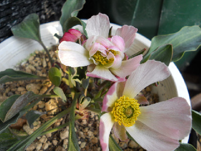 明日は雨降りのようで今日は温度あるのだけど、いいお天気ではなく体感温度が寒く感じられます。息子が出張から帰ったので洗濯物多くって、今日は乾きませんね。外に出たので久しぶりにどうなってるかクリローの種蒔きを見てみると、幾つか芽が覗きそうで土が持ち上がってきていましたよ。後の管理が悪いので何時も失敗していましたまだまだ全部覗いてはいませんよ、双葉にもなってないので。。。先日載せましたハゴロモキンポウゲの二番花が咲いているのですが、ちょっと変わって咲いていたので見て下さいね ちょっと可笑しいでしょう、普通は5枚花弁です。また、中に小さな花弁見えてるでしょう、sd、ddになるのかな変わっていたら、また可愛いよねサクラソウ科の冬咲き、原種シクラメン コウムです。葉っぱがシルバー掛かって、秋咲きよりお花が濃いローズ色です原種シクラメンが葉っぱも綺麗だし、お花も可愛いので今年はいい鉢に、植え替えしてあげるとポットより、可愛くなるでしょう地植えもいいみたいです、群生すると綺麗でしょうね。