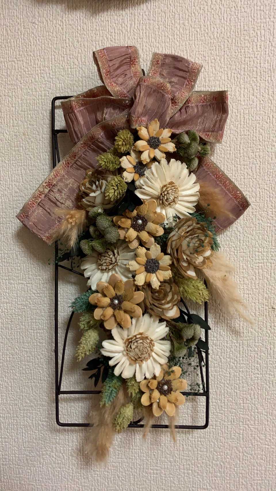 いろんなドライの植物を、使いました。大きな花は、ソーラーフラワーと言って、ソラという木の皮を薄くむいて乾燥させたものを、花の形にしたものです。今回のお花は2種類入っていますよ。それから種(カボチャ、ゴーヤ、メロン)の花も入れています。それから、よく見るドライフラワーです(カスミソウ、ユーカリ、ボアプランツ、他)。ツオップの形にして、今回は黒いワイヤーの土台に付けました。いろんな土台に付けるのもいいですね。🎵