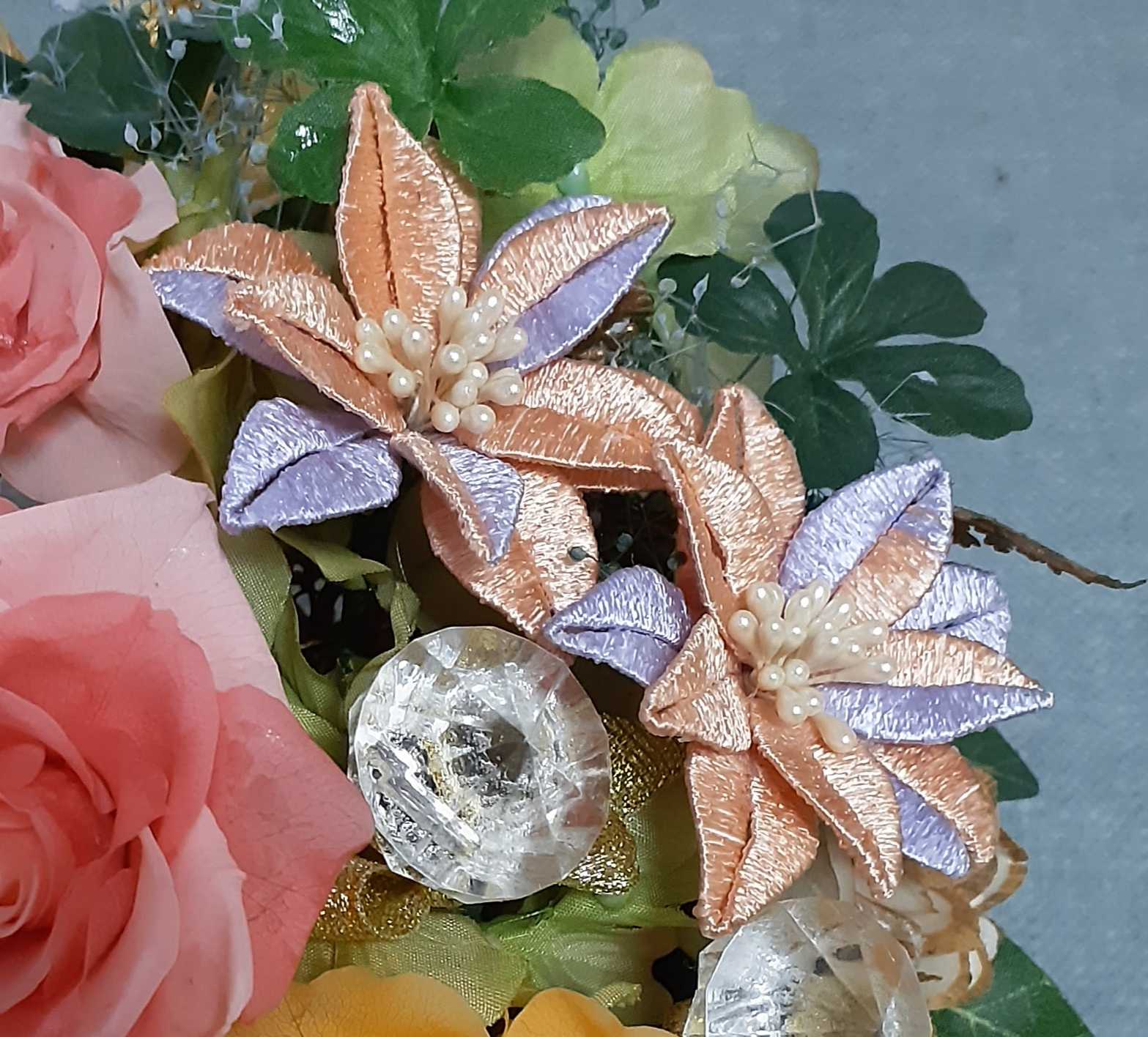 ゆっくりでいいですよ。と言うことだっので、頑張って、私の大好きだけど、大変な糸の花を作って入れましたよ。プリザーブドバラと、正面にちょと小さめの花を3輪と、上の方には、大きめの2輪の花。色合いもちゃんとバラに合わせて、優しい感じで作りました。