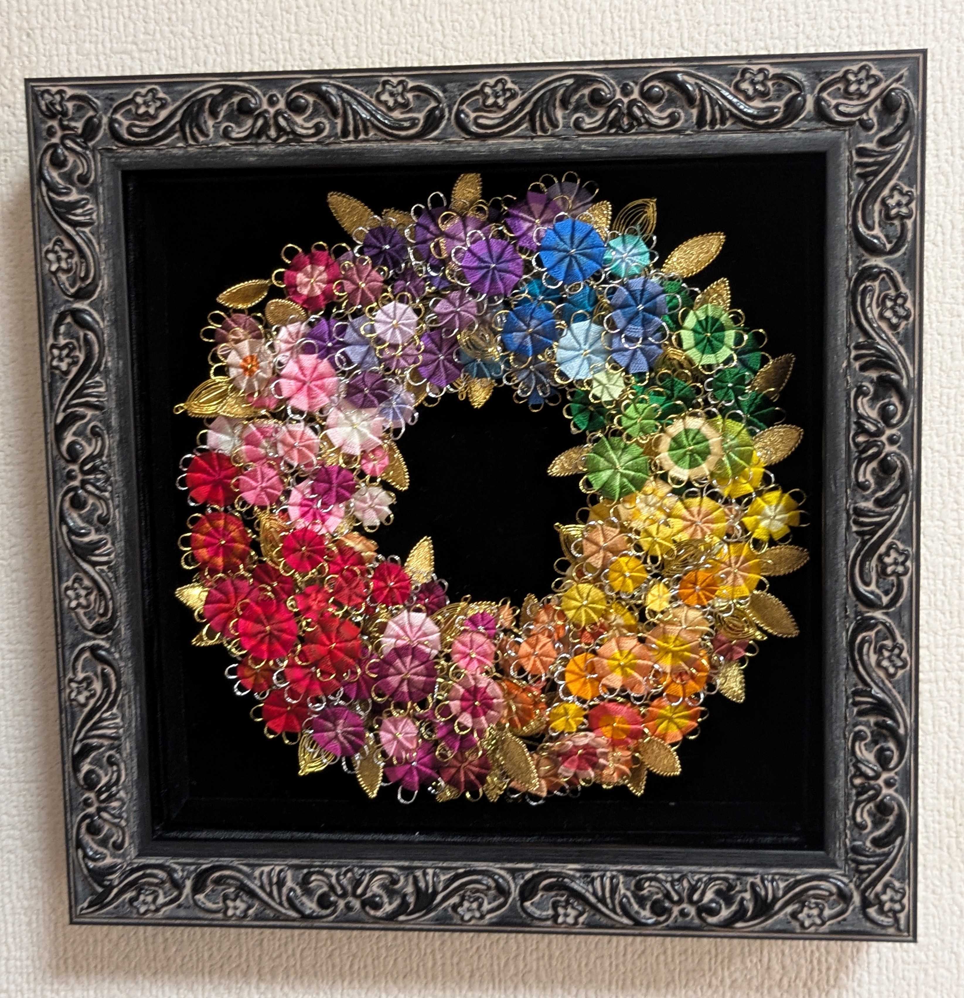 9月のレッスンの作品です。糸の作品です。紙で作るクイリング生花で作ったリース
