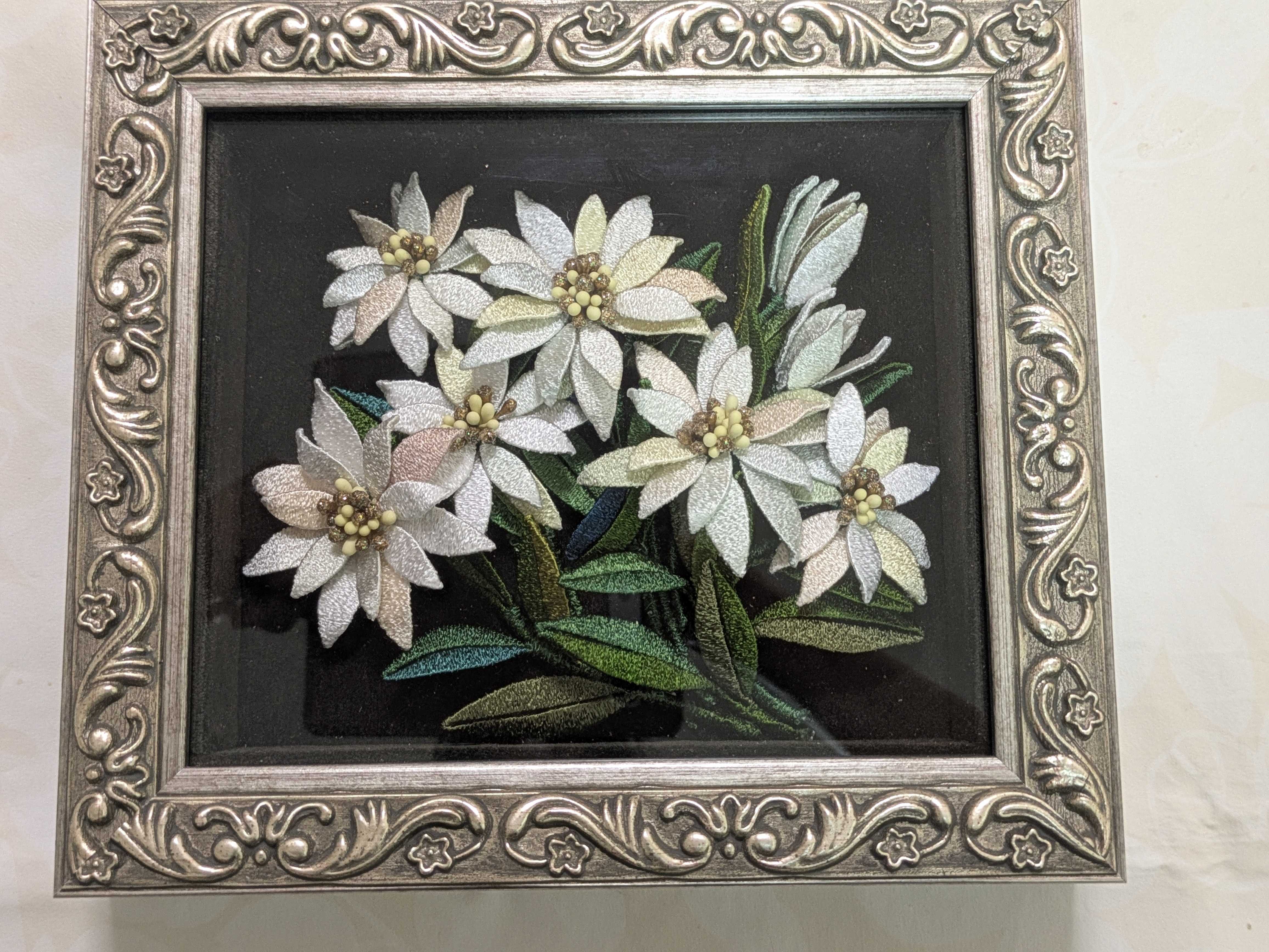 柔いワイヤーで枠を作って、それに糸を巻いて作るお花を作りました。今回は白のエーデルワイスのお花です。ちょと前からお家でパーツをを作ってきて、やっとできましたね。額も銀色系でバッチリです⭕