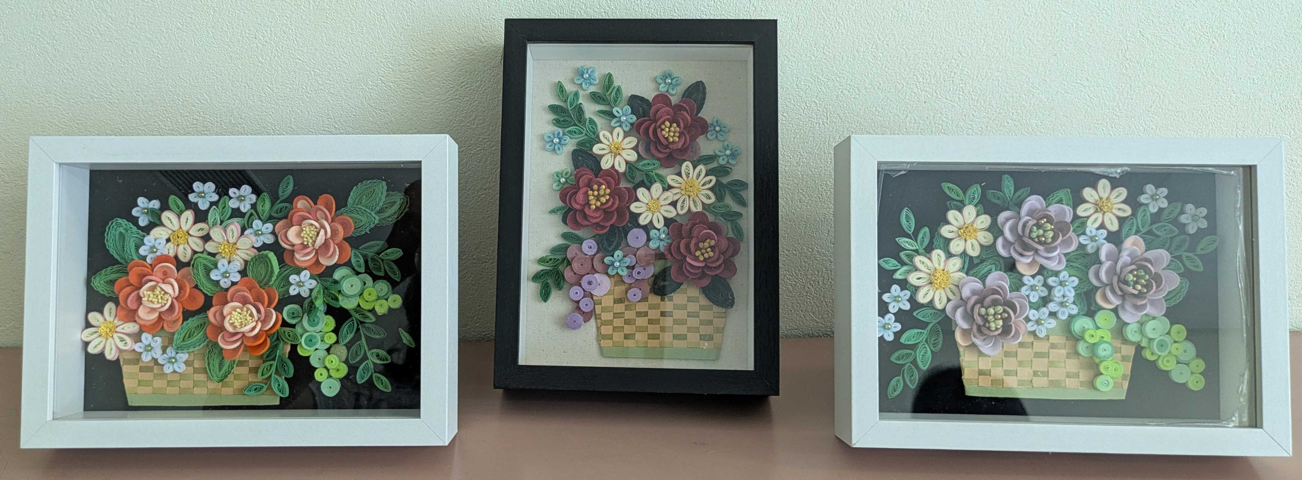 残暑見舞い申し上げますまだまだ熱い🔥位の暑さですネ。皆さん無理しないでクーラーを付けて、水分はちゃんと取って下さい。今月のフラワーレッスンは額縁に入れたクイリングのアレンジを作りました。可愛いカゴもクイリングペーパーで作りましたよ。皆さん花の色がいろいろで、それに合わせて額やバックの色も変えています。それぞれの作品が出来きました🤗