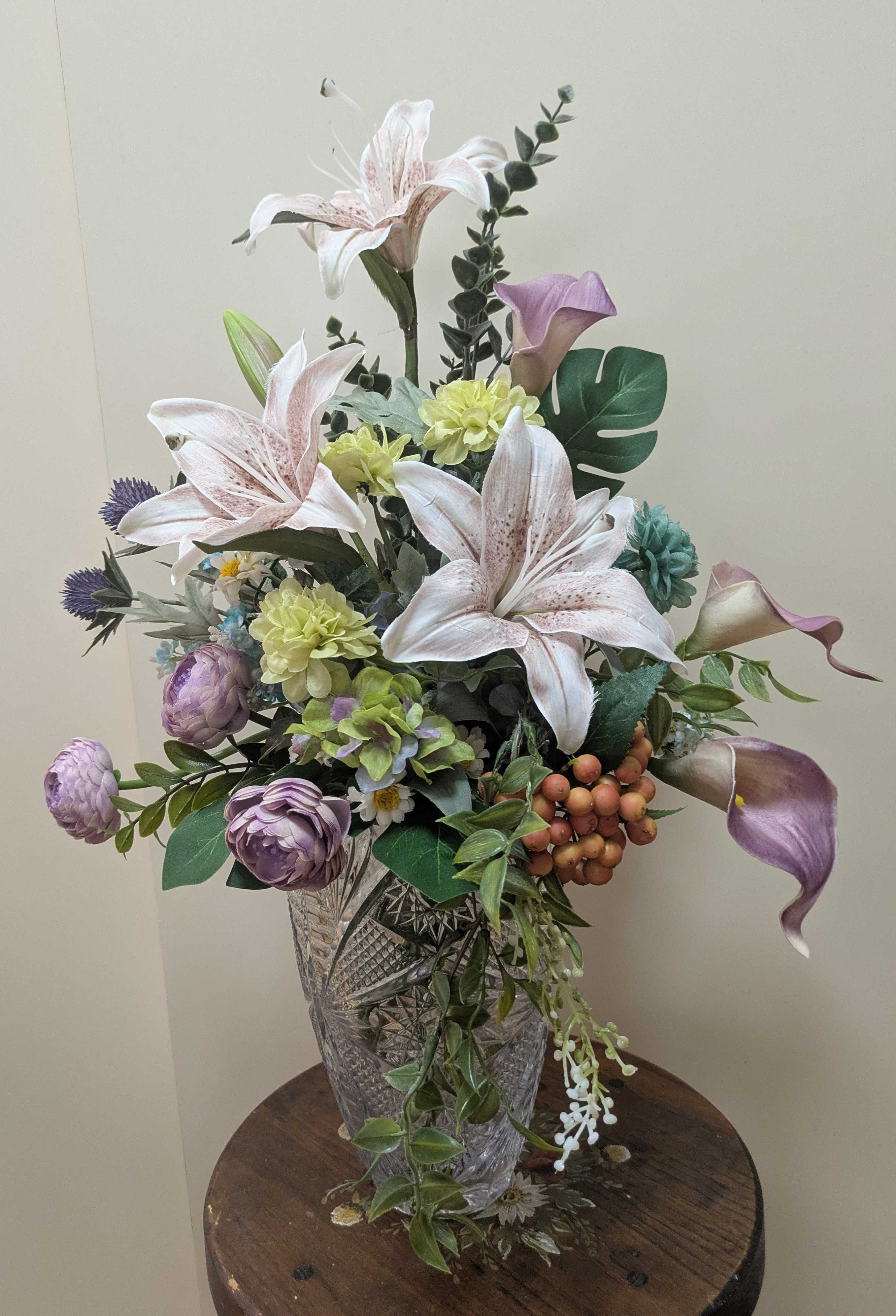 暑中御見舞申し上げます😥😓めちゃくちゃ暑いですね。皆さま大丈夫ですか?生花はすぐ悪くなって大変でしょうネ。それにもうすぐお盆だしネ。だから今月のレッスンは造花で花束を作りましたよ。材料ユリ、カラー、ラナンキュラスはちょと紫がかったピンク。濃い紫はエリンジューム。薄いグリーンと青のマム。黄色の実はビバーナム。グリーンにちょと赤が入ったアジサイ。それから小さなお花は私が作ったワスレナグサとマーガレットです。それからグリーンもいろいろ入っています。全体に渋い感じだし、優しいがでていますネ。この暑さでは強い花より良いかもしれませんね。 夏らしくガラスの器がいますが、濃いワイン色の器も合いました。花束だから、器を変えたら感じ変わって楽しいですよ。