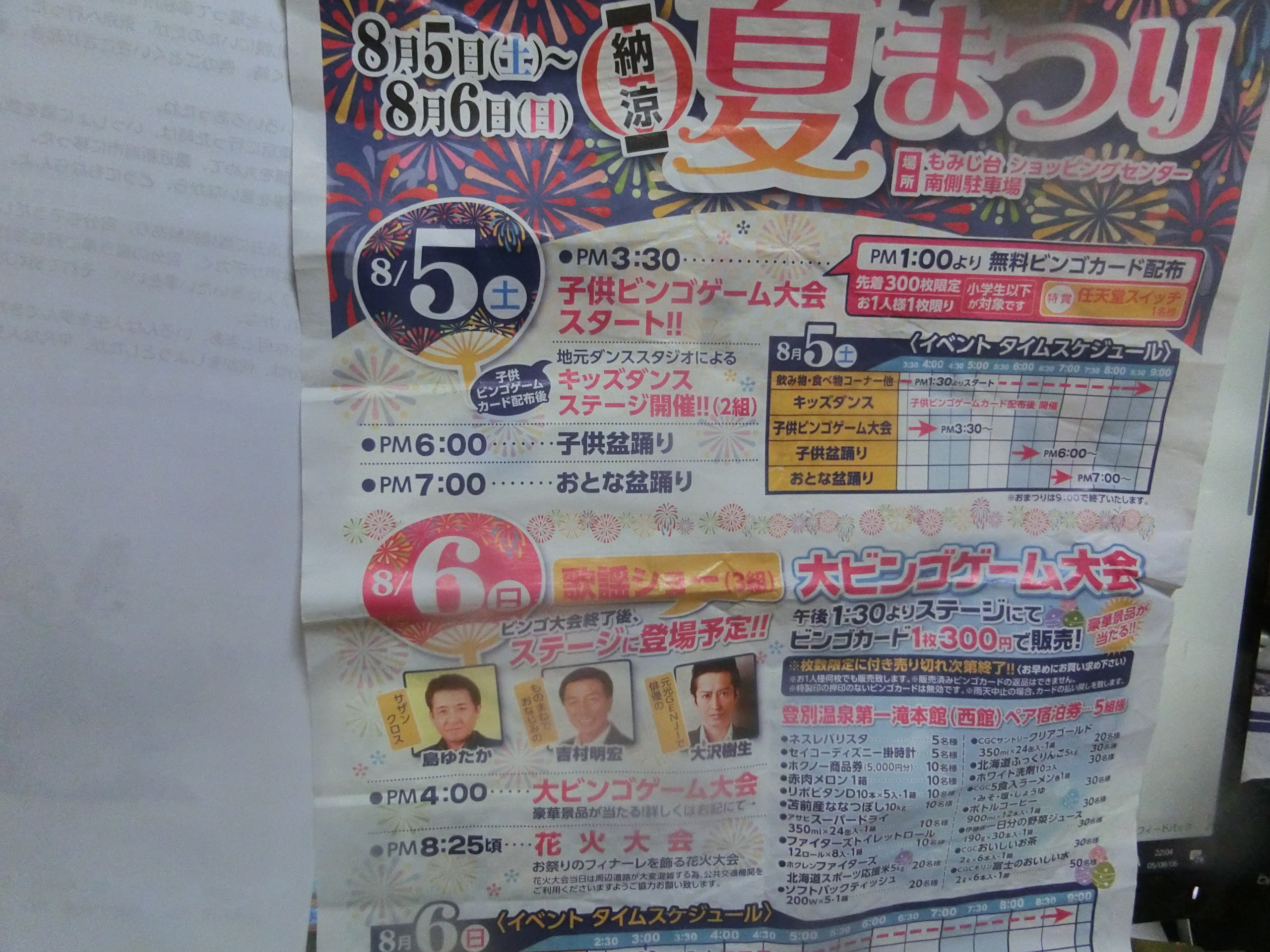 第44回もみじ台夏まつりしばらく3回を除いて、もみじ台のお祭りが始まった。そのお祭りが、自分にとってはその半分に、自分は1度も除いていない。8月5日から6日に掛けて、小雨が降る中で何にも無くなっていい日だった。ざっと、3千人ぐらいの人が集まった。自分も相棒と、きのうきょうといっしょに酒を飲んでいた。ときたま、小雨が降るの中で祭りが始めていった。きのう5日の日は、盆踊りをした。ひさしぶりに”北海盆踊り”を踊った。いつものように吉村明宏が司会で、サザンクロスの島ゆたかが歌った。元光GENJIの大沢樹生が出て来る時は、凄い頃になった。自分は、大沢樹生は名前は知っていたが、どういう人物が知らなかった。すごい人だった。午後8時25分に花火を打ち上げられた。わずか12分の出来事だった。だけど、何だか涙が出そうになった。きのうは盆踊りで、きょうは歌謡ショーと花火大会で盛り上がった。いい夏の日の思い出だった。どういう訳か、もみじ台のお祭りに芸能人が集まるのか。主催者のスーパーホクノー社長が、吉村明宏を知っているのだろうかな。そんな事があっても、明日はいつものようにシ-ンとするのだろうな。