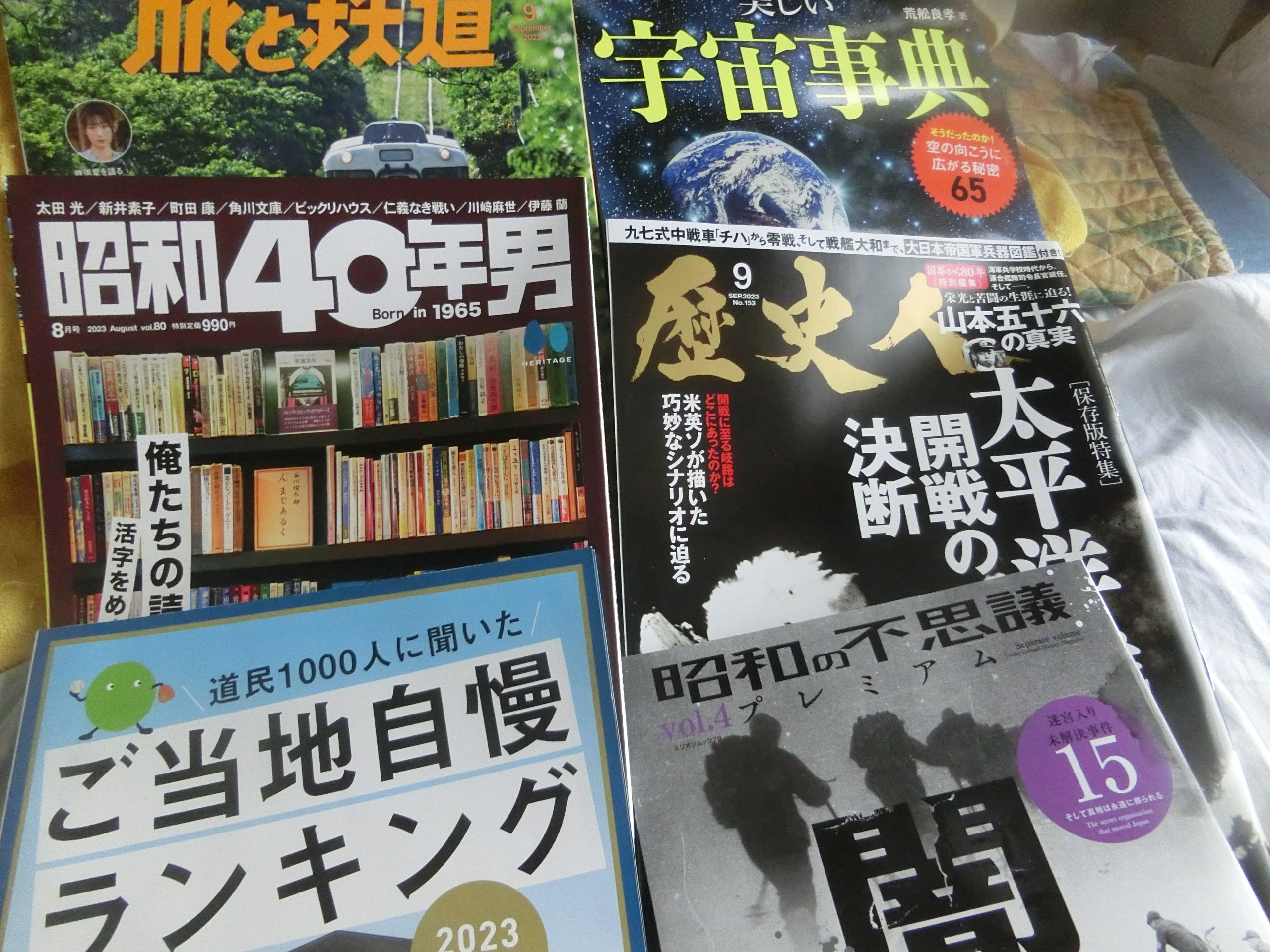 今、読んでいる本(その21)紀伊國屋書店 札幌厚別店(新刊)「旅と鉄道」9月号(サイハテの鉄道旅) 「美しい宇宙事典」 「昭和40年男」8月号(俺たちの読書史) 「歴史人」9月号(太平洋戦争 開戦の決断) おまけの「ご当地自慢ランキング」 「昭和の不思議」VOL.4(闇に消えた真犯人)BookOff 札幌南2条店(古本)安くて、1冊110円「犯罪捜査と裁判 基礎知識」「私は真犯人を知っている」「津山三十人殺し」「消された一家」「日本人はなぜ戦争へと向かったのか」「累犯障害者」「被差別部落と青春」「やってみたら、こうだった」「中国人の本性」「五輪書」「戦国の反逆・謀叛の秘密」「猫のいる日々」「手塚治虫物語」「増上寺刃傷」「狐狸庵閑談」「しあわせになる禅」文教堂 厚別店 (新刊)「老いる意味」「老いの正体」「男はつらいよ」DVDコレクション「男はつらいよ」のDVDは、全50冊のうち35冊は持っている。590円で、もう買わない。